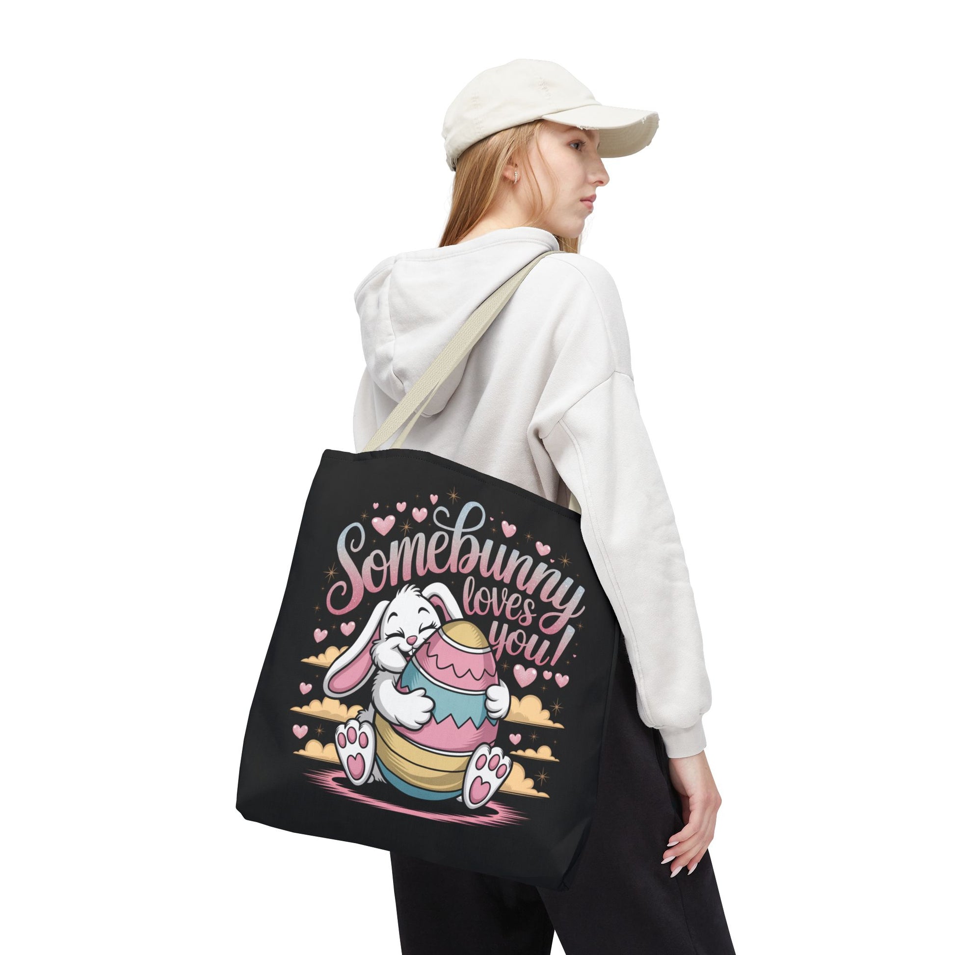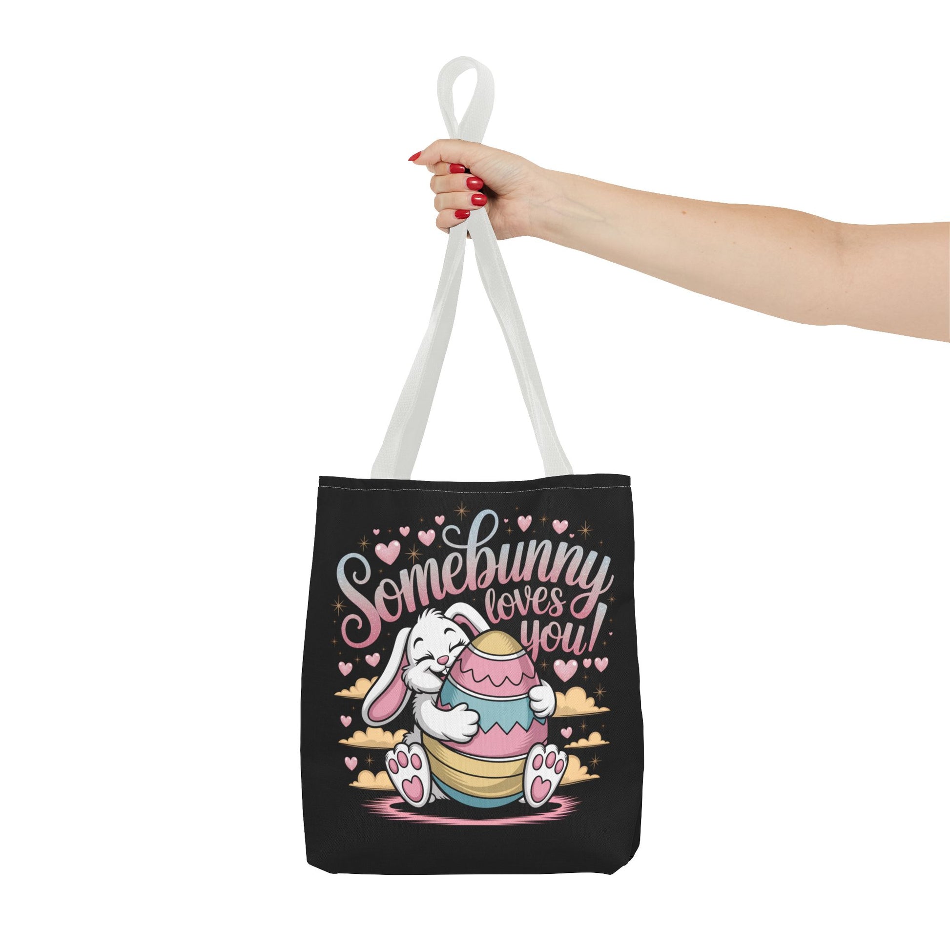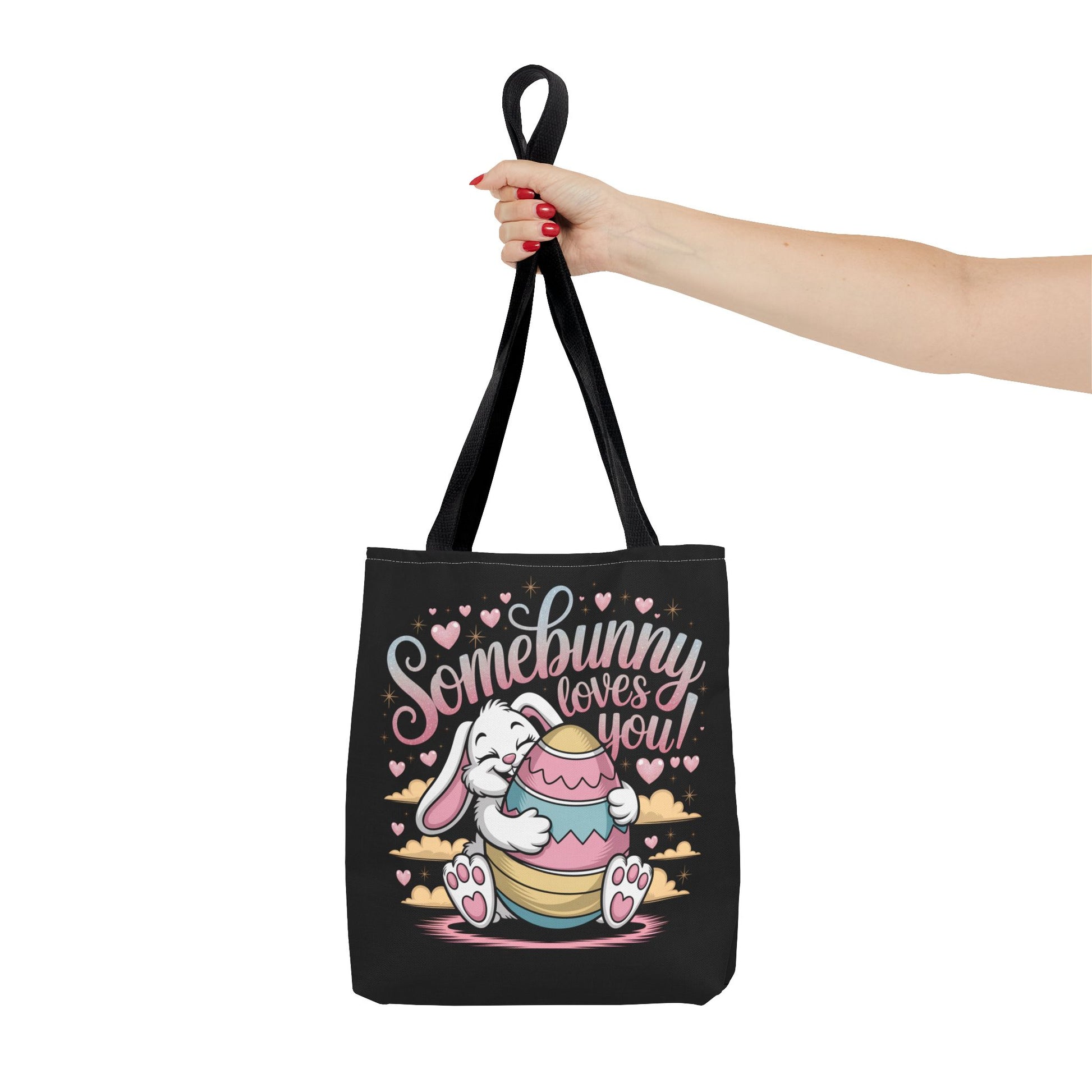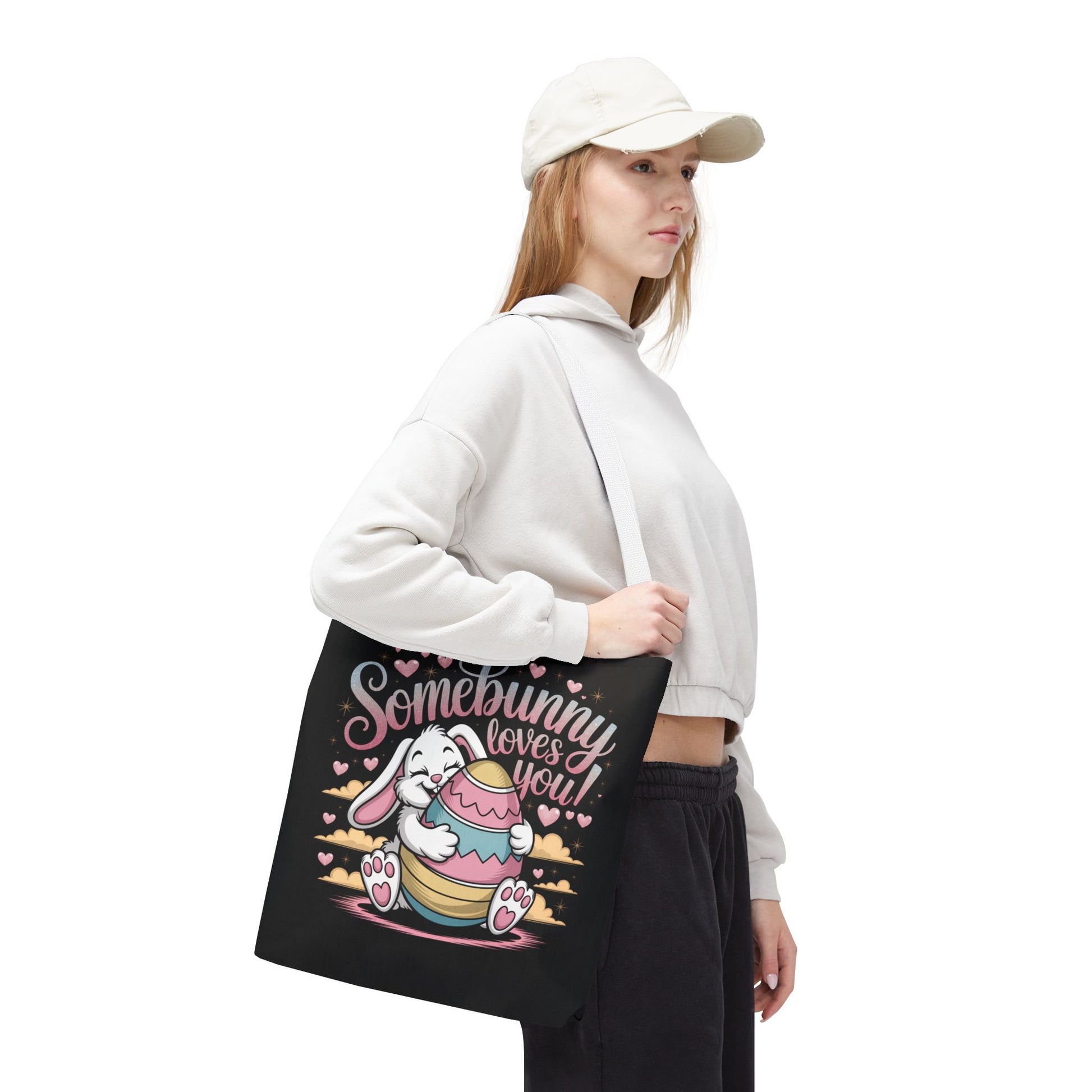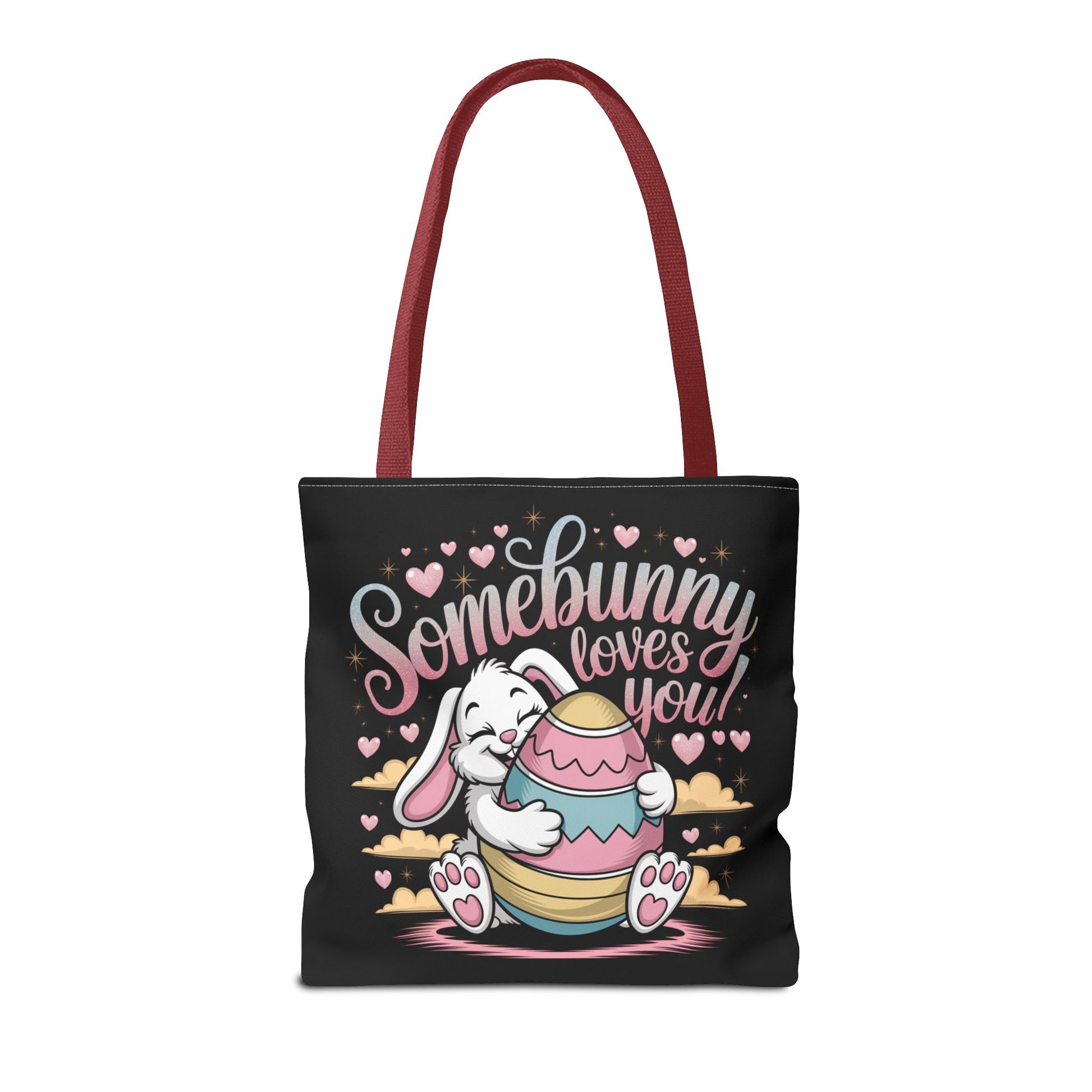A fun tote bag featuring the Easter Bunny with the phrase 'Somebunny Loves you'. Perfect for Easter celebrations and to spread some love. Ideal for those who love cute and festive accessories.