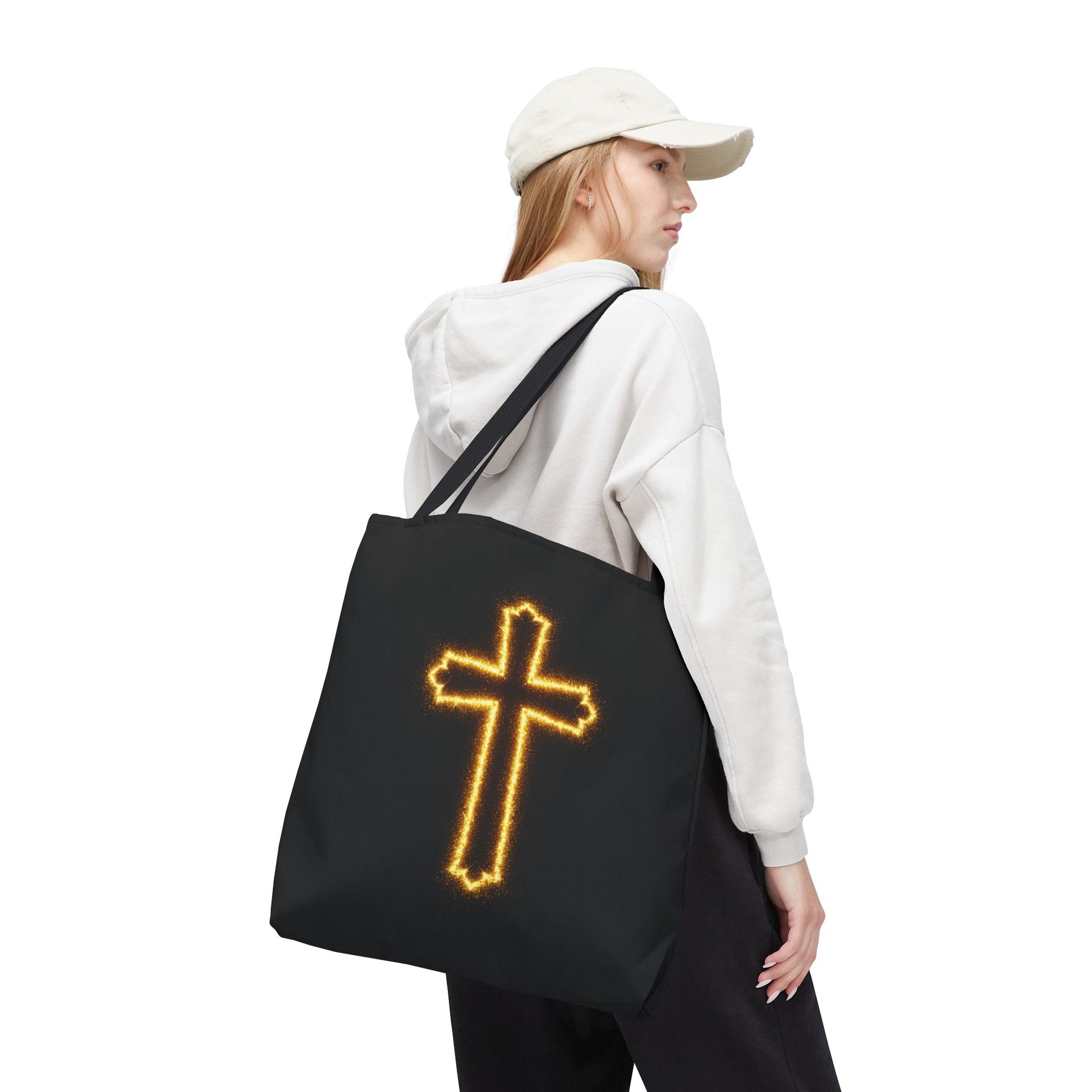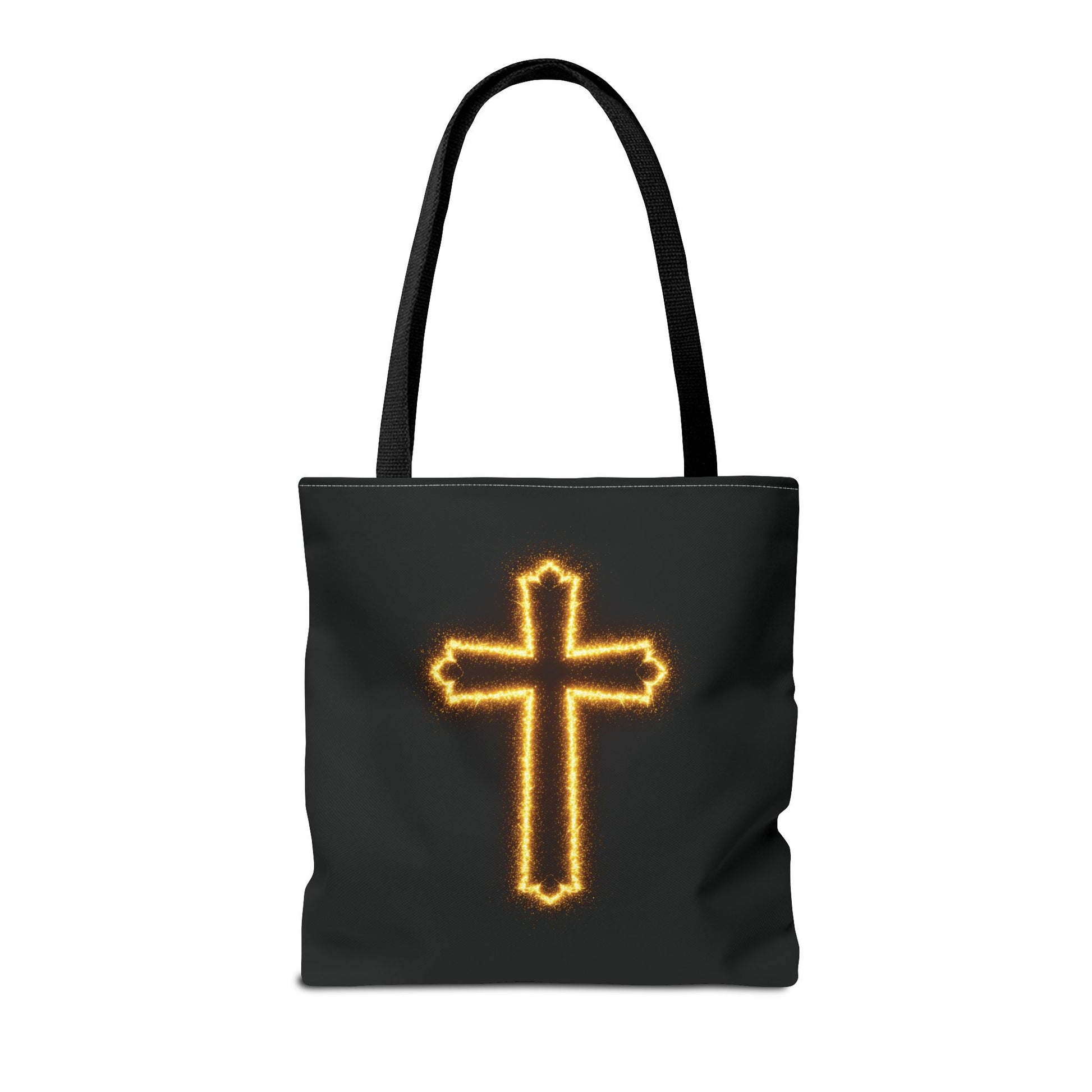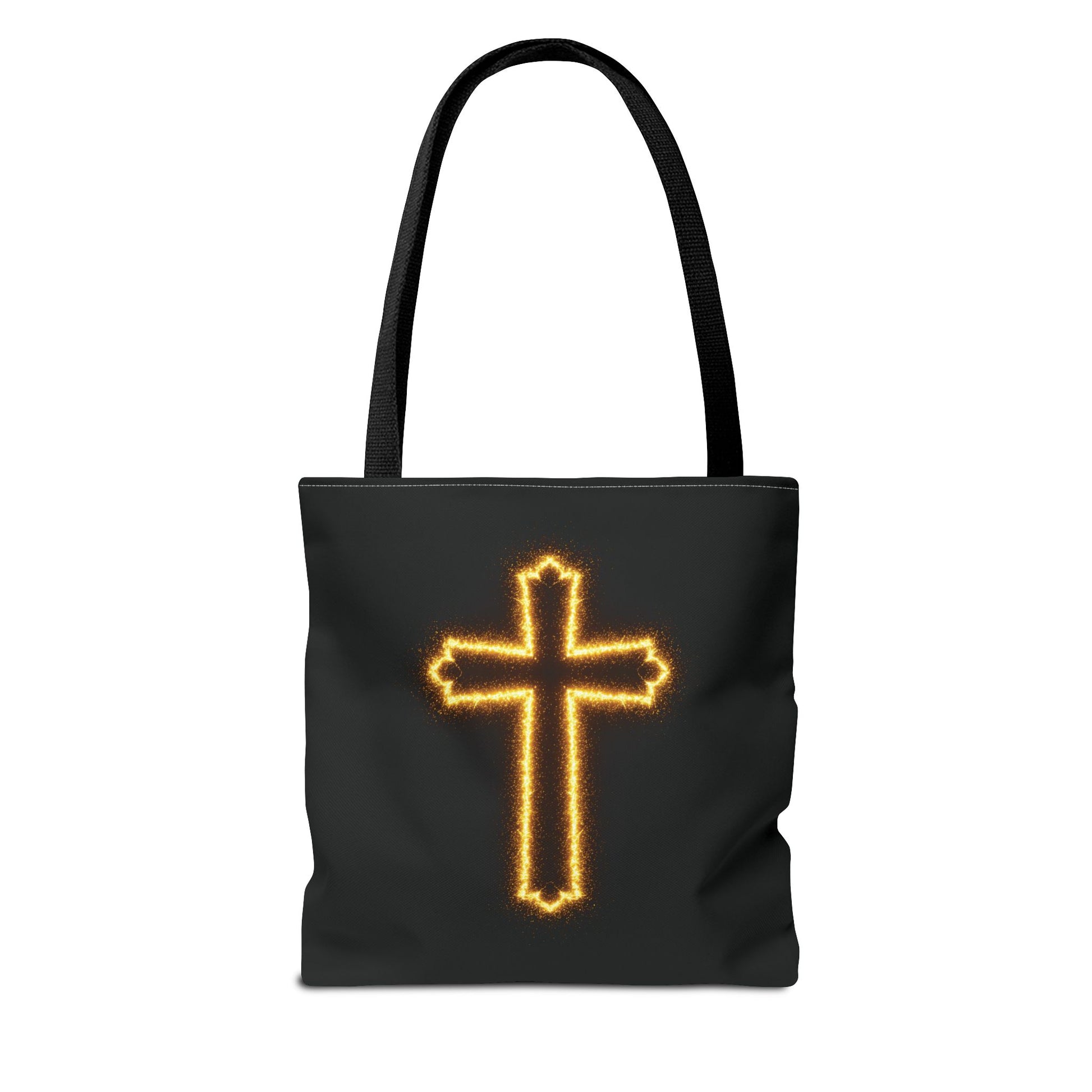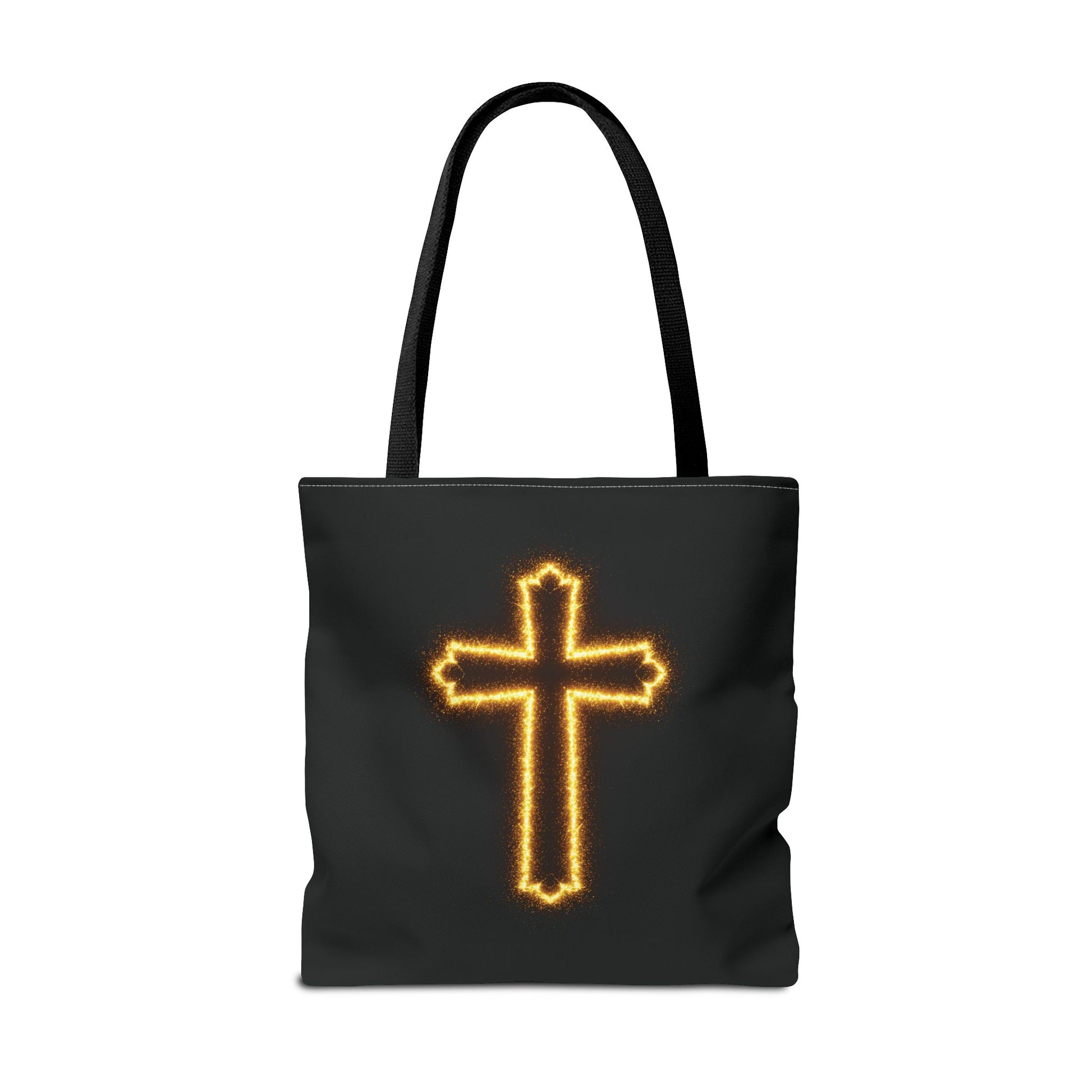 Carry your faith boldly with this powerful Christian tote bag featuring a radiant, glowing cross on a sleek black canvas background.