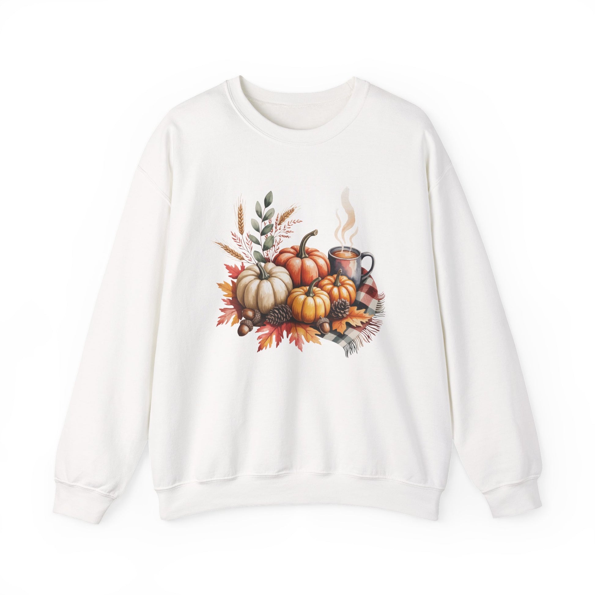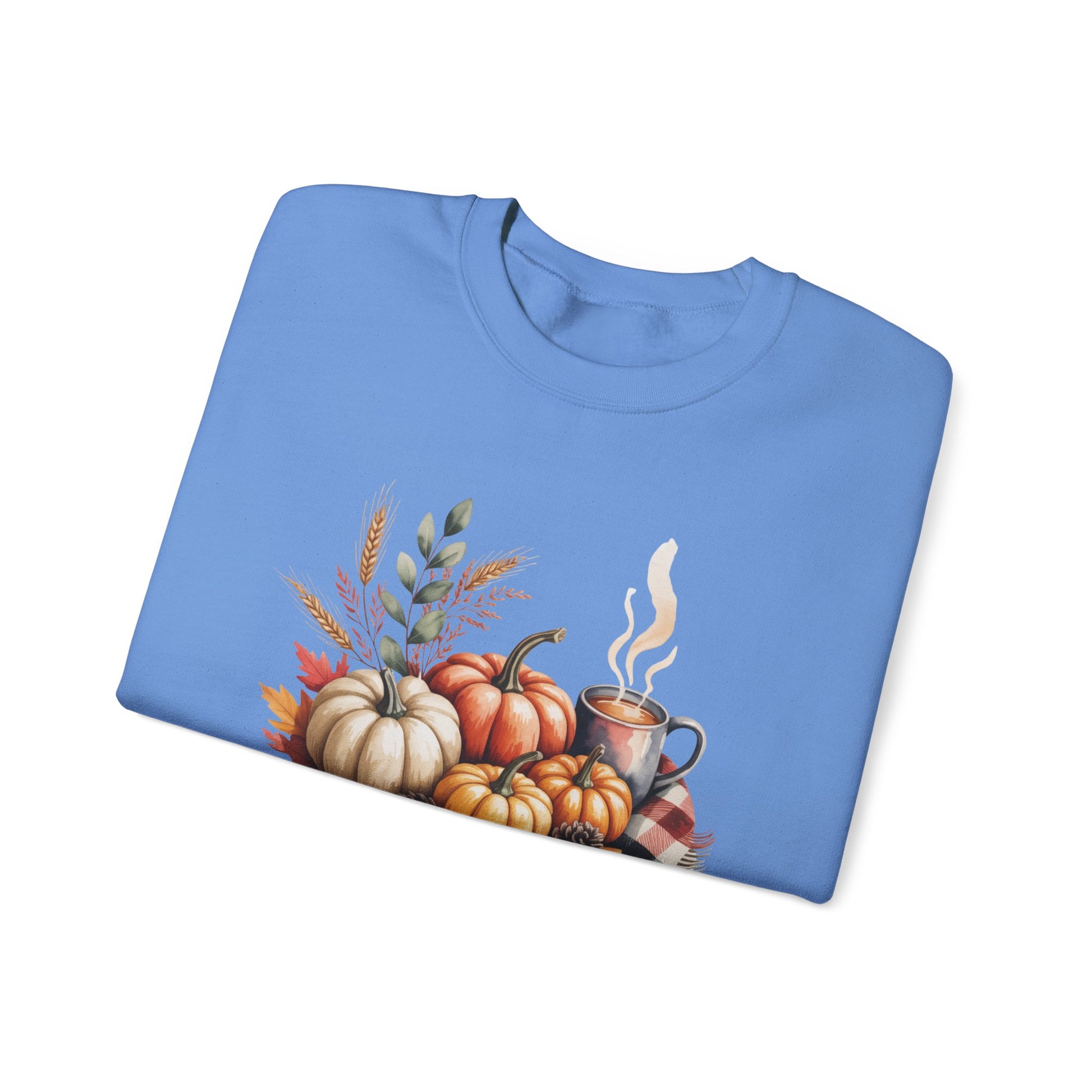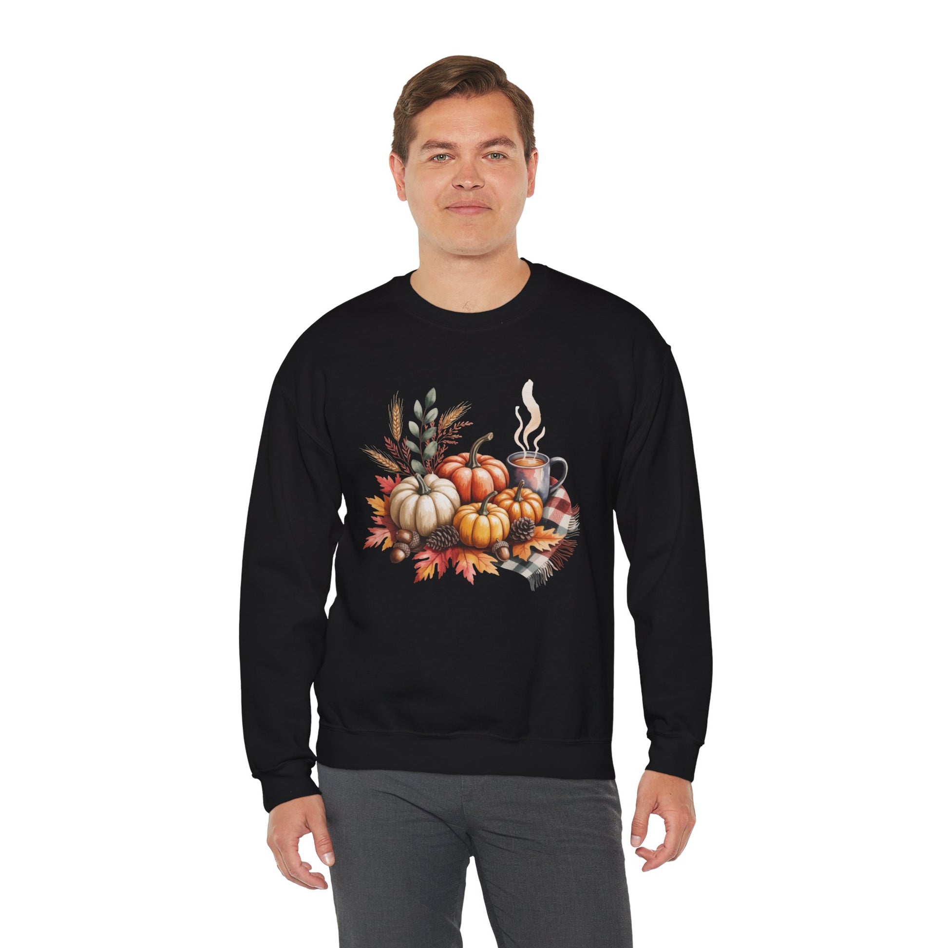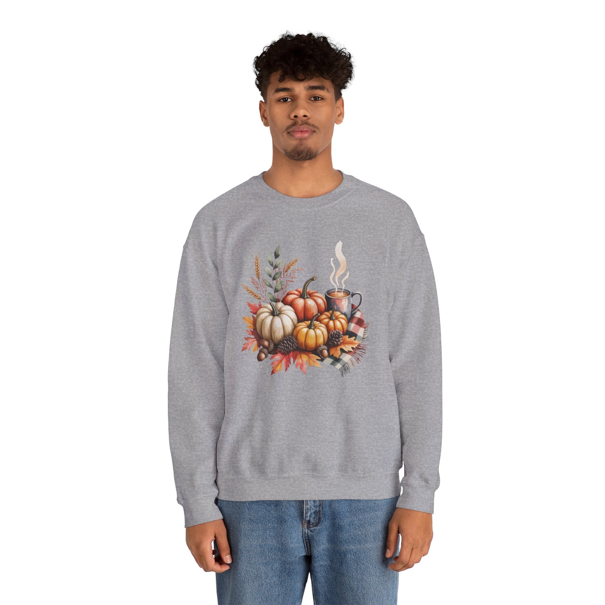Celebrate cozy fall moments with this Fall Pumpkin Sweatshirt, featuring a warm autumn scene of pumpkins, fall leaves, pinecones, and a steaming cup of coffee or cocoa. This comfy, stylish crewneck captures the essence of harvest season and cozy gatherings.