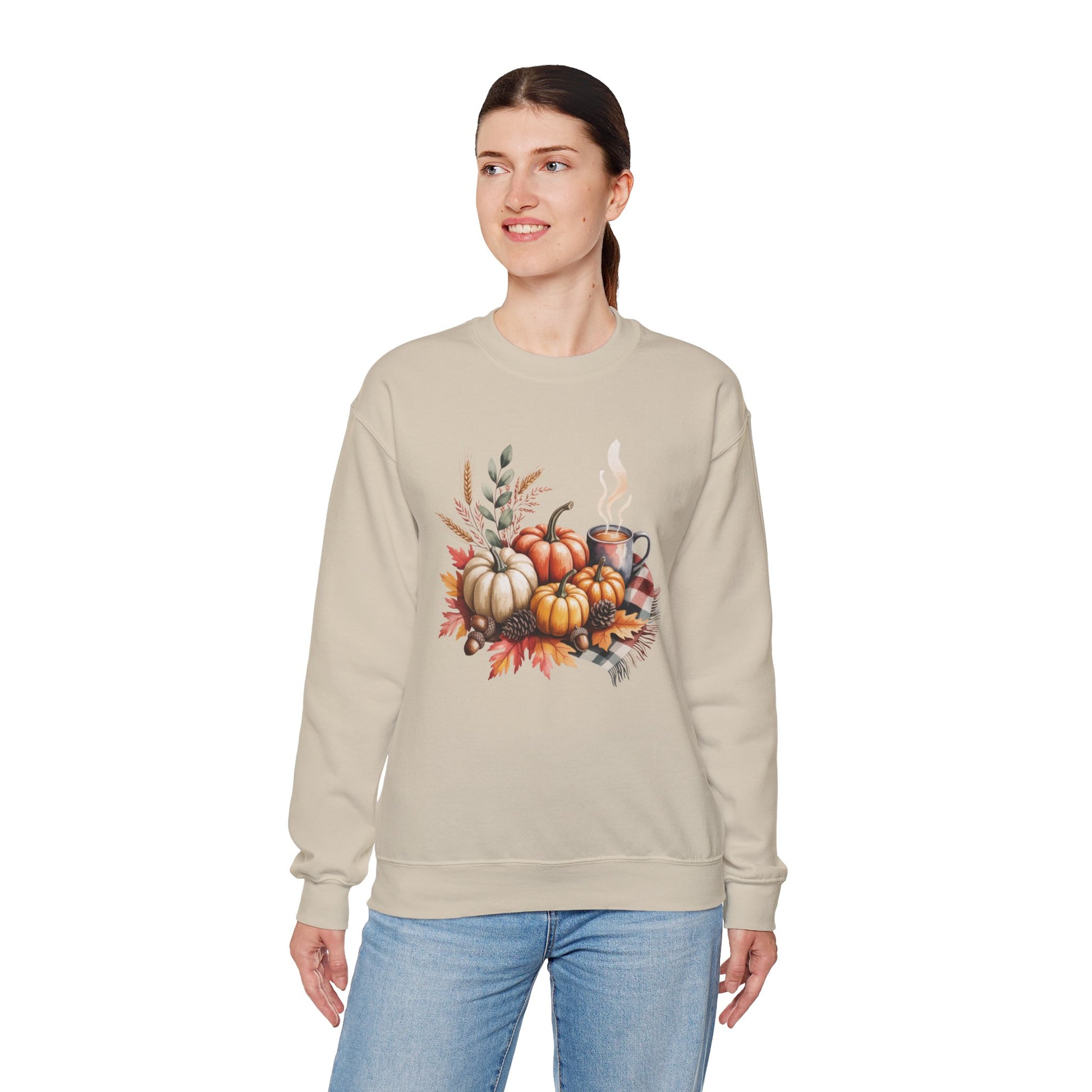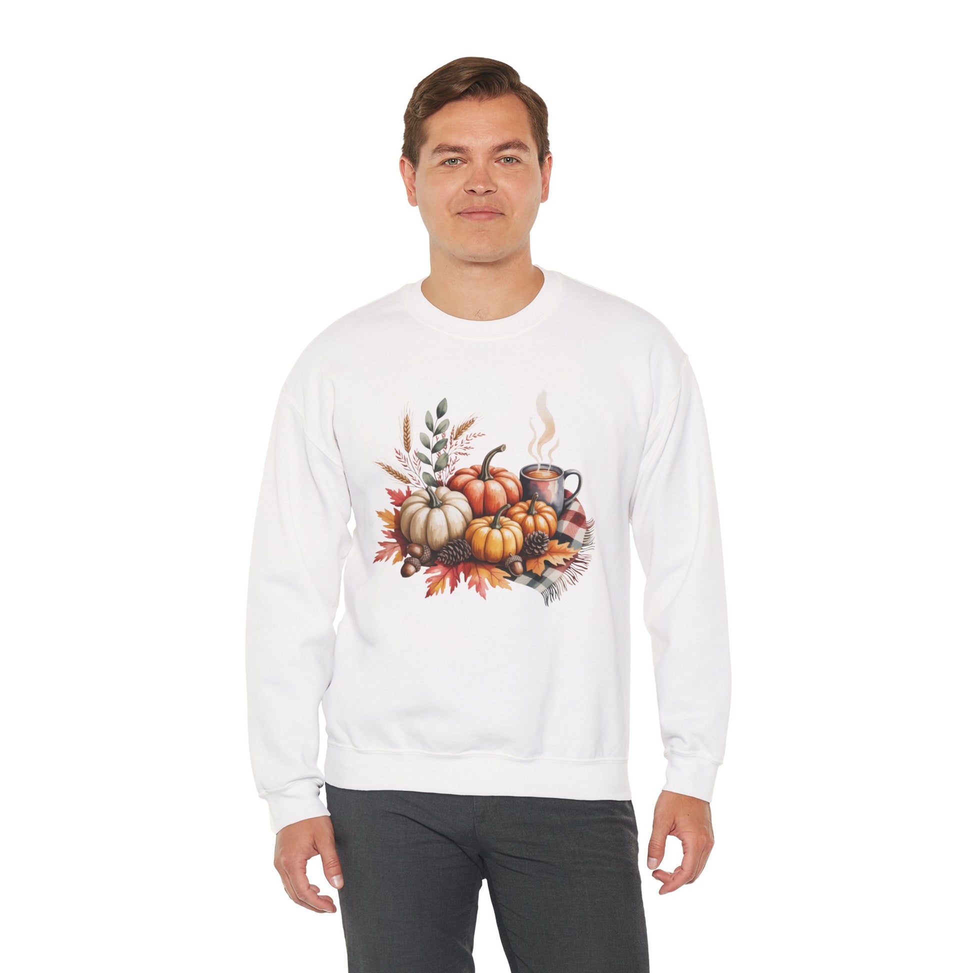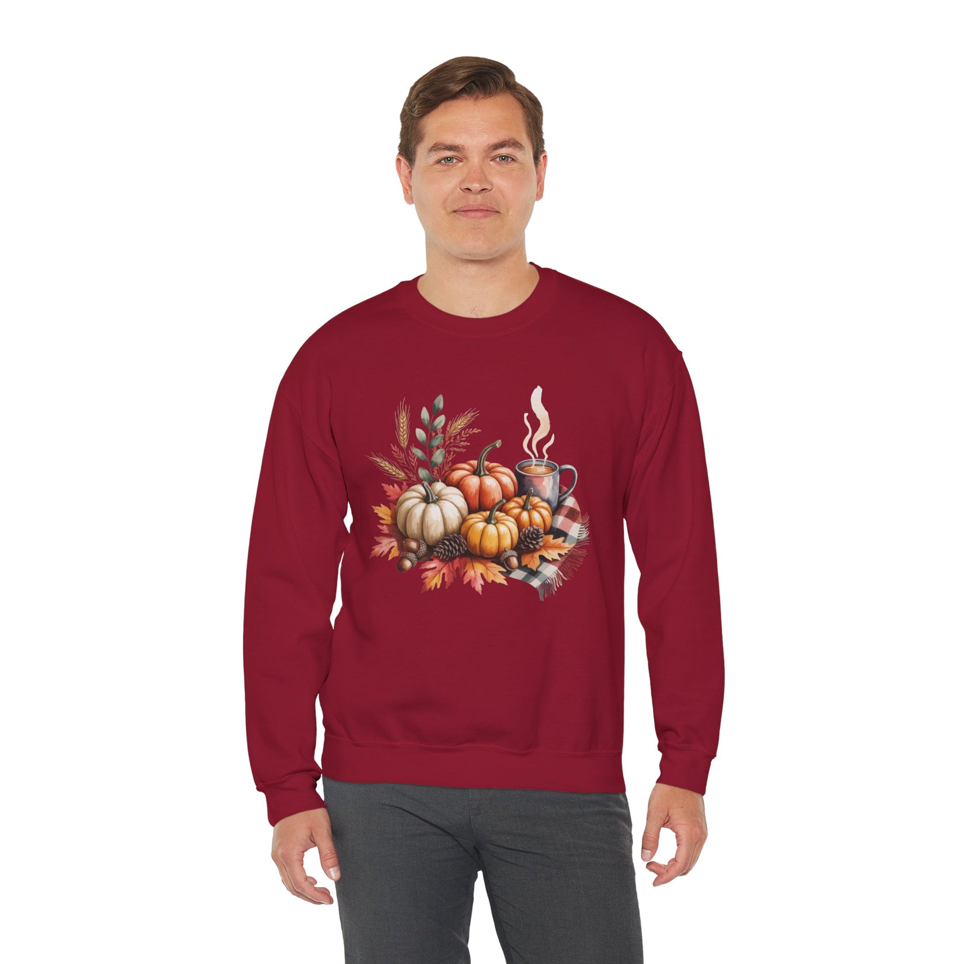 Celebrate cozy fall moments with this Fall Pumpkin Sweatshirt, featuring a warm autumn scene of pumpkins, fall leaves, pinecones, and a steaming cup of coffee or cocoa. This comfy, stylish crewneck captures the essence of harvest season and cozy gatherings.