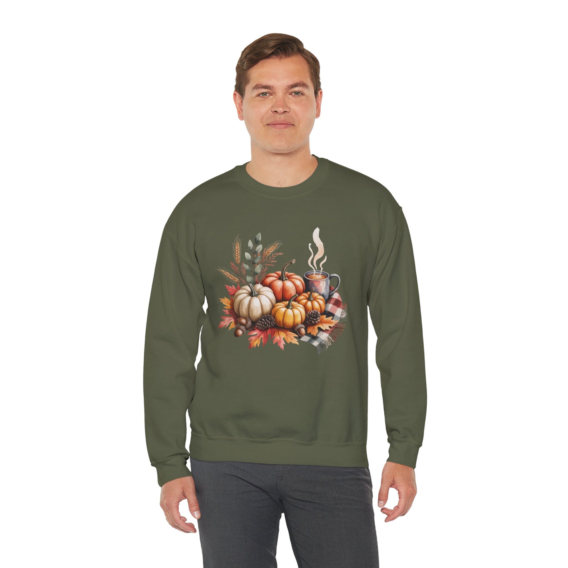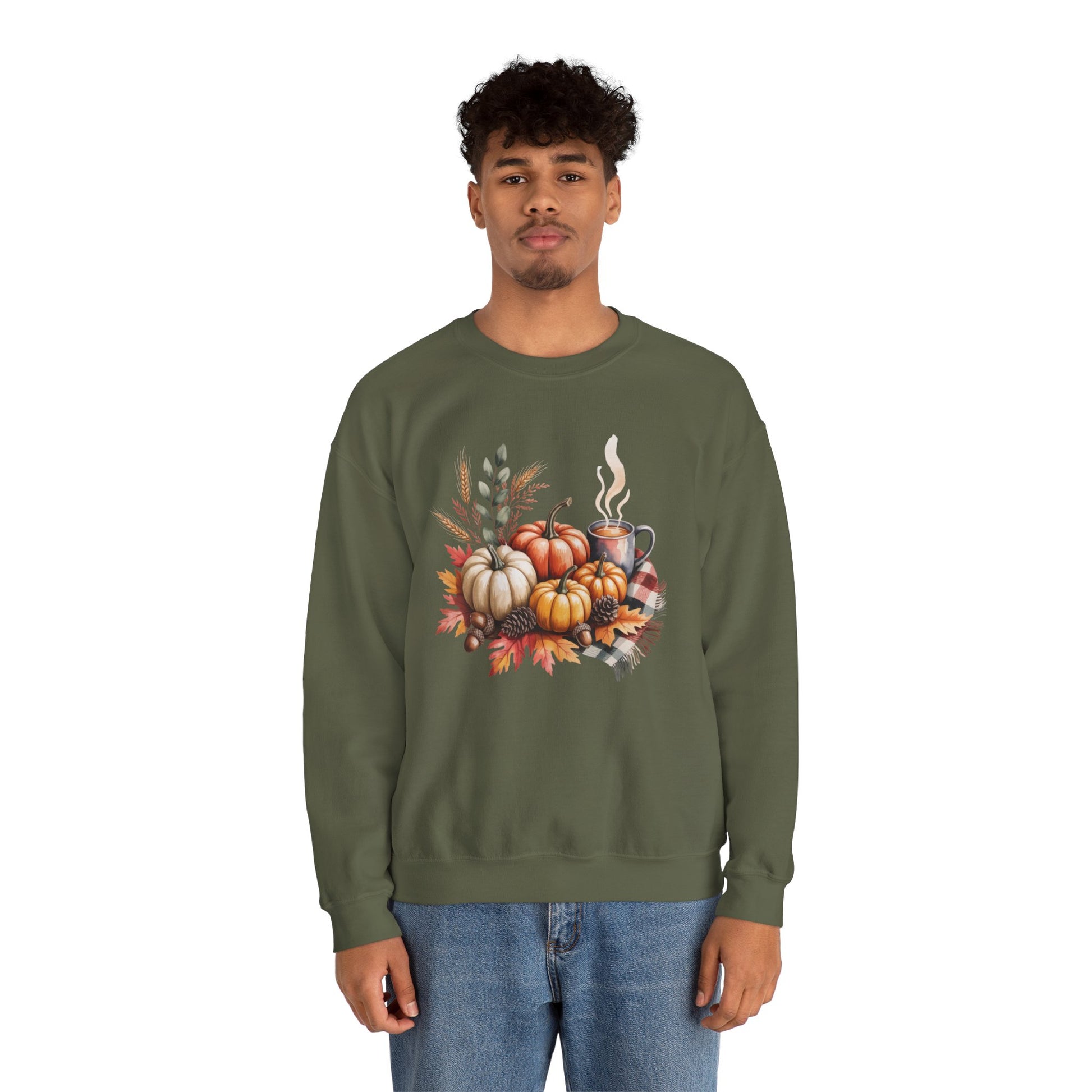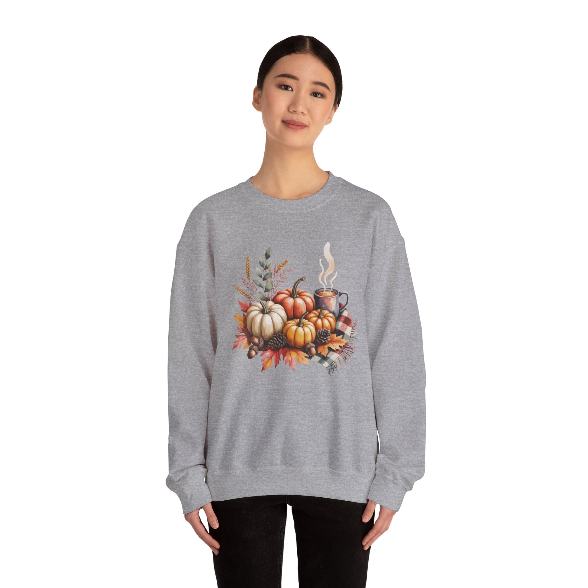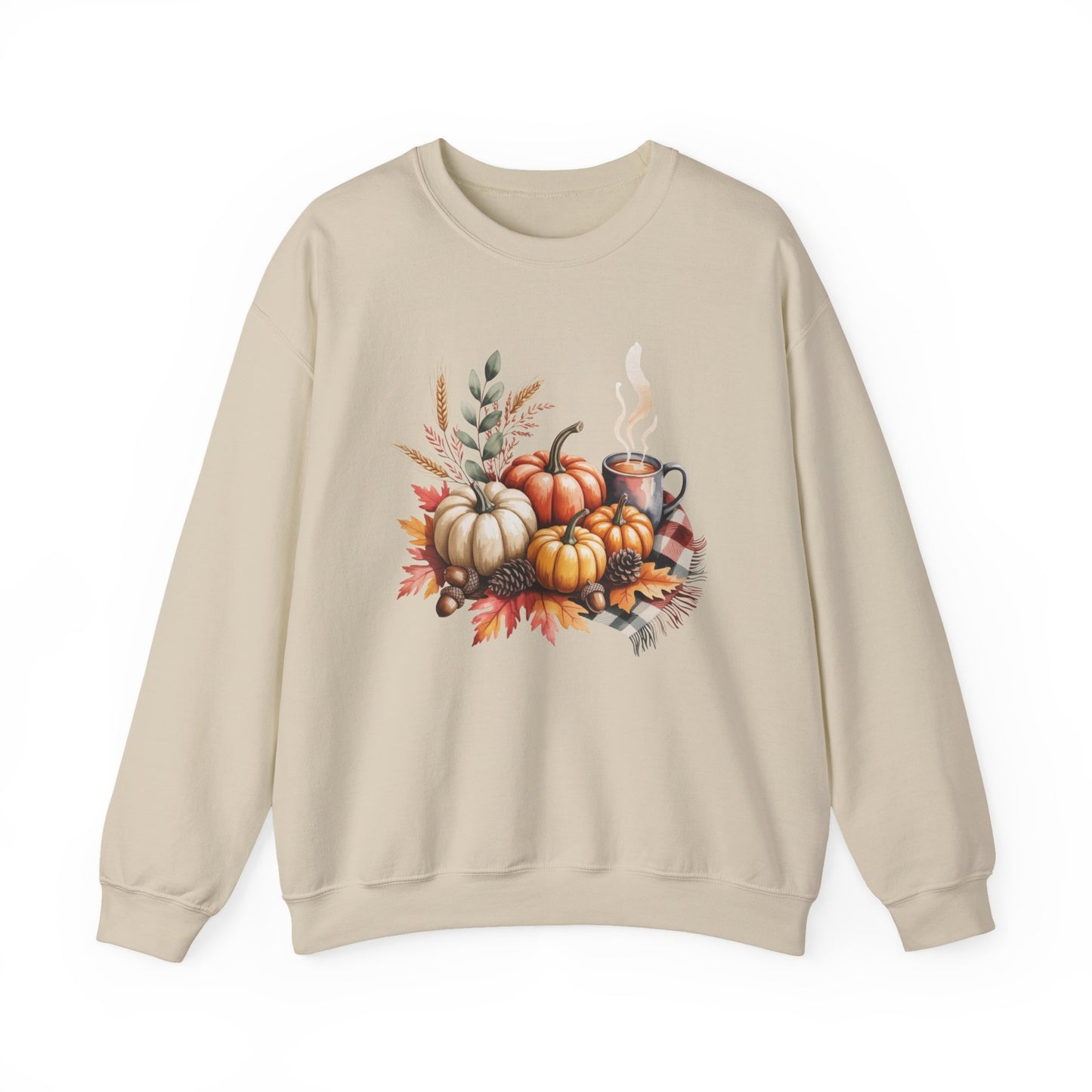 Celebrate cozy fall moments with this Fall Pumpkin Sweatshirt, featuring a warm autumn scene of pumpkins, fall leaves, pinecones, and a steaming cup of coffee or cocoa. This comfy, stylish crewneck captures the essence of harvest season and cozy gatherings.