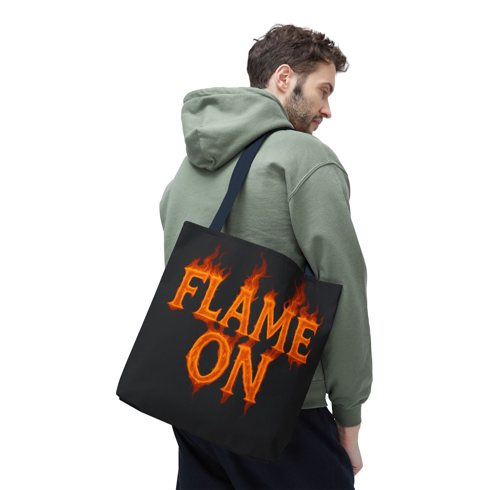 Flame On Tote Bag - Fire Typography Black Bag for Book Lovers, Gym, or Groceries | Bold Comic-Inspired Catchphrase Tote