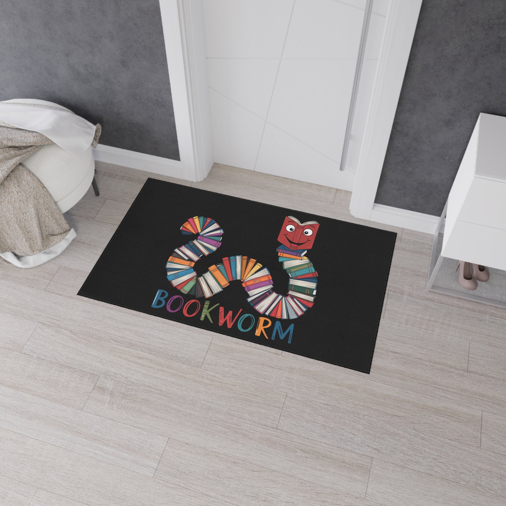 A durable and vibrant floor mat featuring a cute bookworm design, perfect for book lovers to add a touch of whimsy to their space. Ideal for bookworms, librarians, teachers, and anyone who loves to curl up with a good book. Great for home decor, libraries, bookstores, and book-themed events.