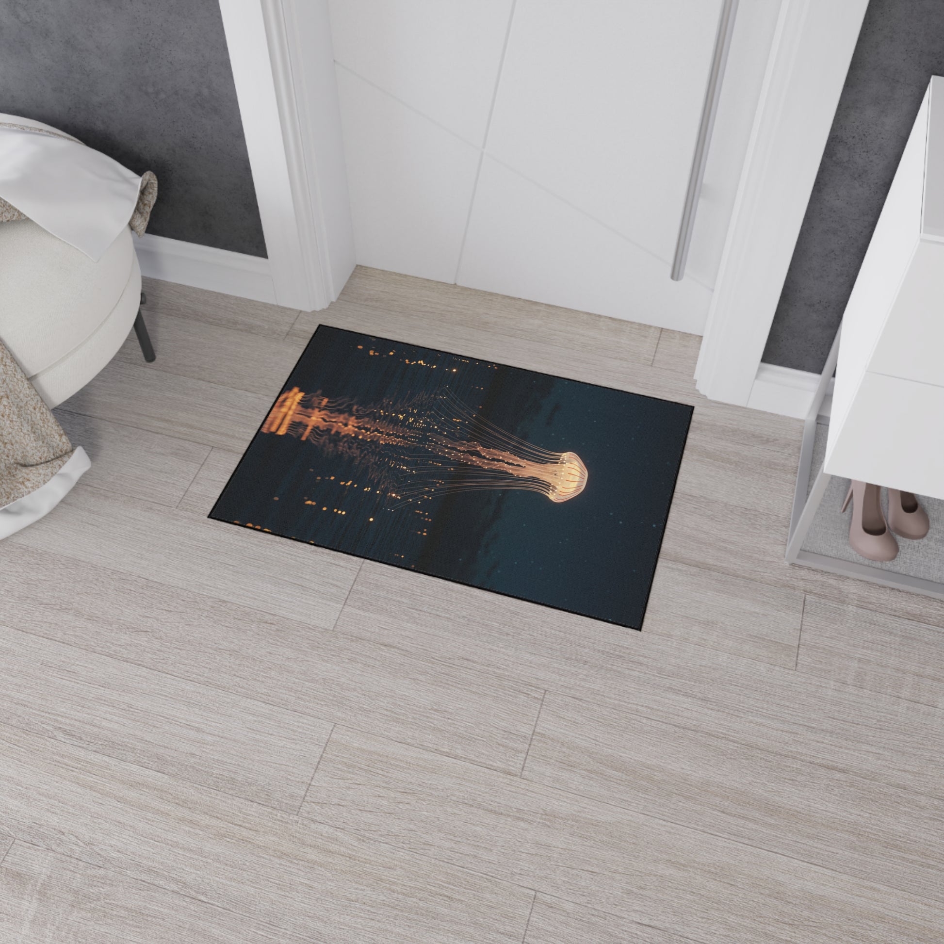 A fun floor mat with a Jellyfish emerging from a lake, vibrant colors and a durable construction. Perfect for adding a unique touch to any room and keeping your floors clean and slip-free. Ideal for nature lovers and those who appreciate quirky designs. Great for adding a pop of color to your home decor, suitable for everyday use or as a special touch during beach house or ocean-inspired decor themes.