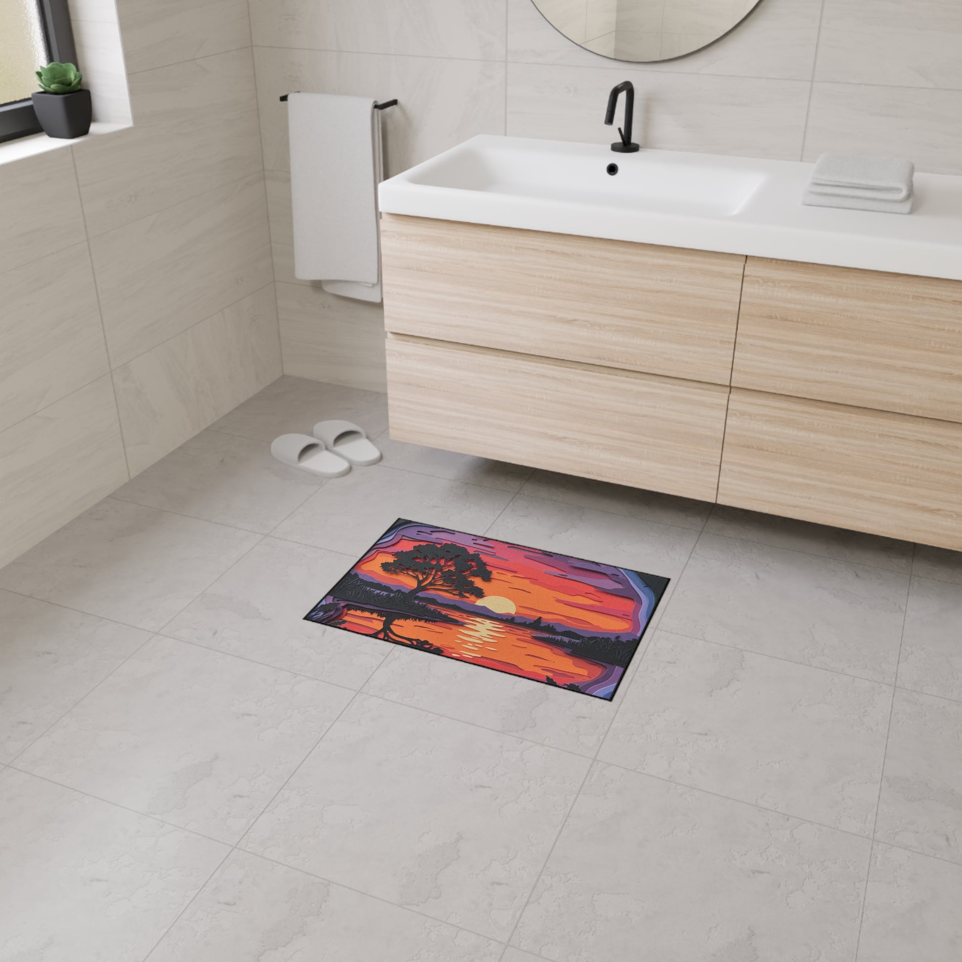 A fun floor mat with a paper art sunset design, adding a playful and lively touch to any room. Perfect for those who appreciate unique and creative home decor. Ideal for beach lovers, nature enthusiasts, and those who enjoy vibrant colors. Great for adding a pop of color to your home during summer and beach-themed parties.