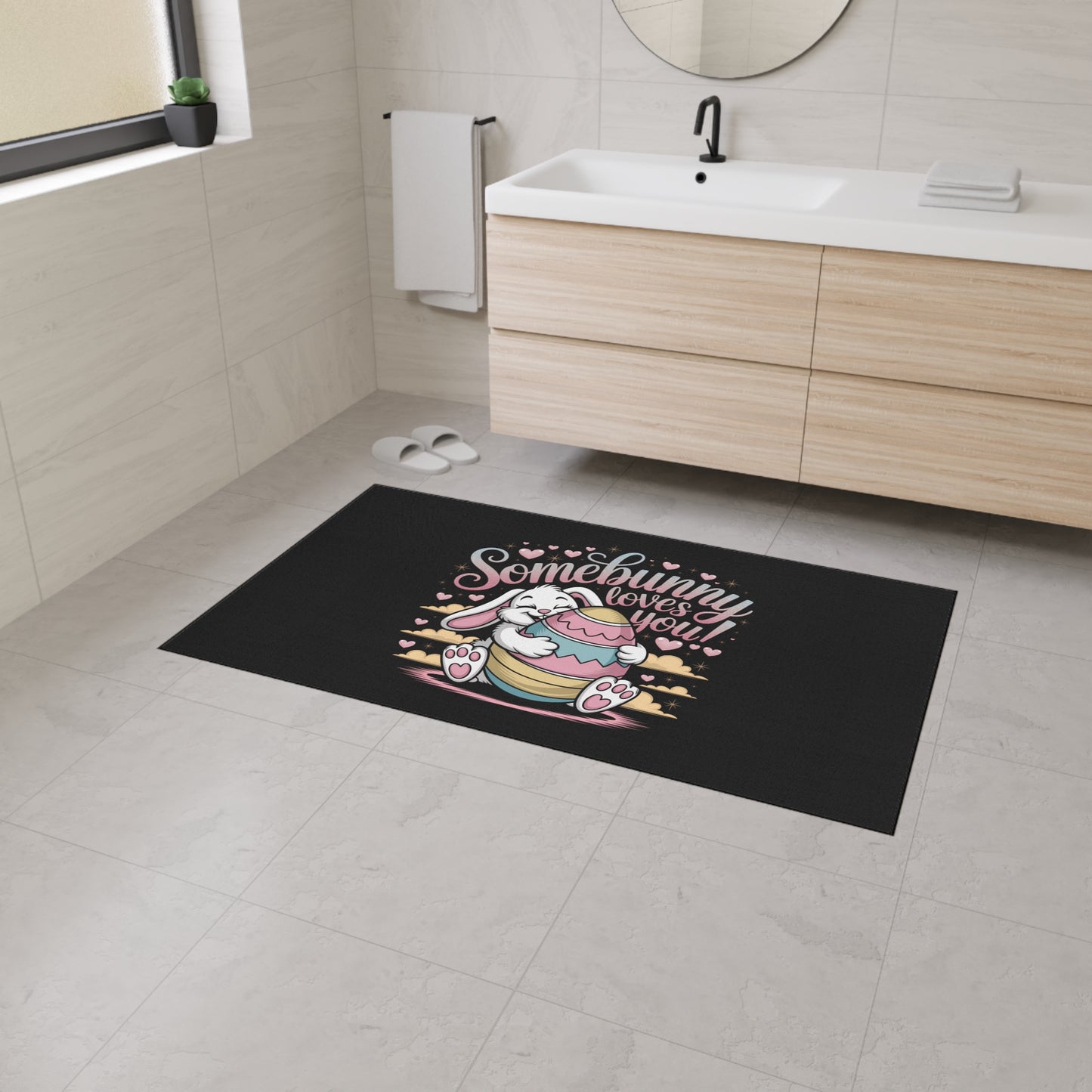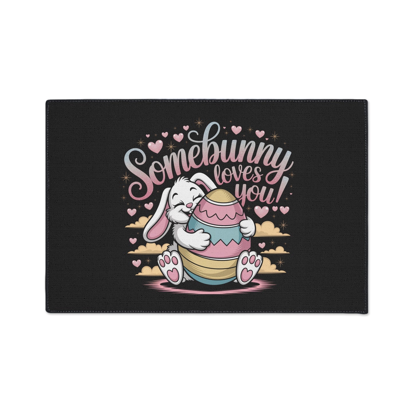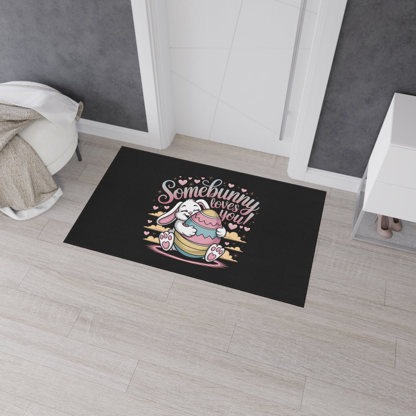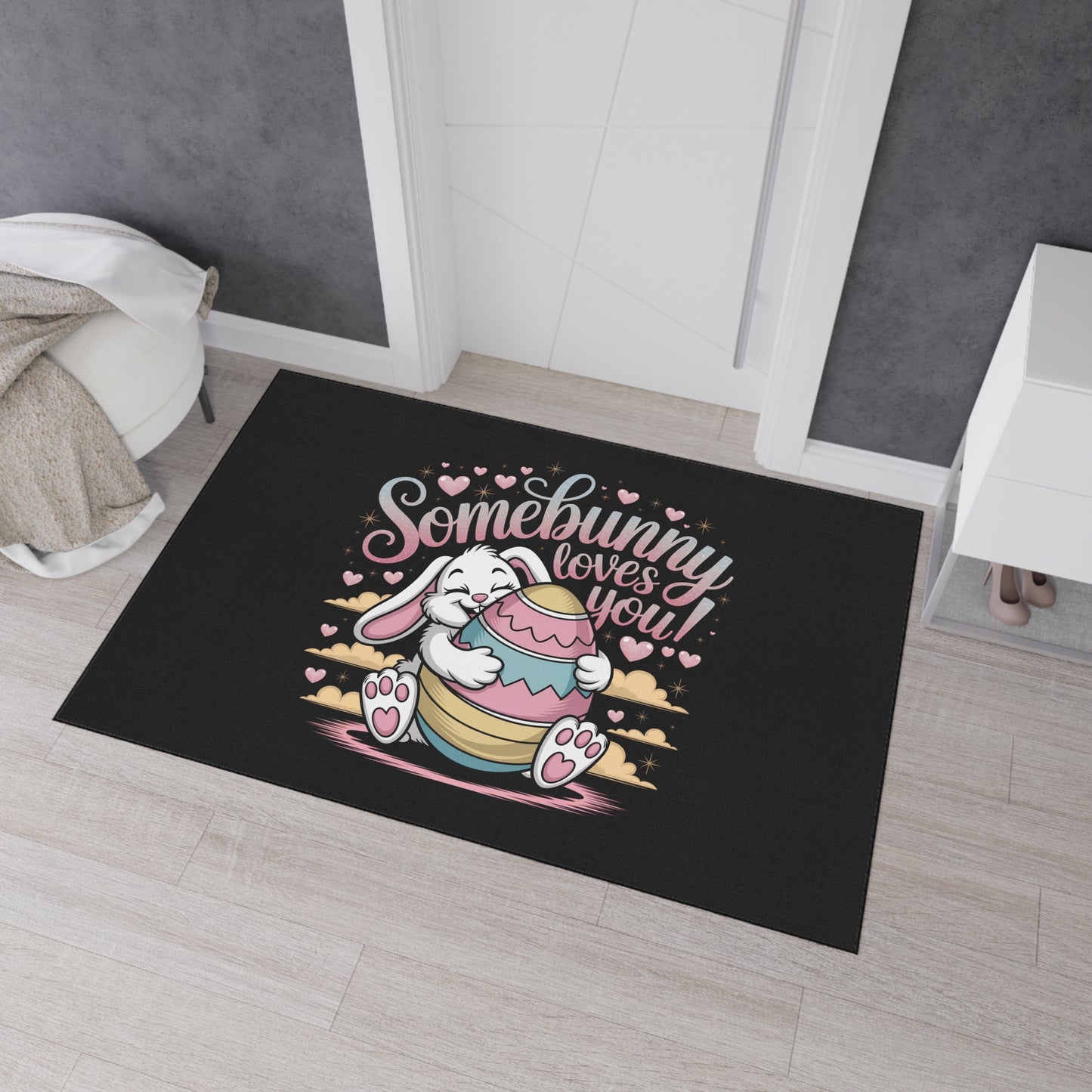 A fun Easter-themed floor mat featuring the Easter Bunny with the message 'Somebunny Loves You'. The vibrant colors and durable polyester front with anti-slip rubber backing make it perfect for adding a touch of whimsy to your home during the Easter season. Ideal for those who enjoy celebrating Easter and adding playful decor to their living spaces.