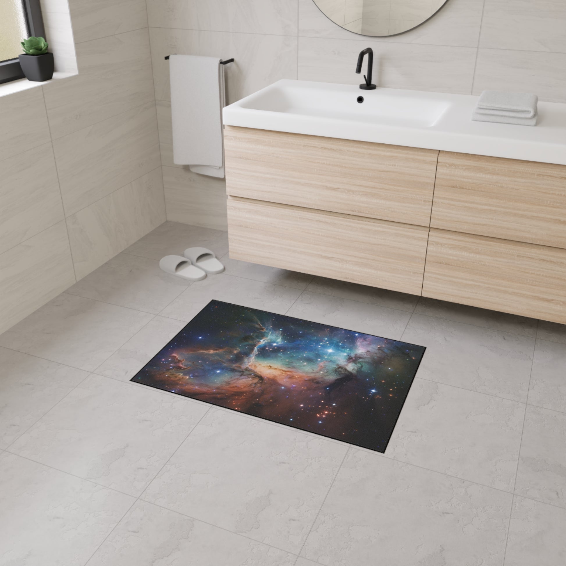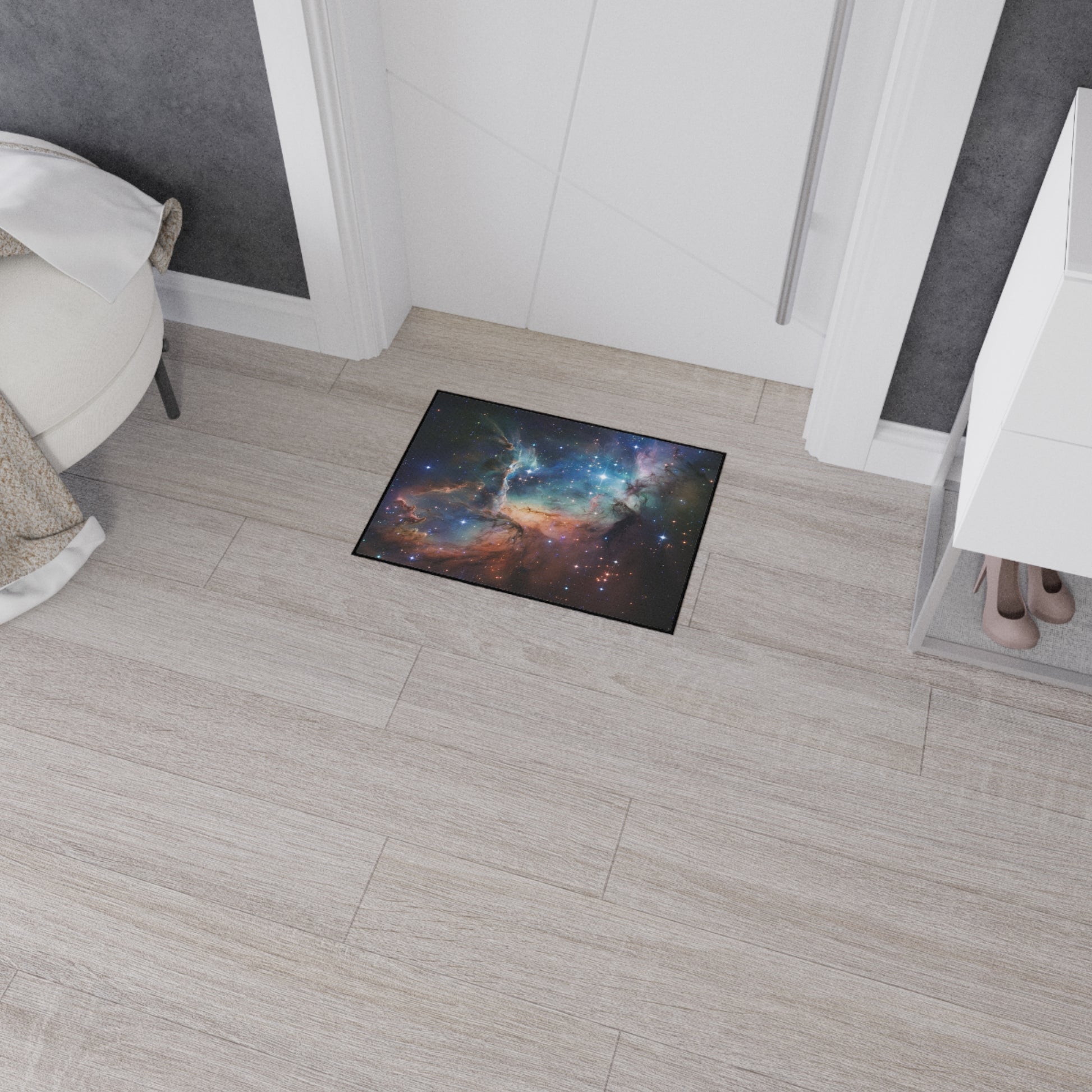 A fun floor mat with a space/cosmic design, perfect for adding a pop of color and personality to any room. The heavy-duty construction ensures durability and longevity, making it ideal for high-traffic areas. It's relevant for space enthusiasts, those looking to add a touch of fun to their home decor, and makes a great gift for housewarmings, birthdays, or holidays.