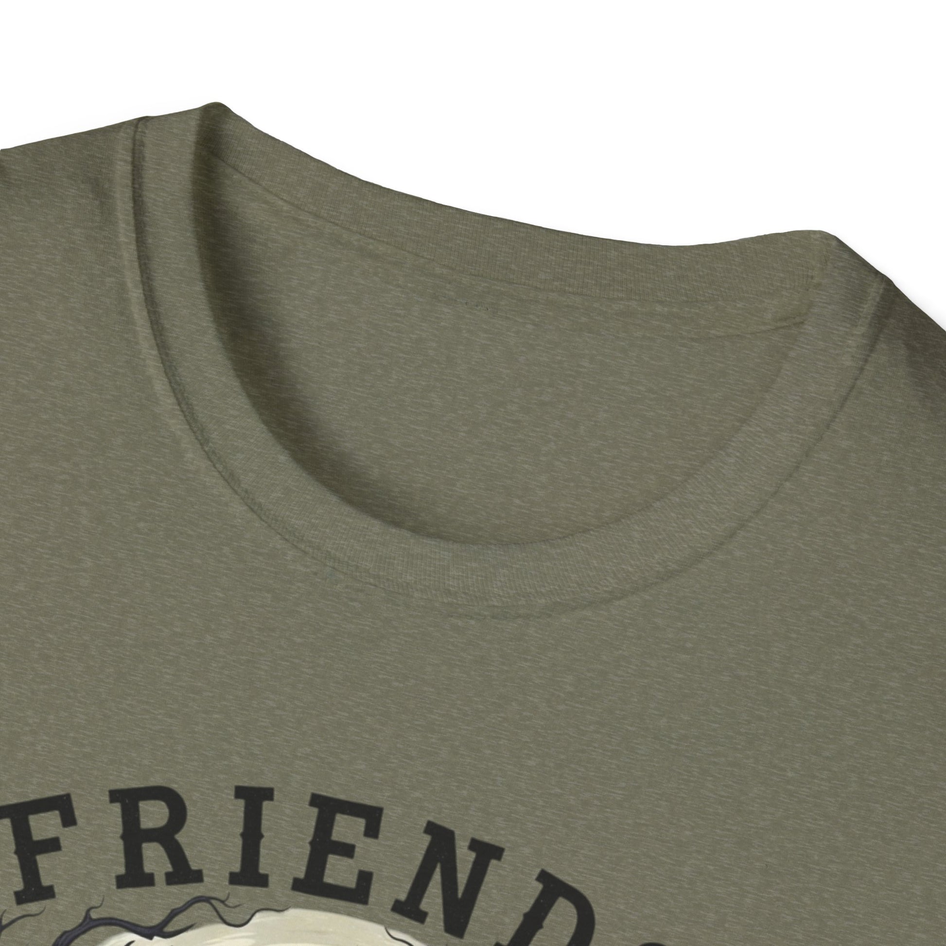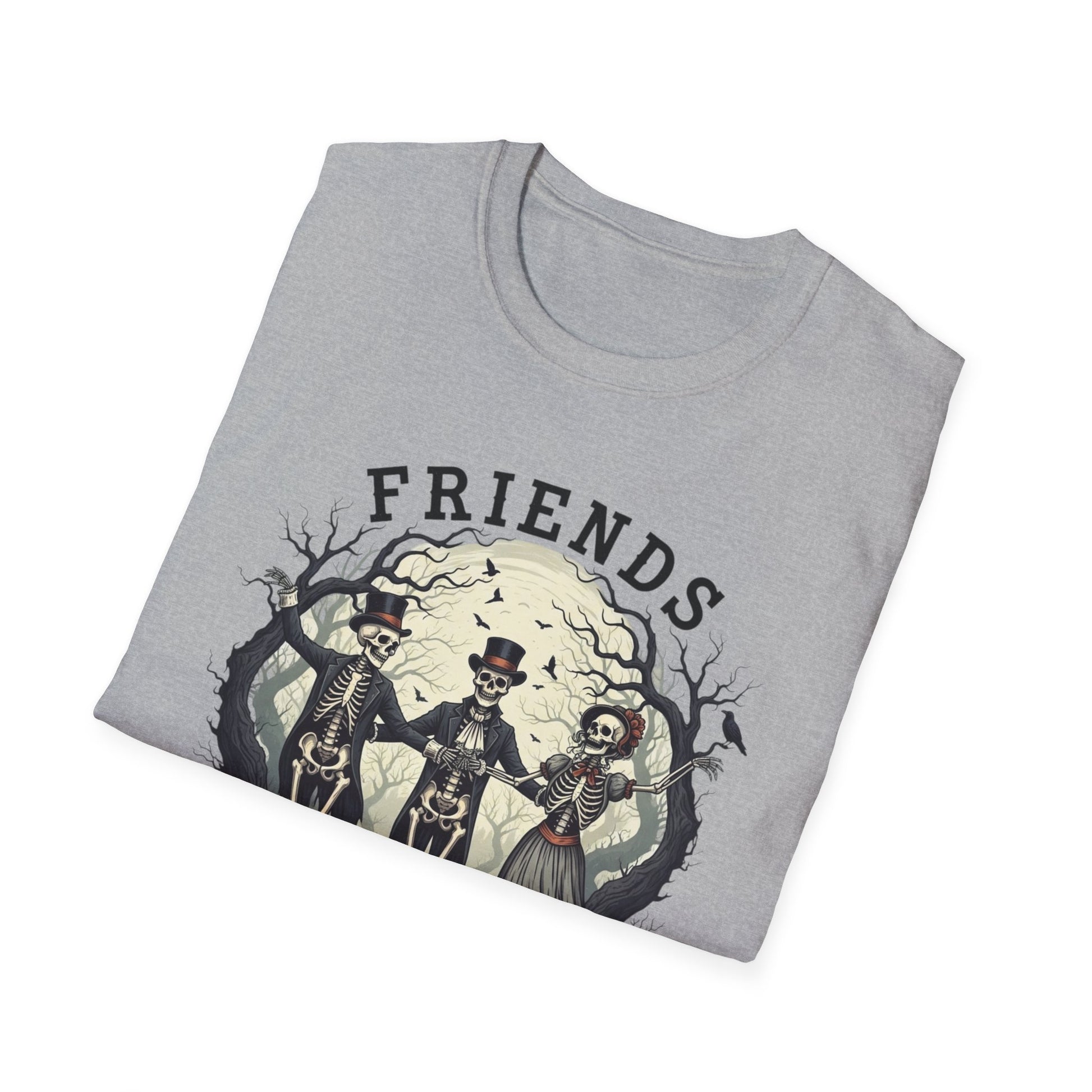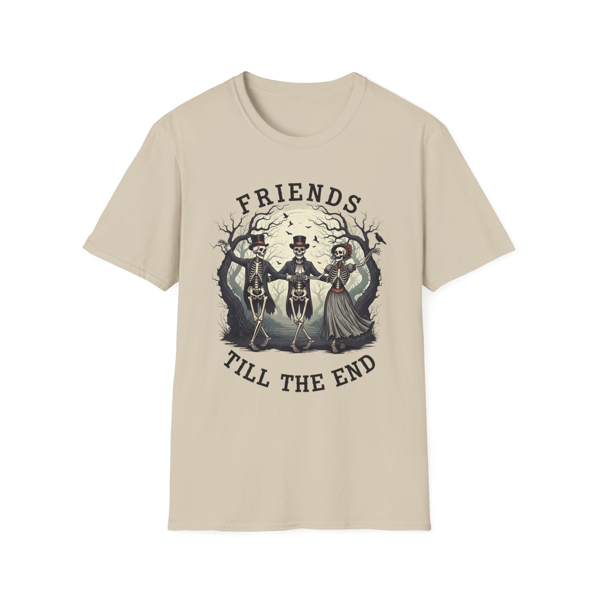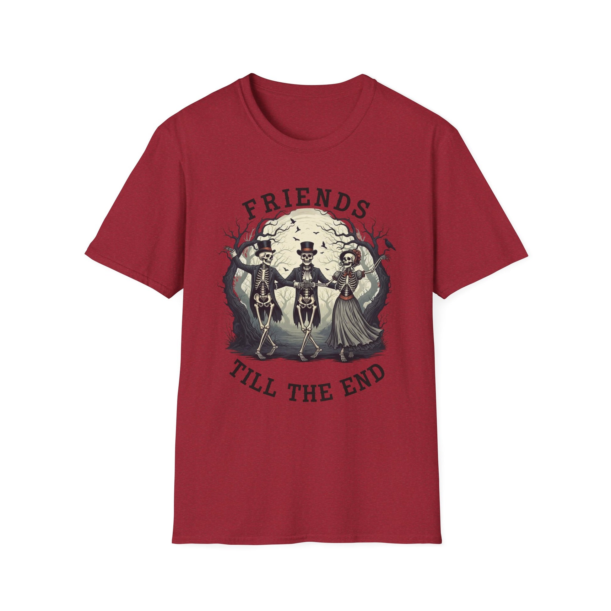 This Friends Till The End Skeleton Tee features three dancing skeletal pals under a haunting full moon—perfect for spooky-season outings, gothic gatherings, or simply celebrating BFF bonds.