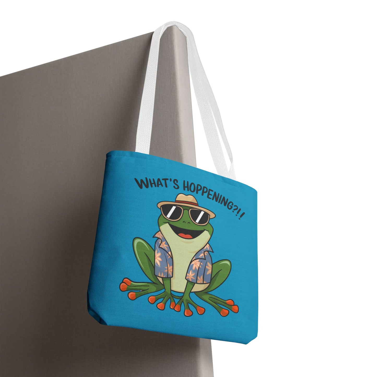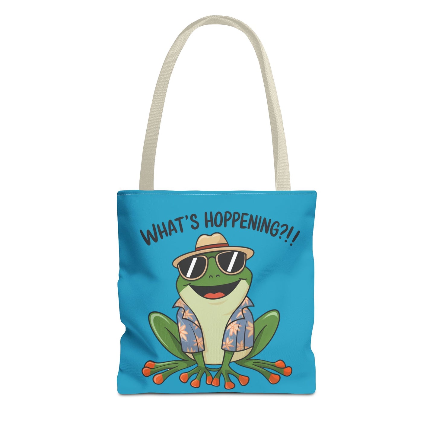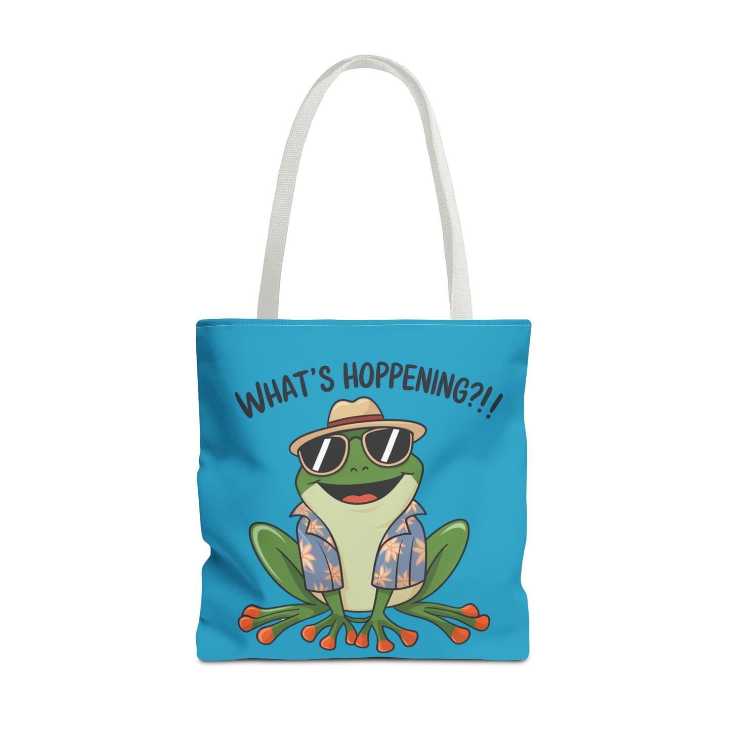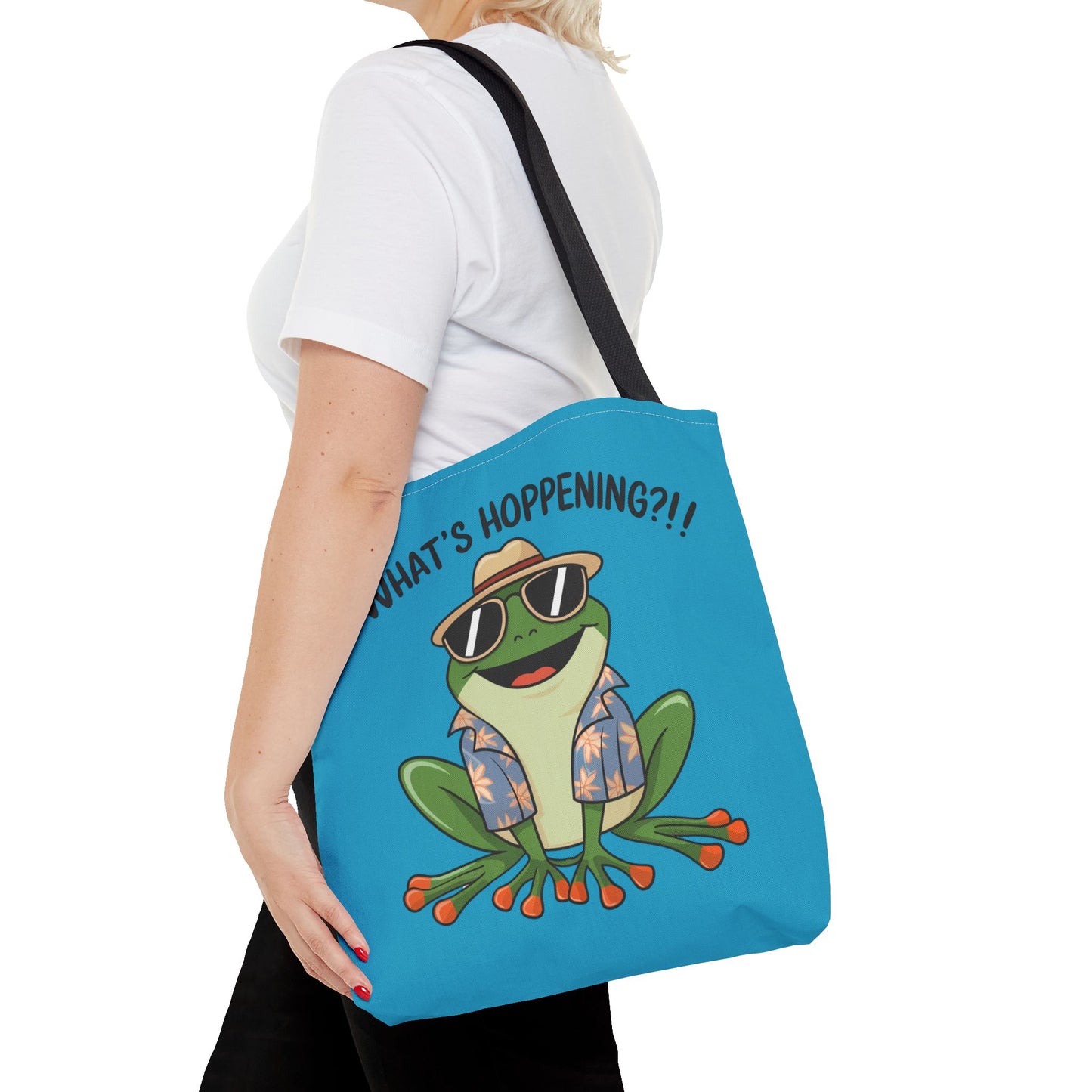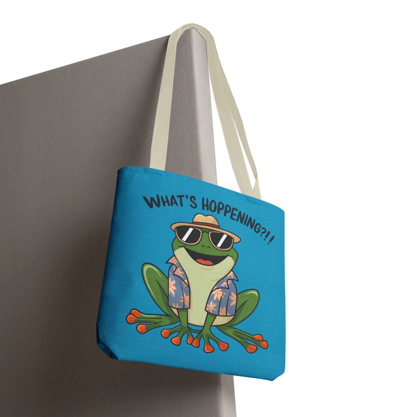 A fun pun tote bag with a frog on it that states "What's Hoppening". This quirky tote bag is perfect for frog enthusiasts and pun lovers. It adds a lighthearted touch to your everyday errands and is a great conversation starter. Ideal for gifting during birthdays, holidays, or just because.