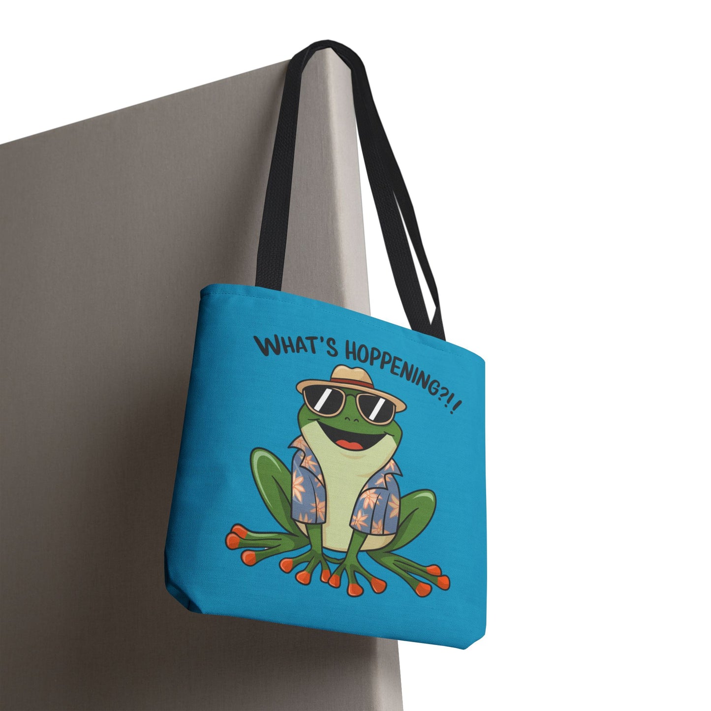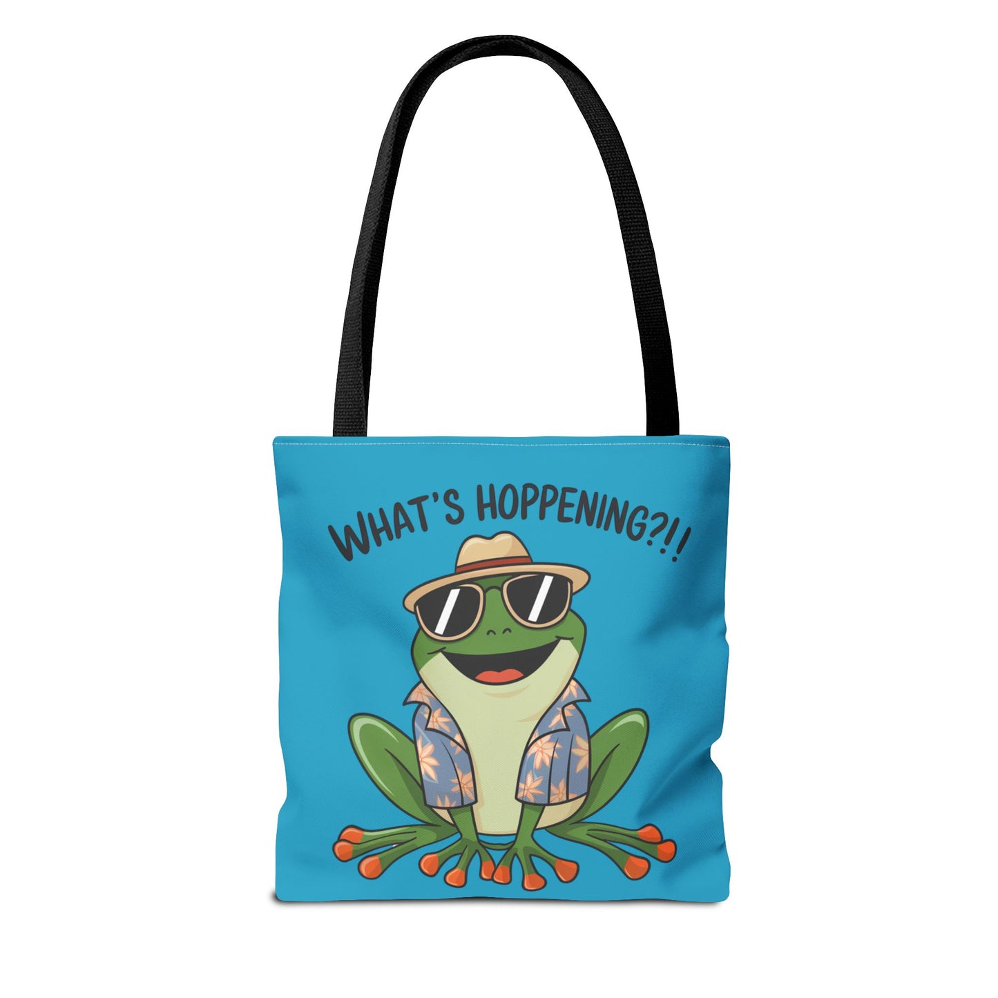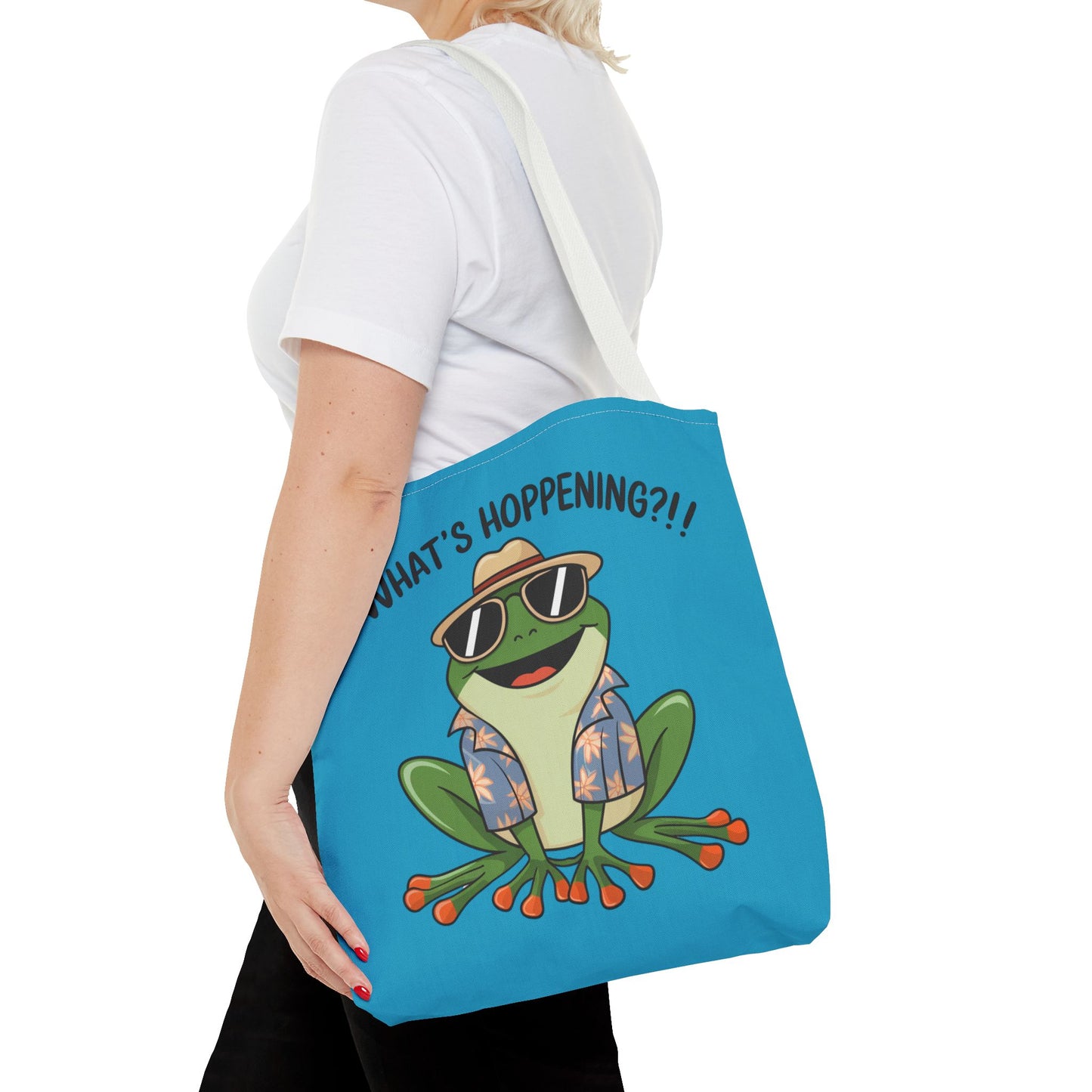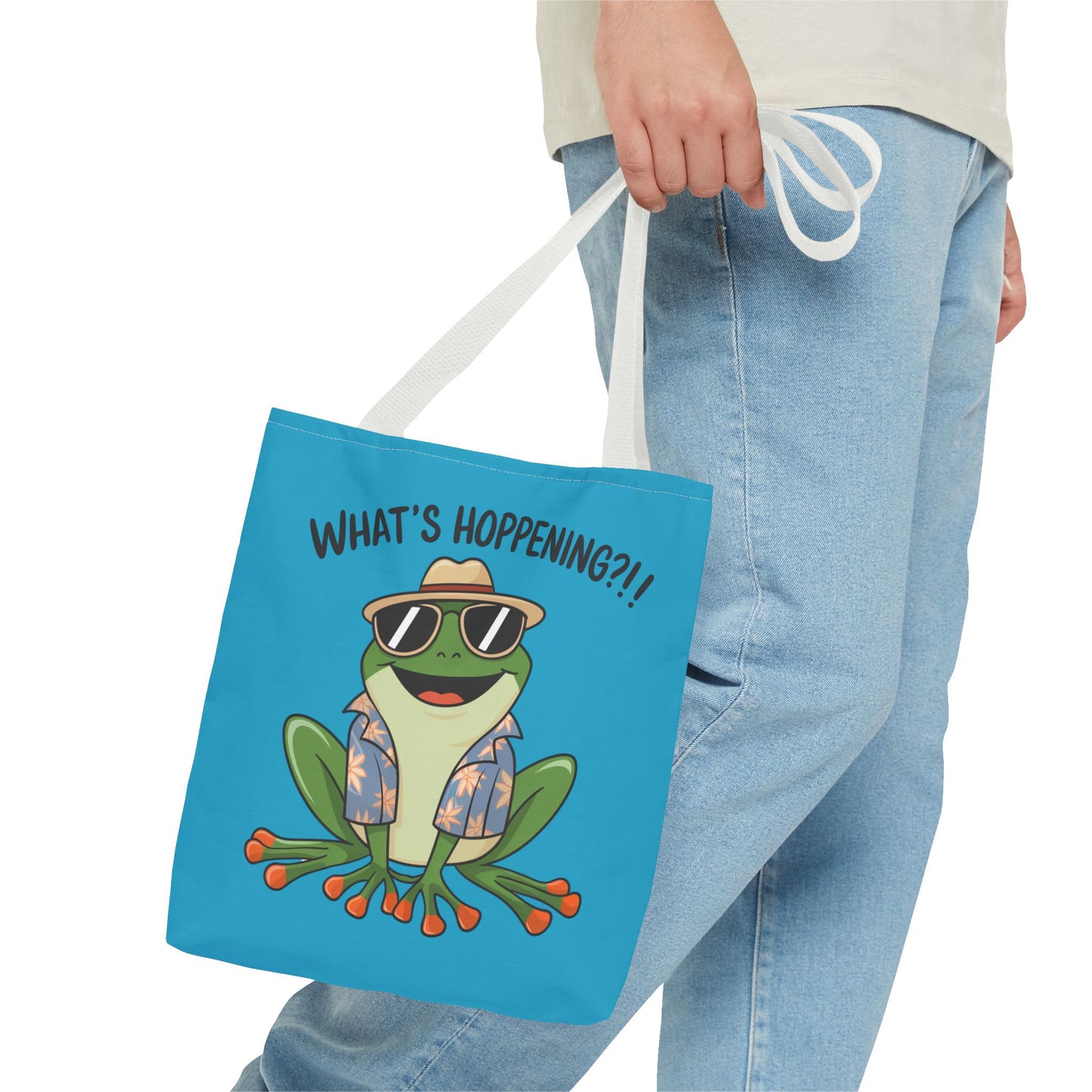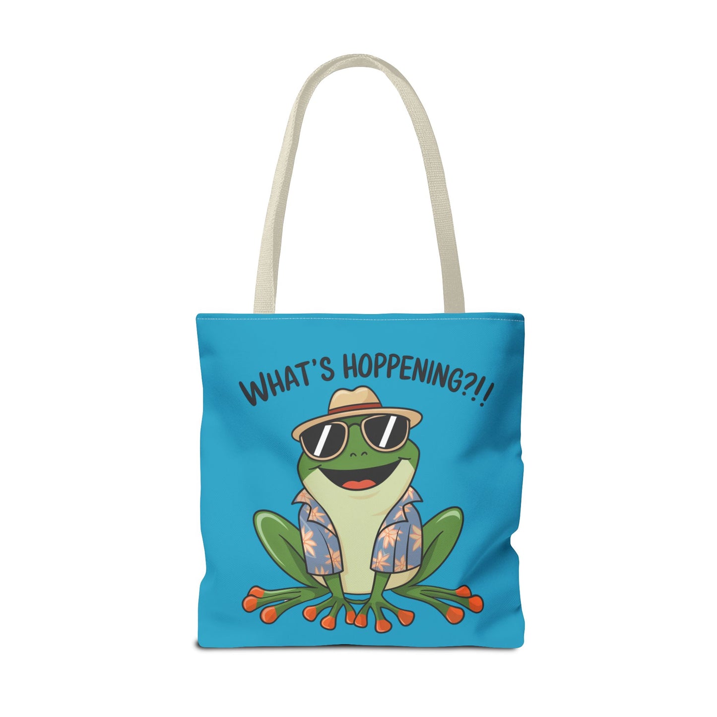 A fun pun tote bag with a frog on it that states "What's Hoppening". This quirky tote bag is perfect for frog enthusiasts and pun lovers. It adds a lighthearted touch to your everyday errands and is a great conversation starter. Ideal for gifting during birthdays, holidays, or just because.