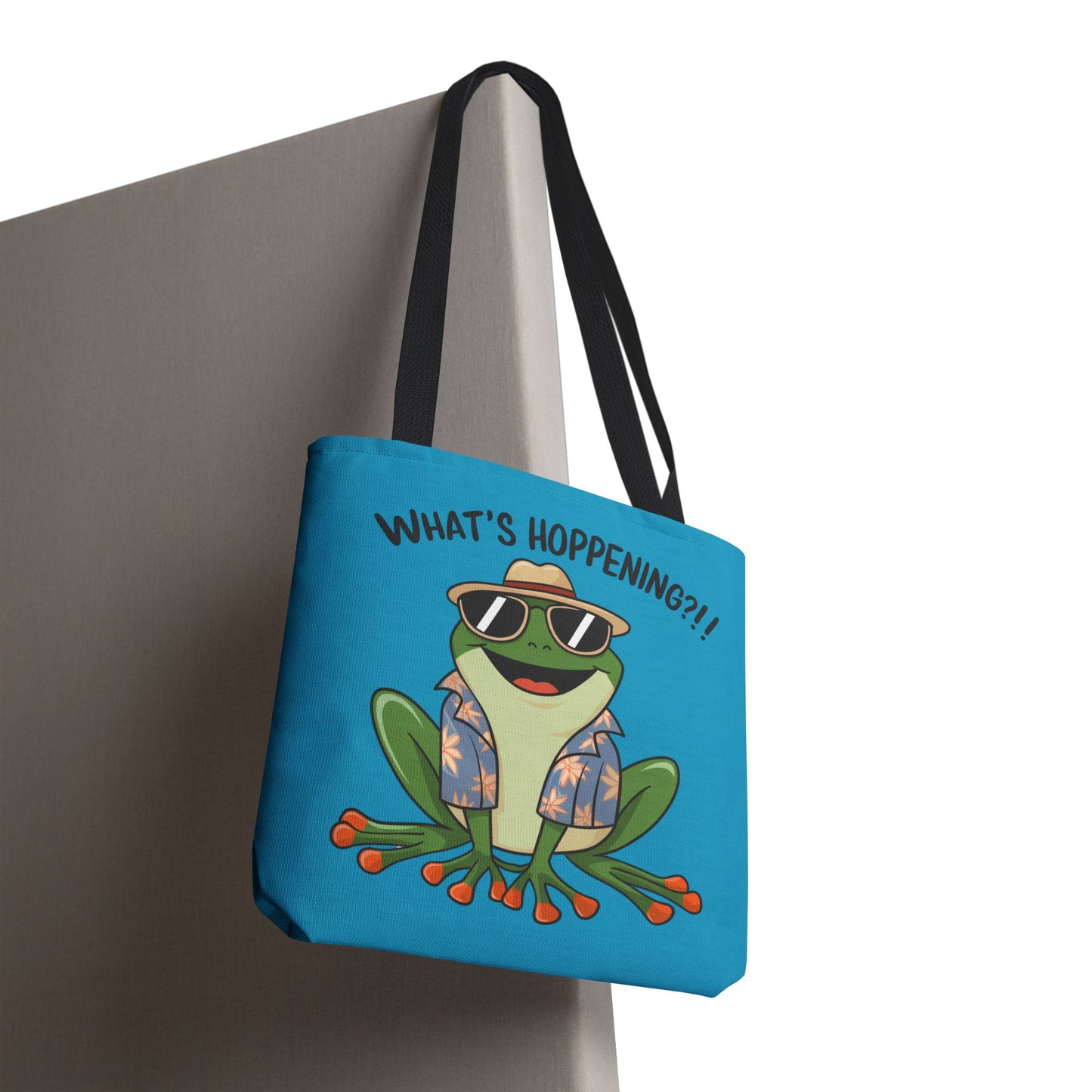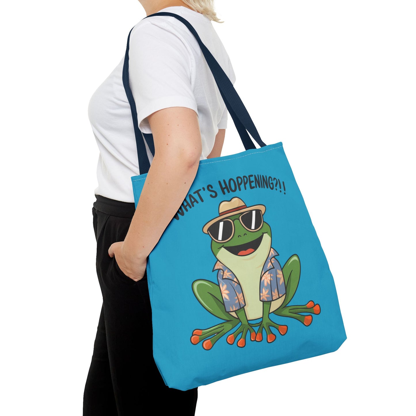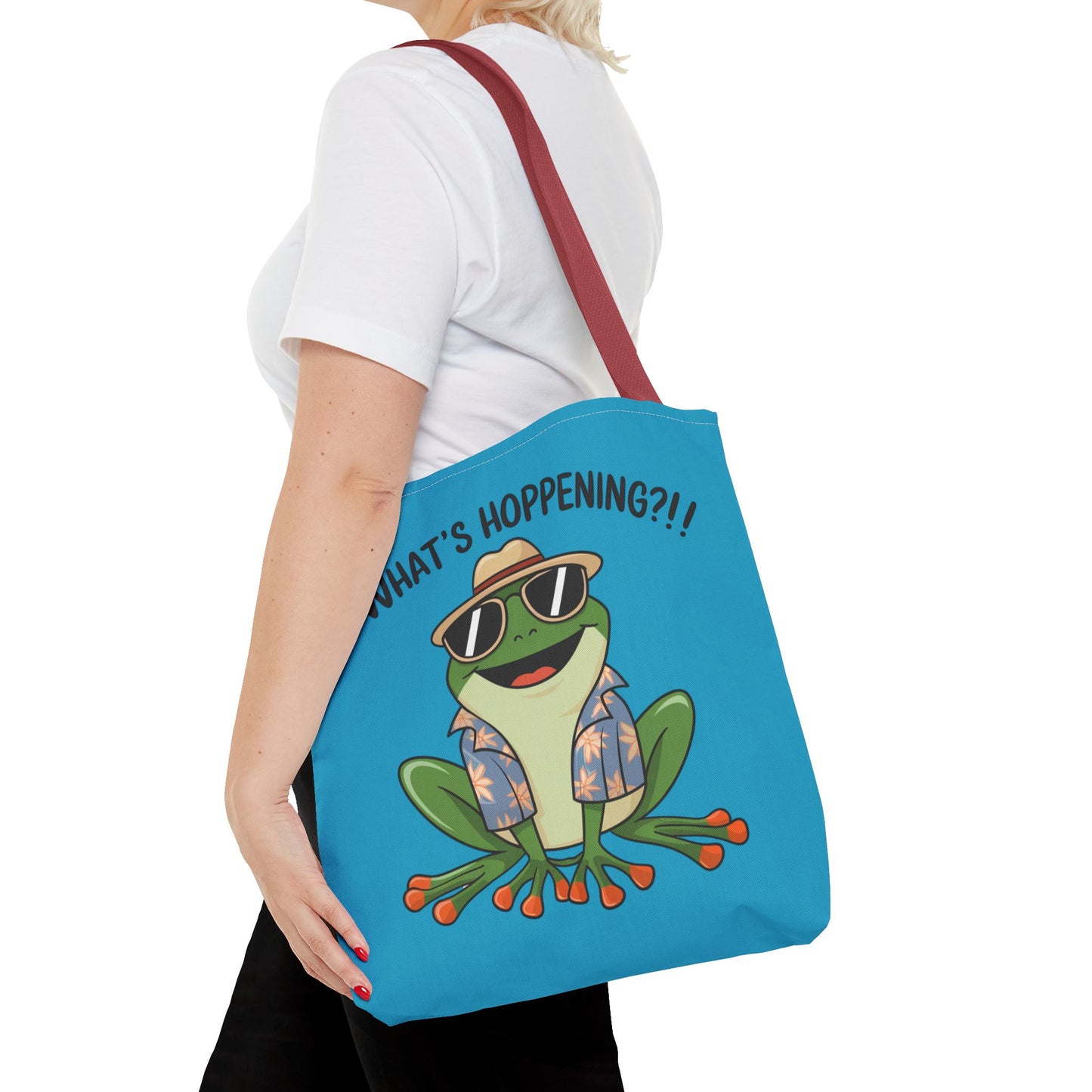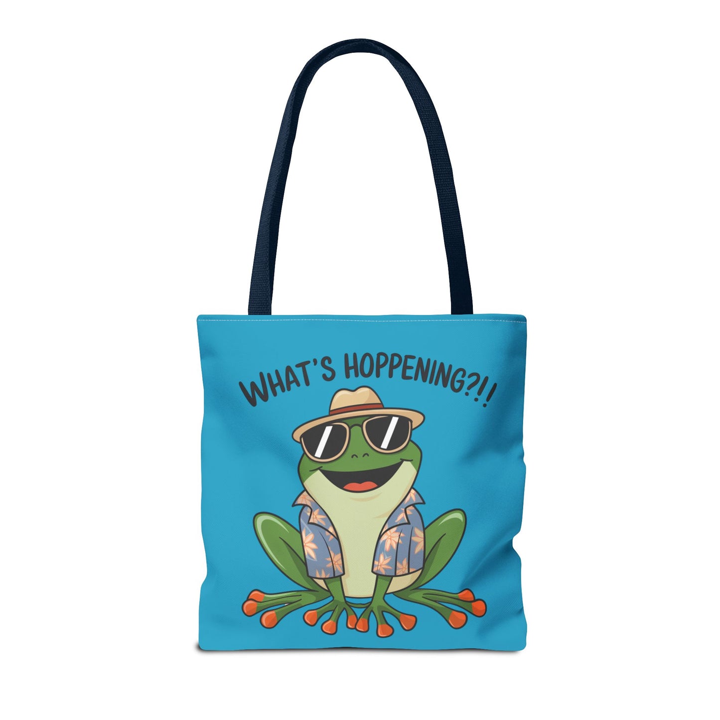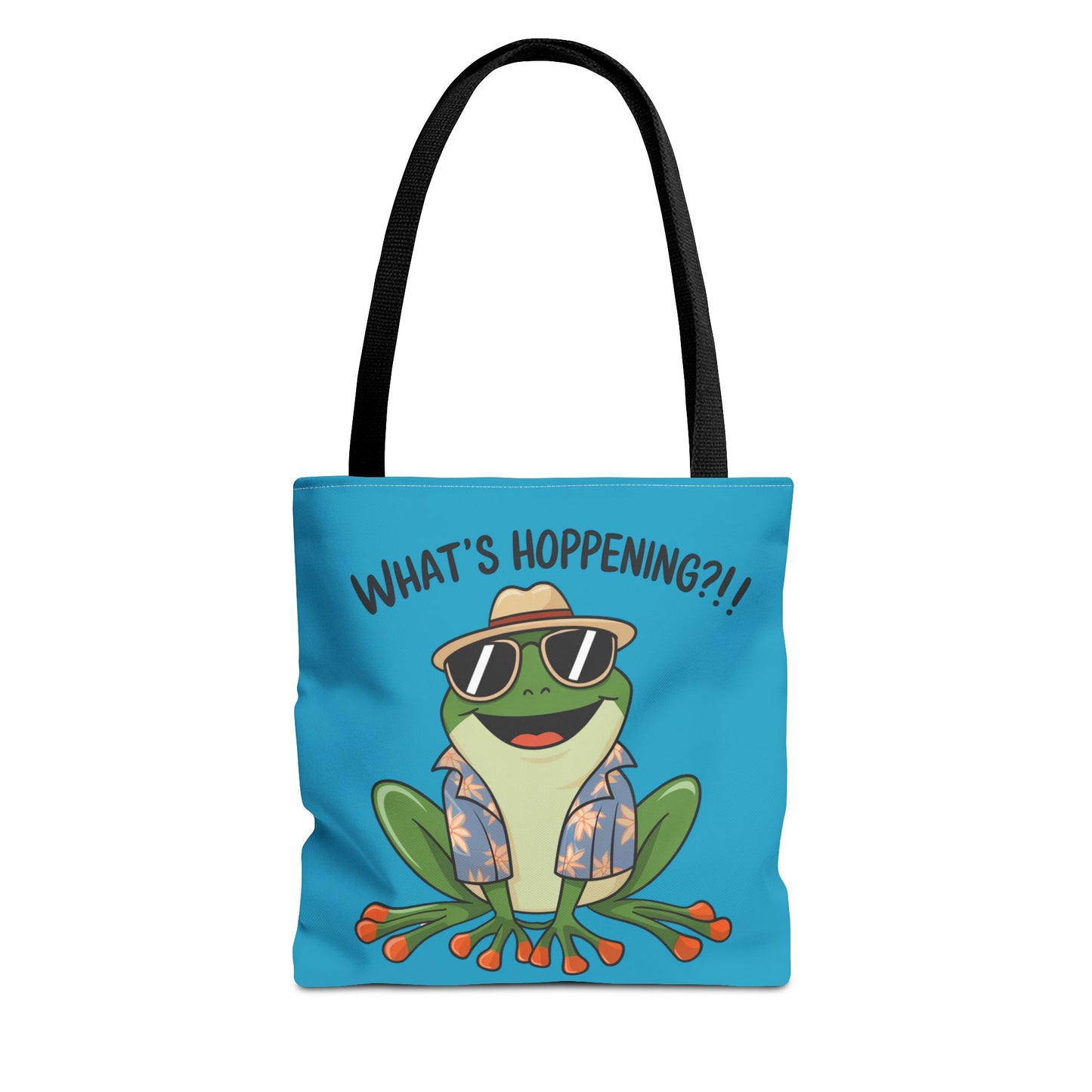 A fun pun tote bag with a frog on it that states "What's Hoppening". This quirky tote bag is perfect for frog enthusiasts and pun lovers. It adds a lighthearted touch to your everyday errands and is a great conversation starter. Ideal for gifting during birthdays, holidays, or just because.