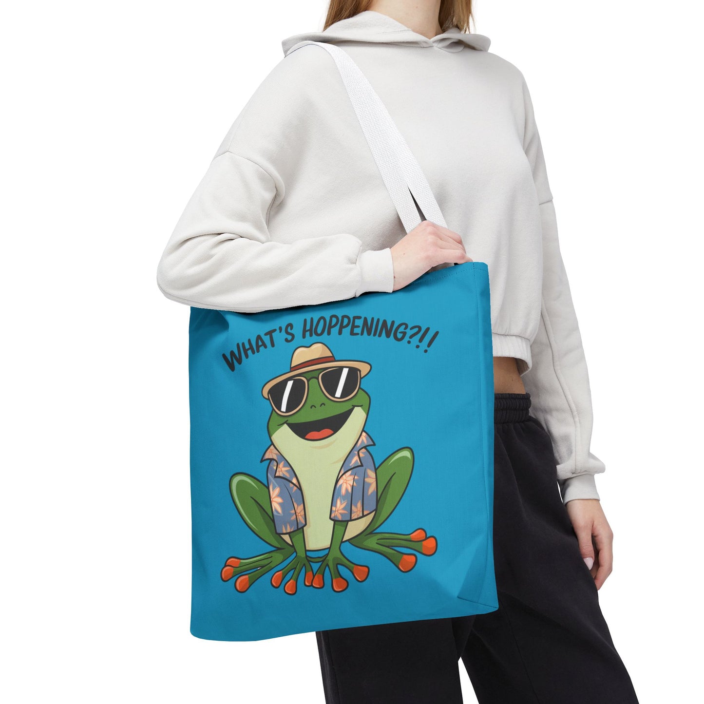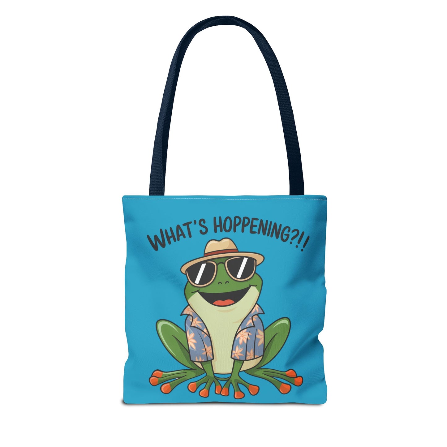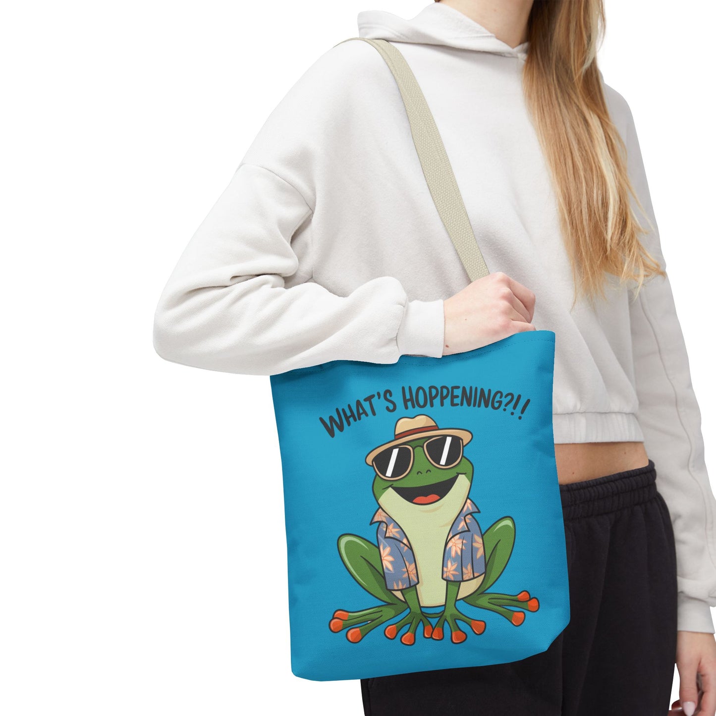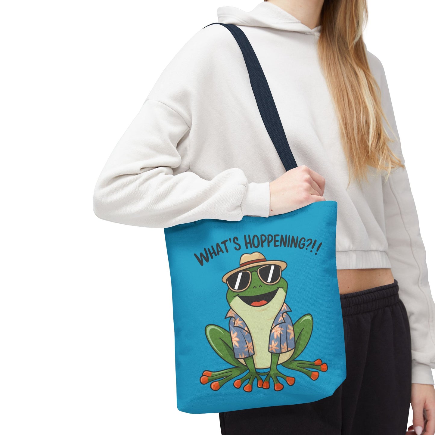 A fun pun tote bag with a frog on it that states "What's Hoppening". This quirky tote bag is perfect for frog enthusiasts and pun lovers. It adds a lighthearted touch to your everyday errands and is a great conversation starter. Ideal for gifting during birthdays, holidays, or just because.