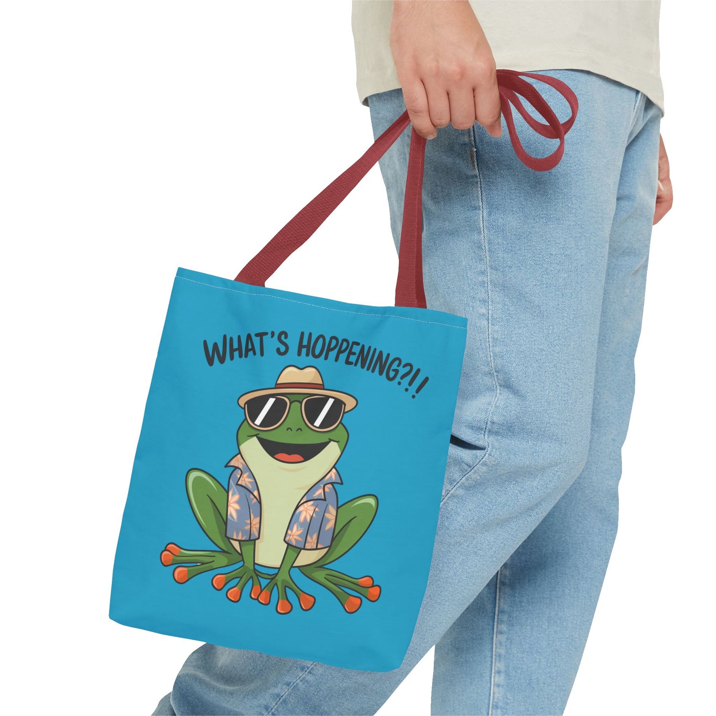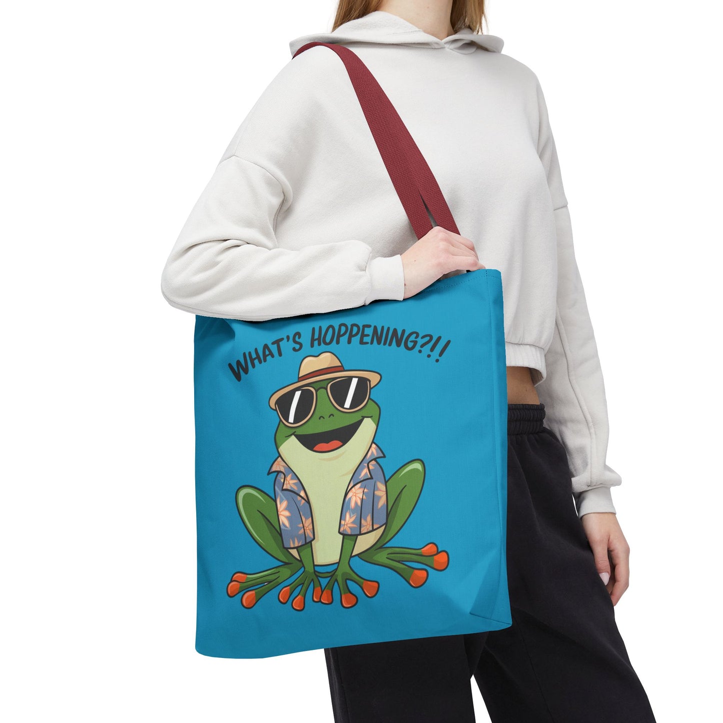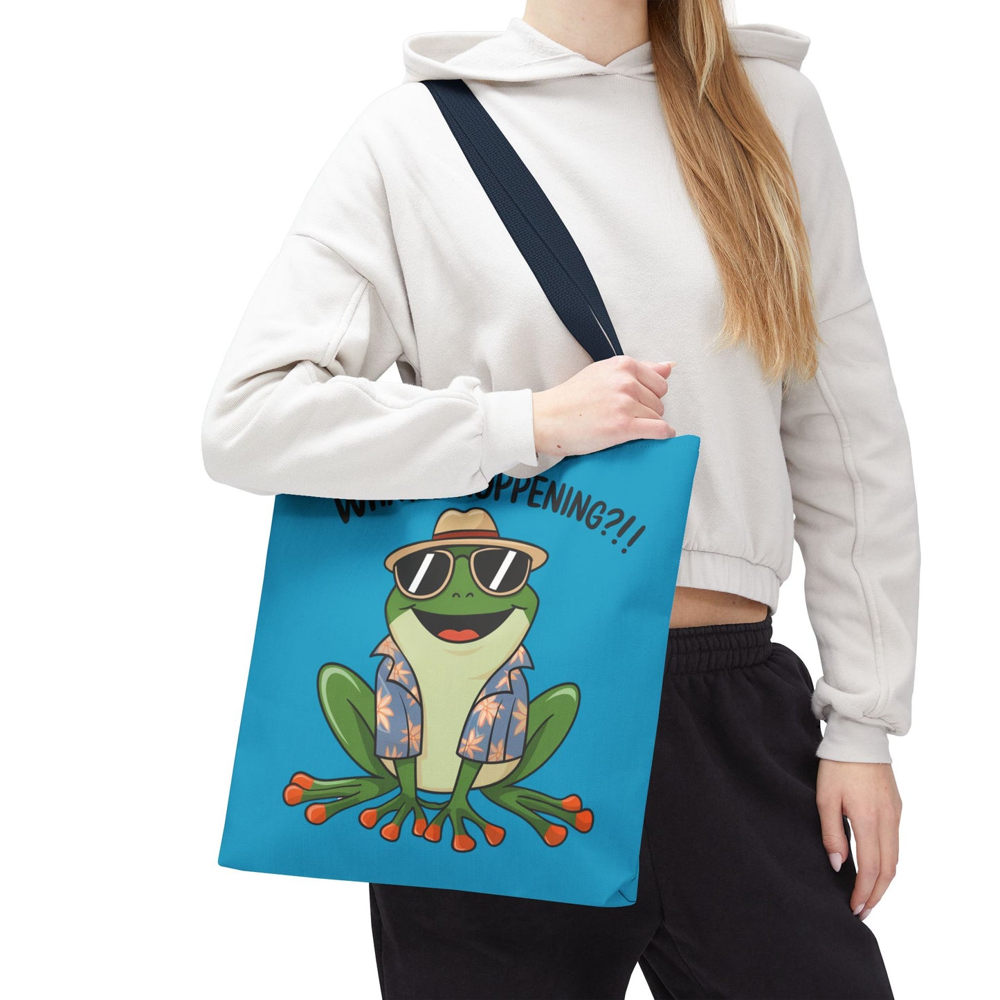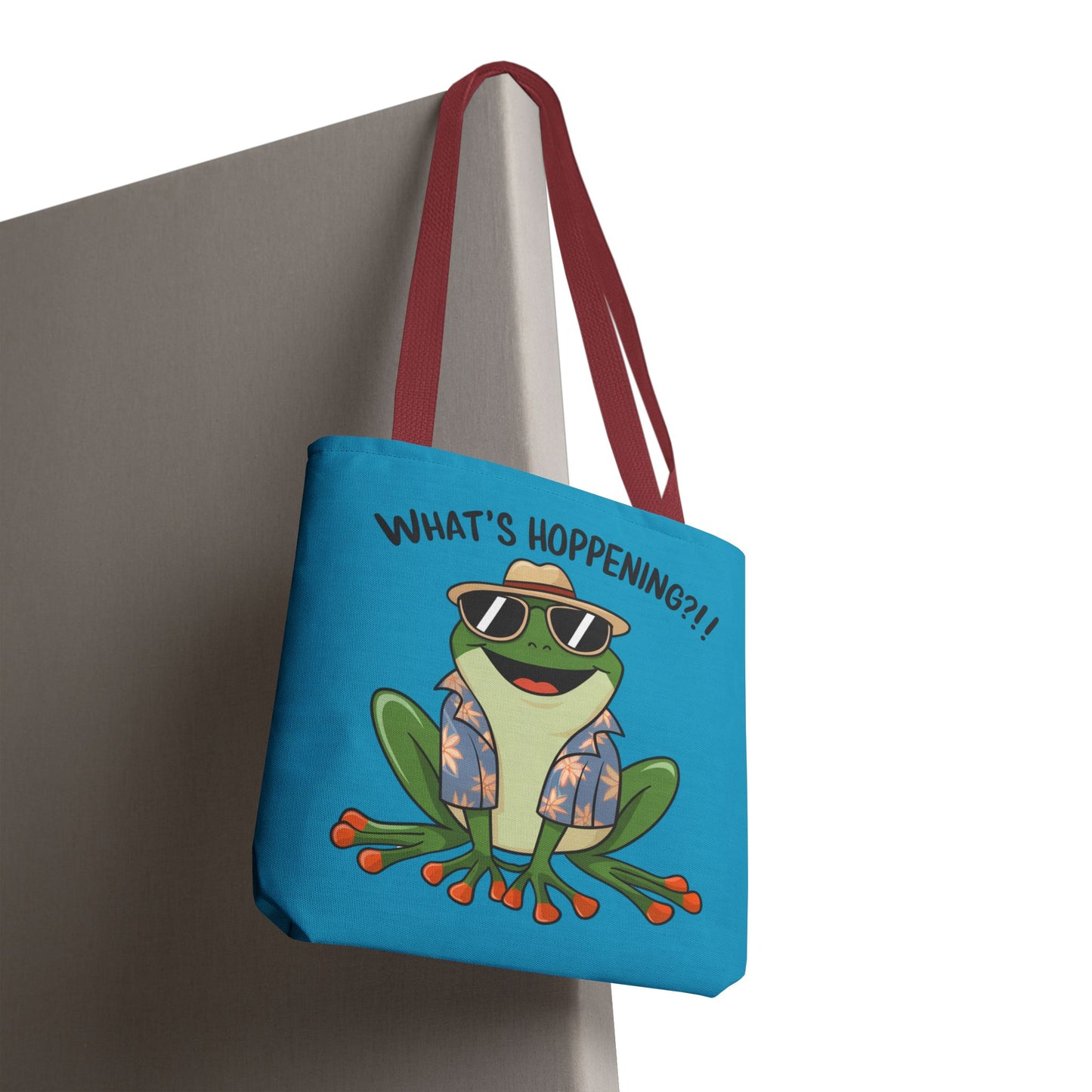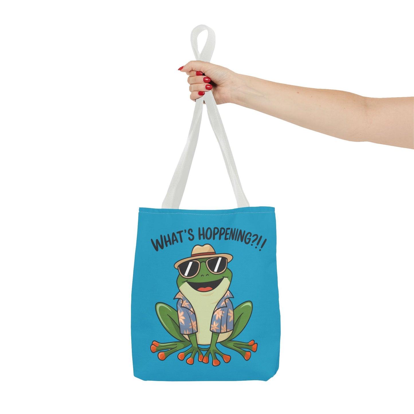 A fun pun tote bag with a frog on it that states "What's Hoppening". This quirky tote bag is perfect for frog enthusiasts and pun lovers. It adds a lighthearted touch to your everyday errands and is a great conversation starter. Ideal for gifting during birthdays, holidays, or just because.