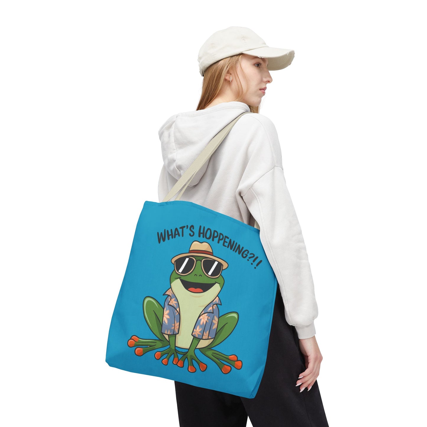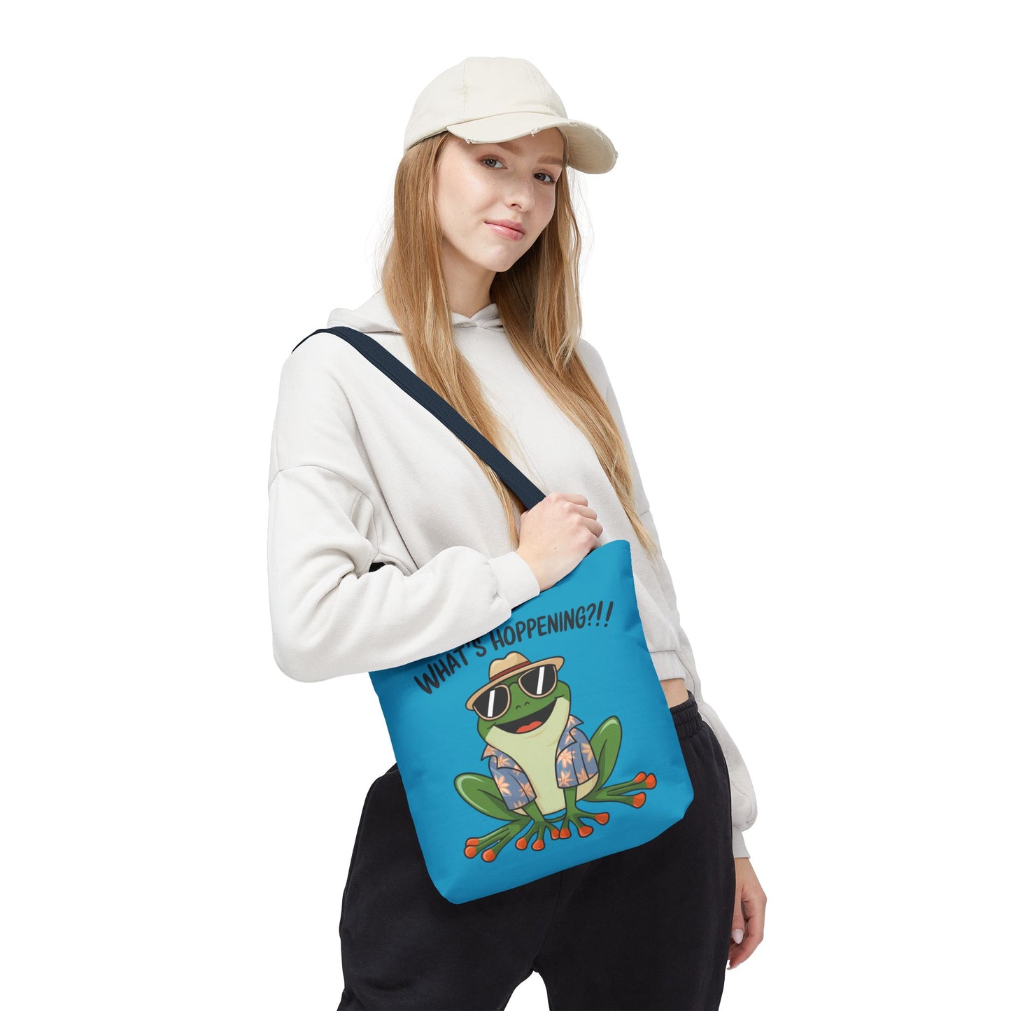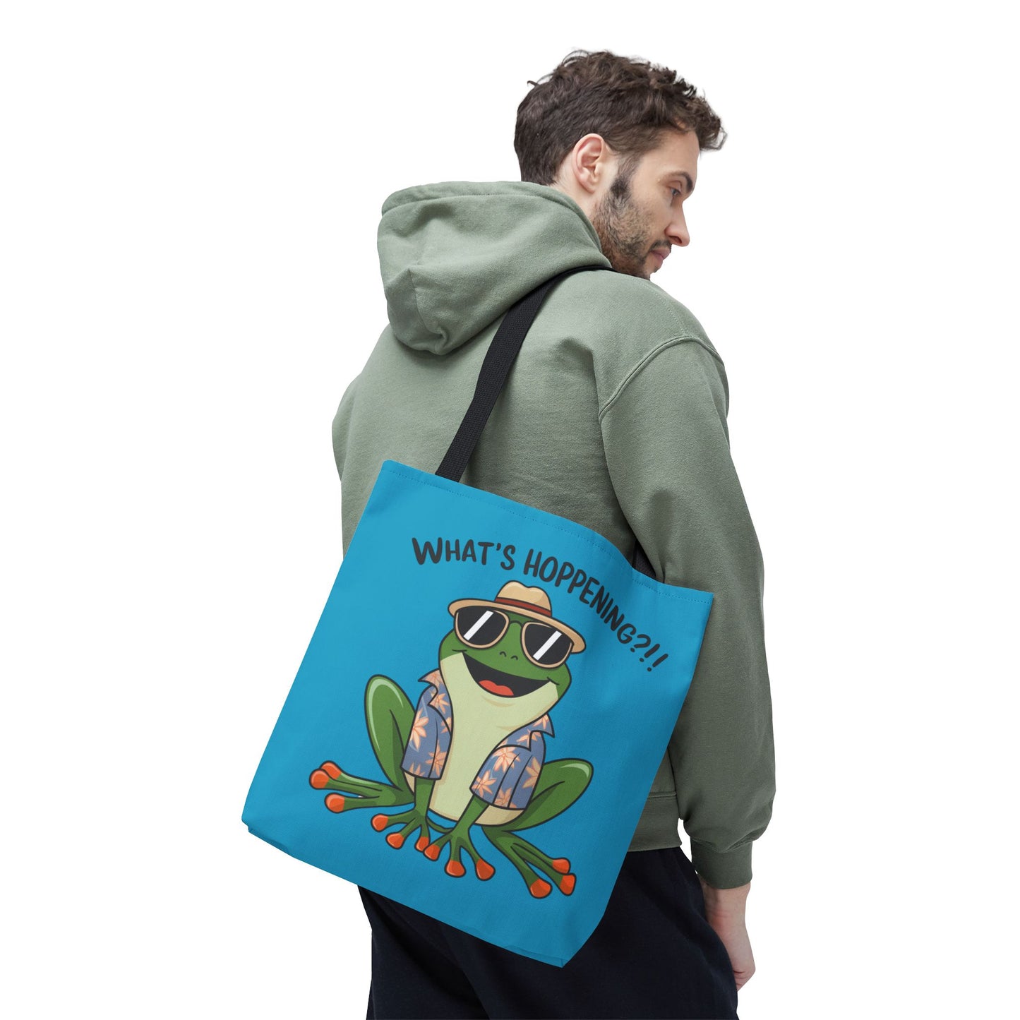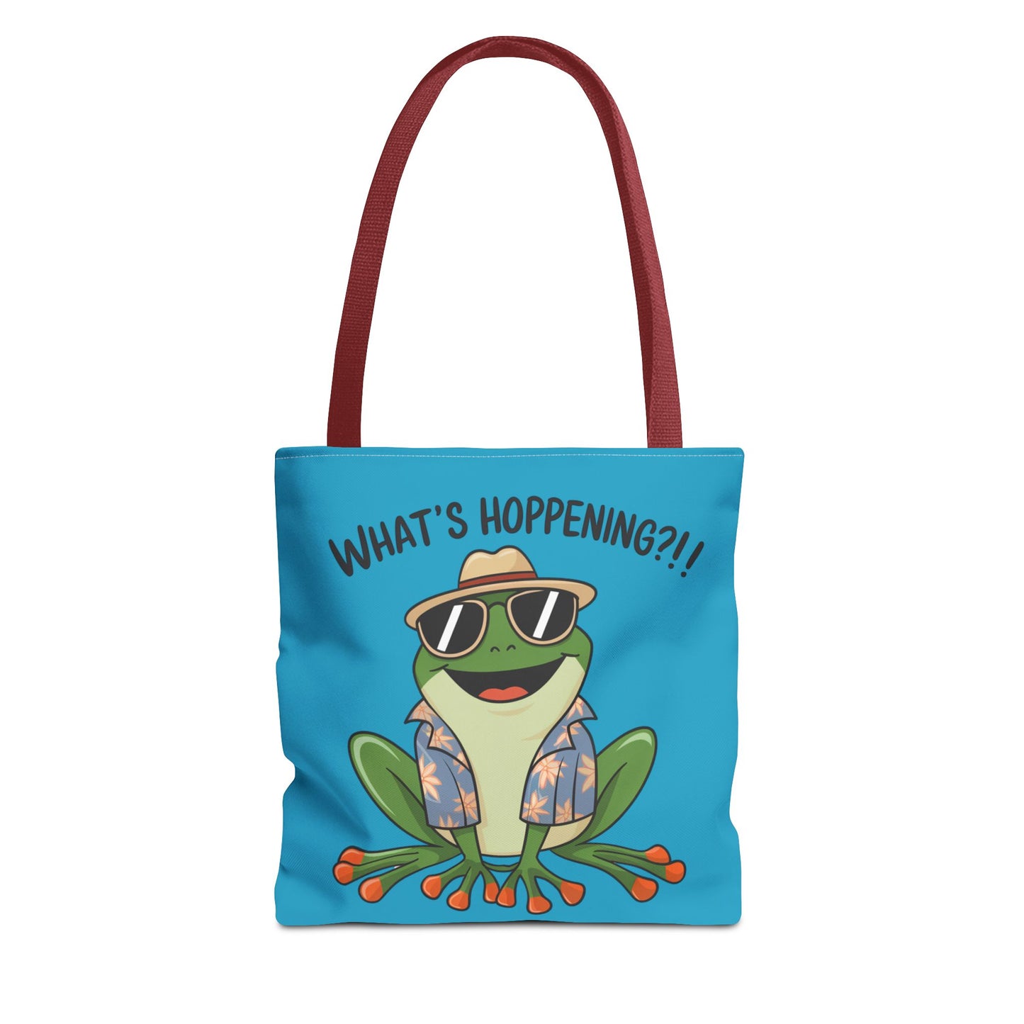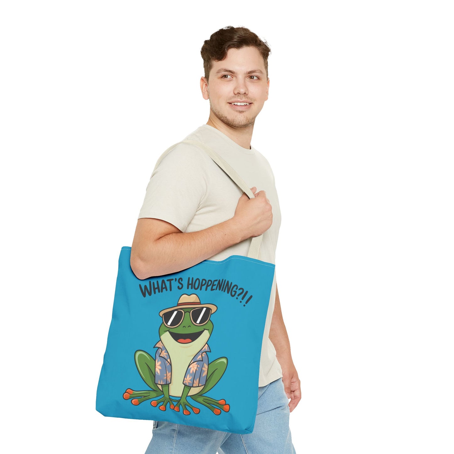 A fun pun tote bag with a frog on it that states "What's Hoppening". This quirky tote bag is perfect for frog enthusiasts and pun lovers. It adds a lighthearted touch to your everyday errands and is a great conversation starter. Ideal for gifting during birthdays, holidays, or just because.