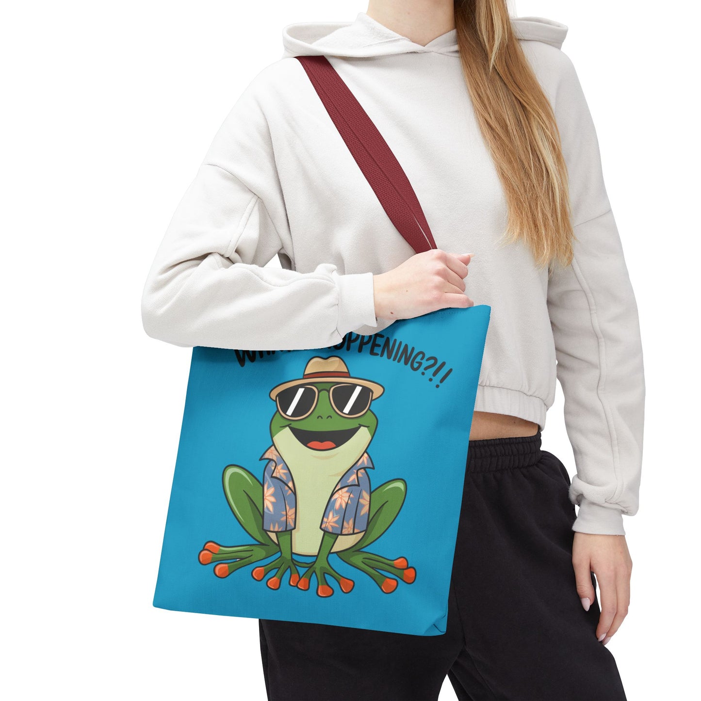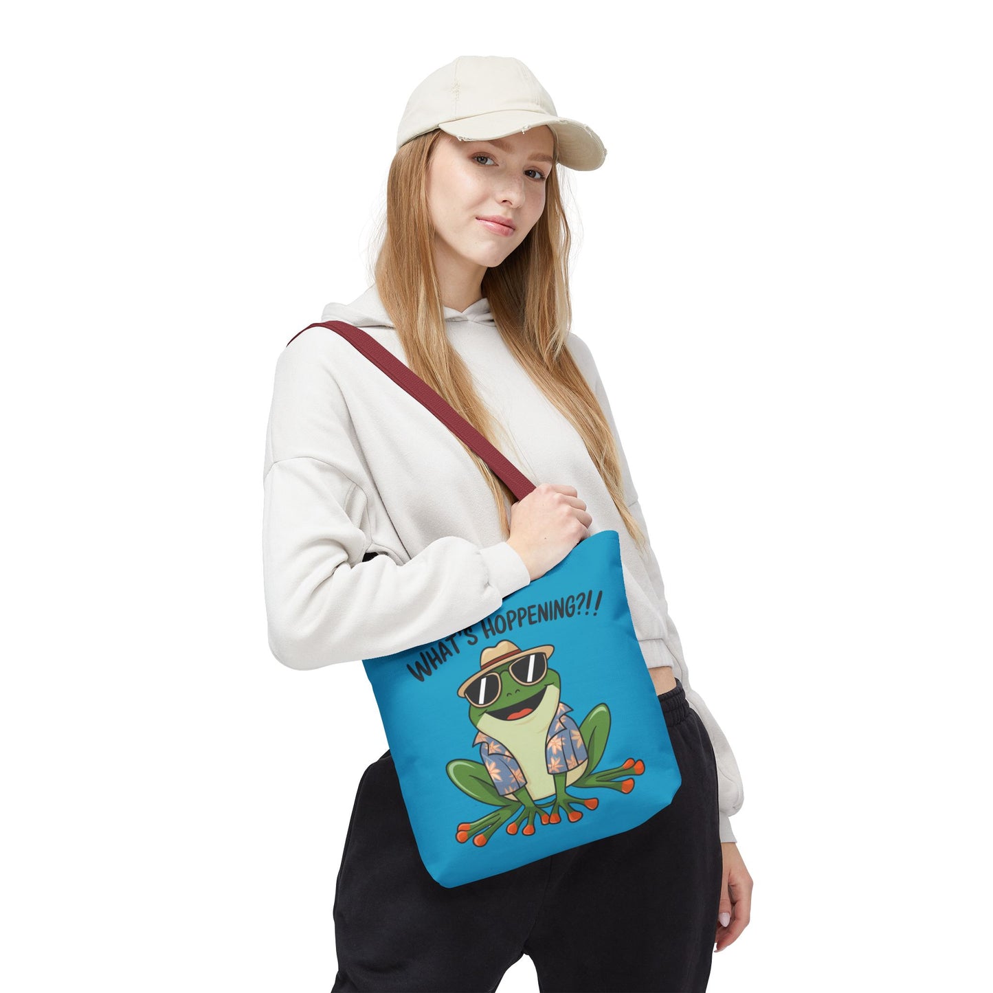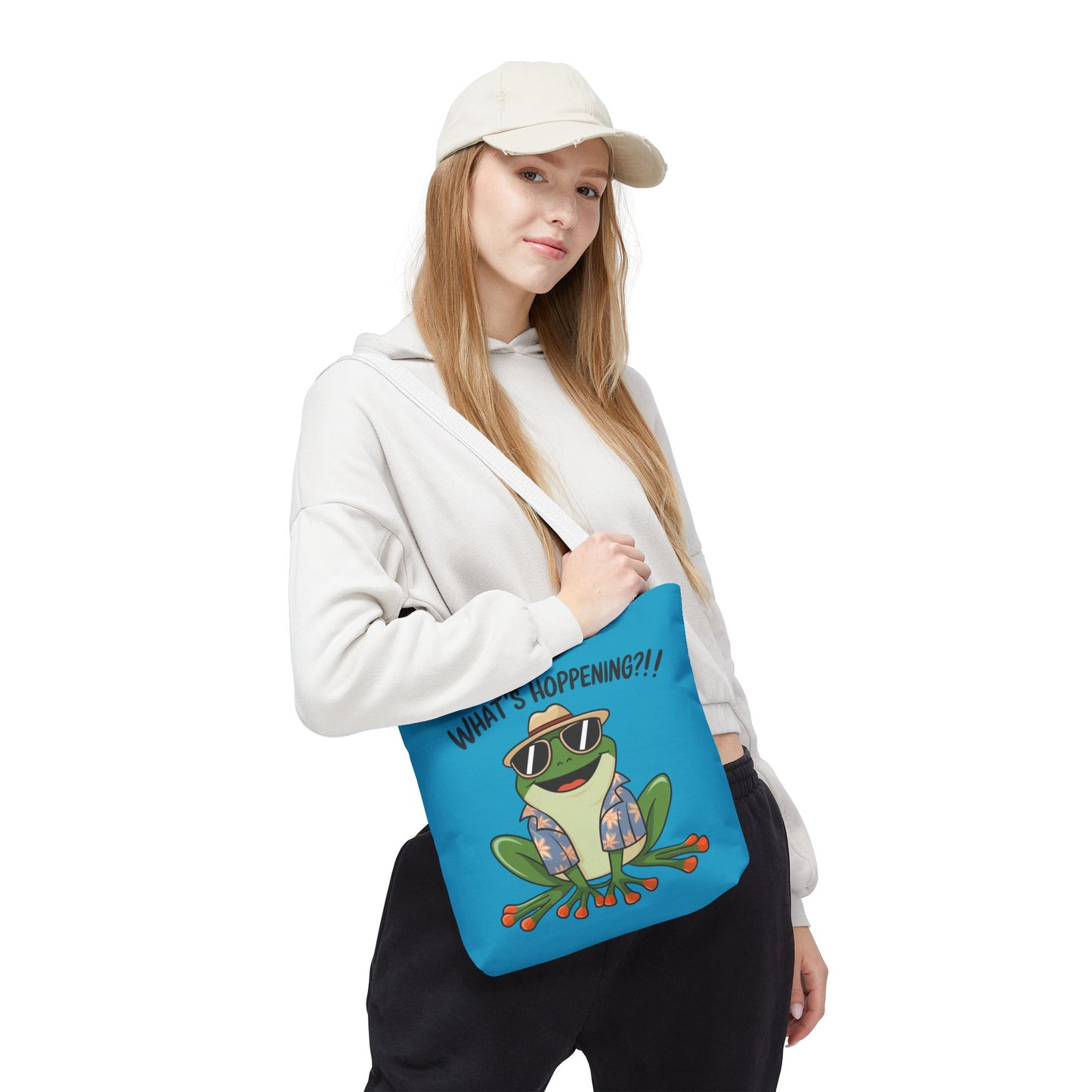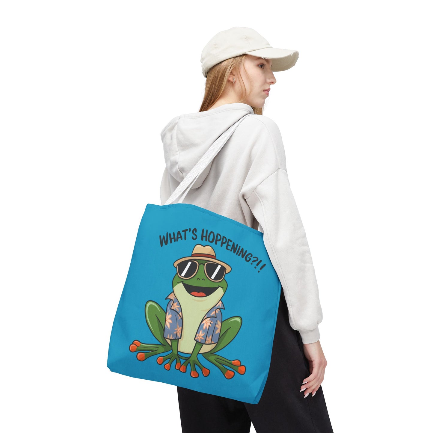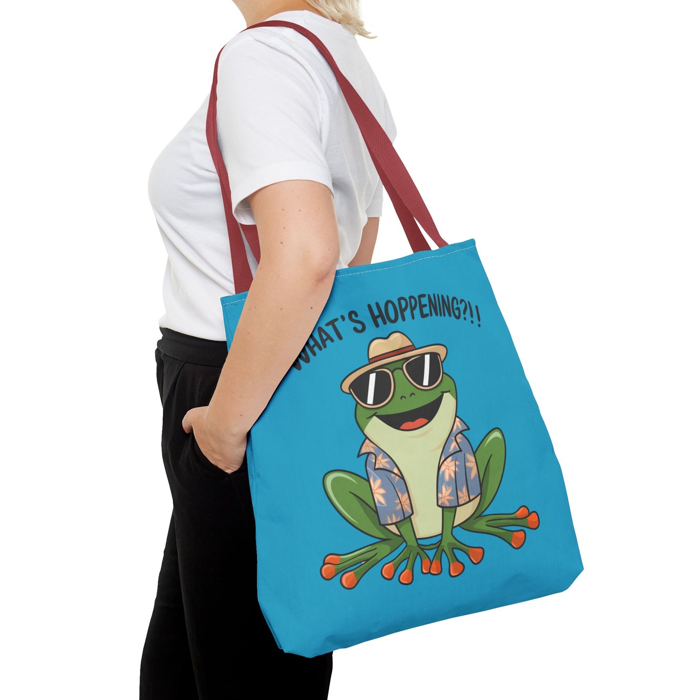 A fun pun tote bag with a frog on it that states "What's Hoppening". This quirky tote bag is perfect for frog enthusiasts and pun lovers. It adds a lighthearted touch to your everyday errands and is a great conversation starter. Ideal for gifting during birthdays, holidays, or just because.