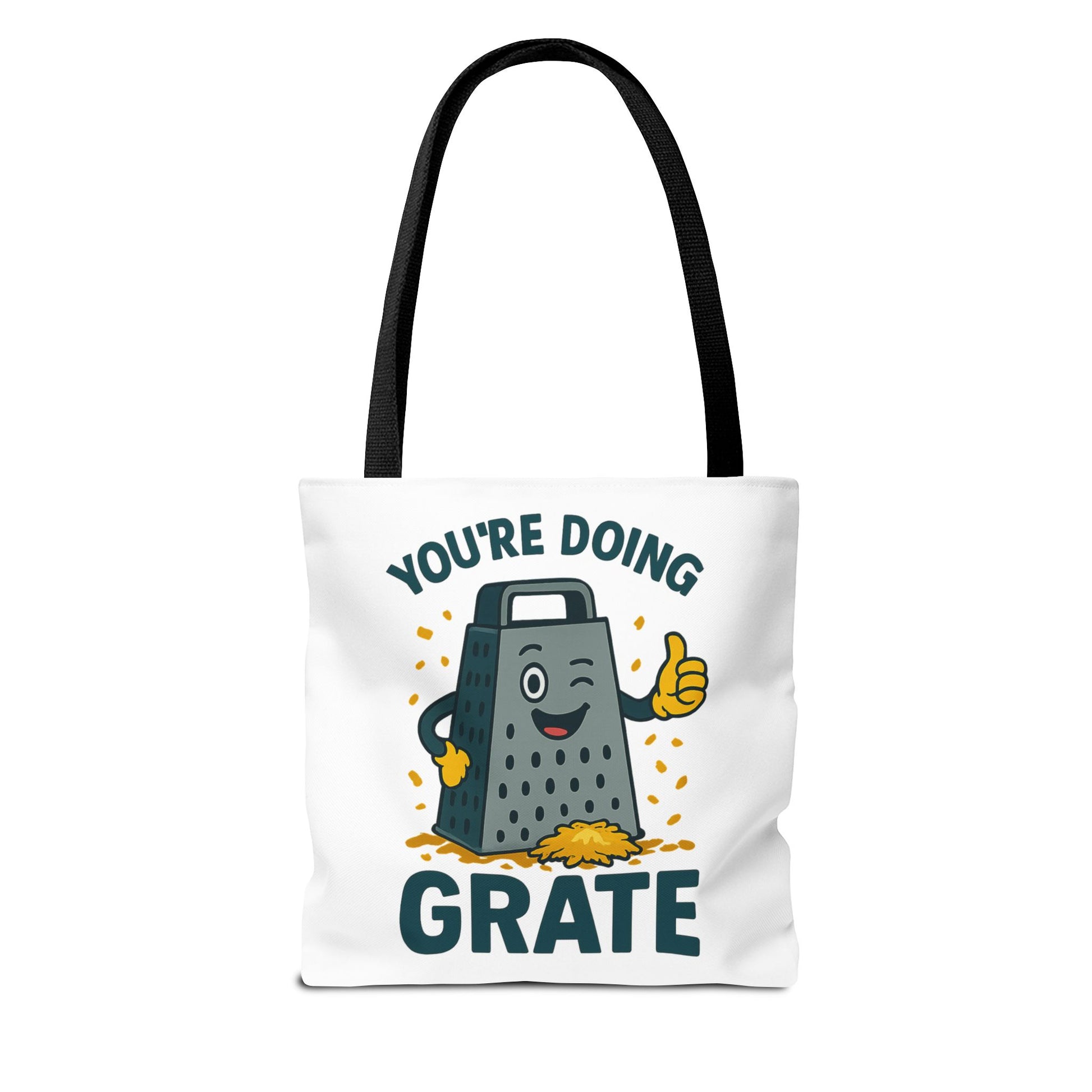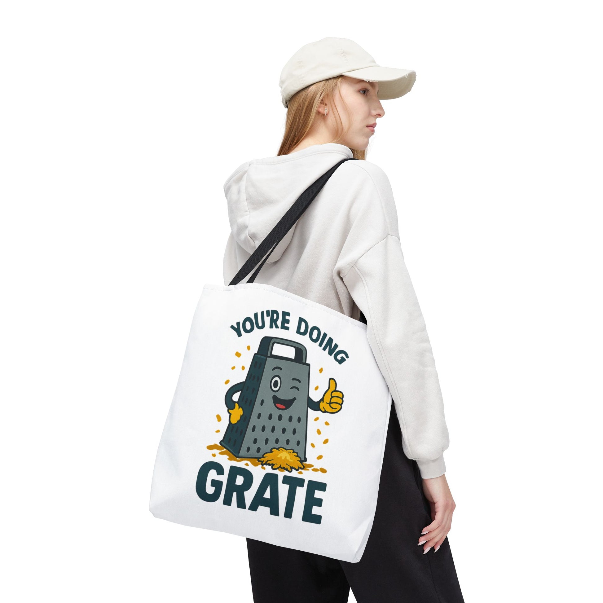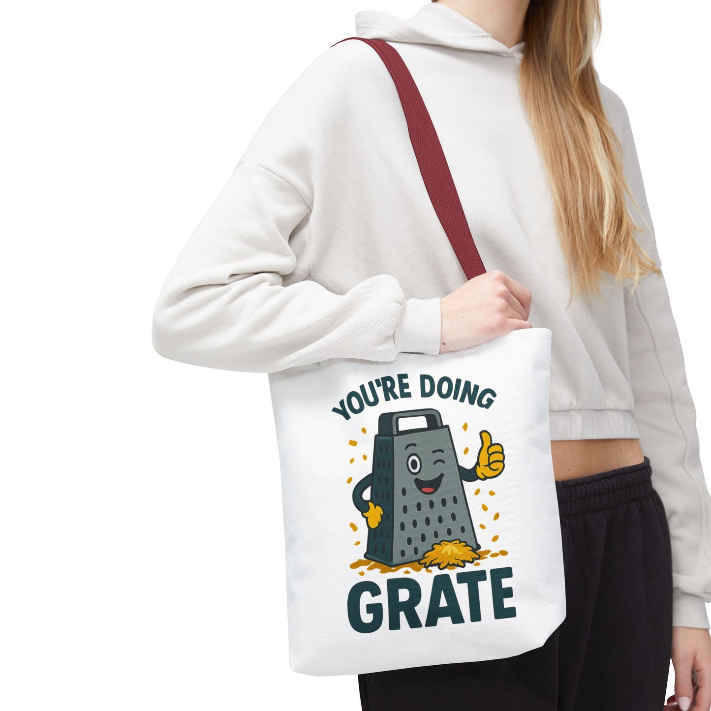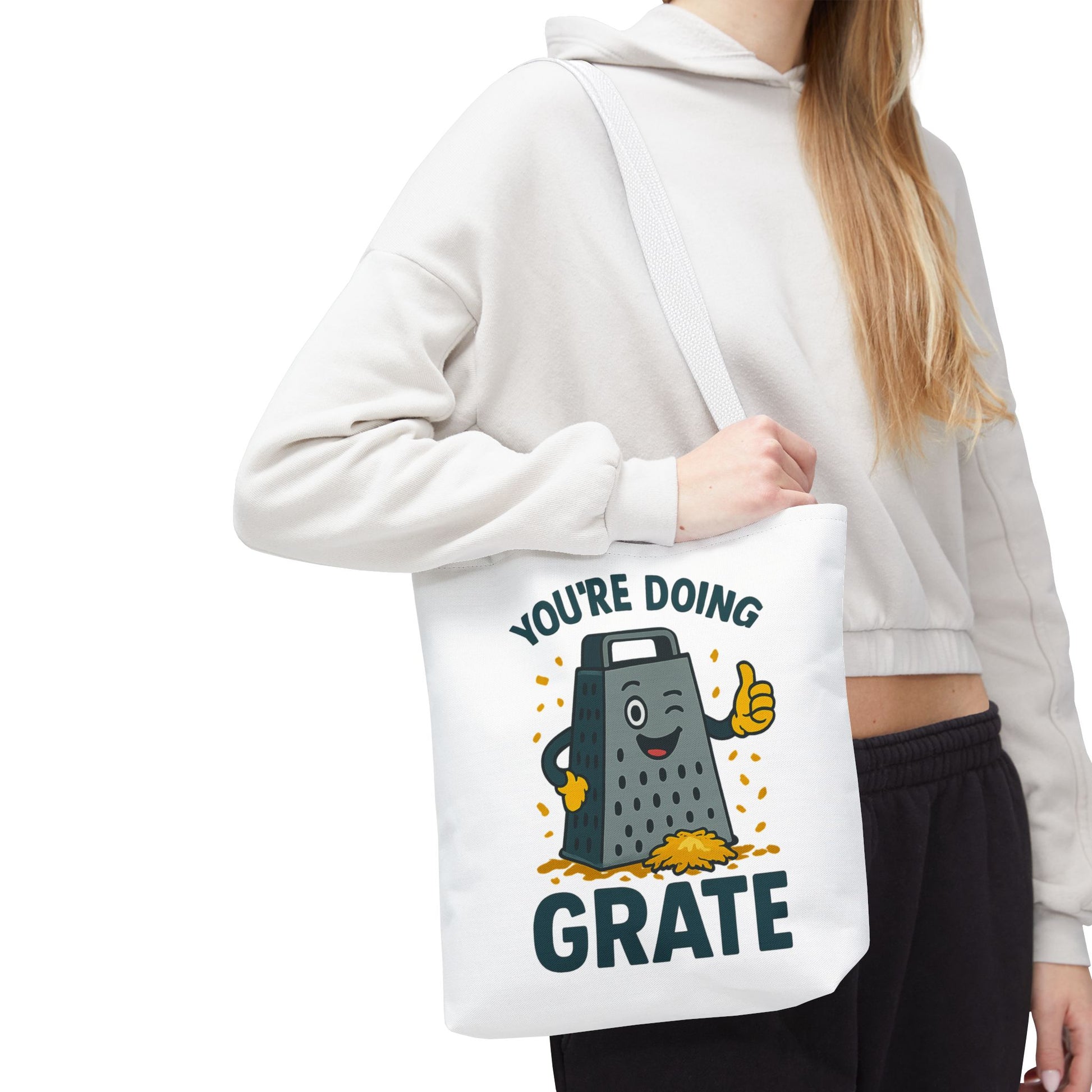 Cheer someone on while carrying all the things with this adorable “You’re Doing Grate” tote bag!