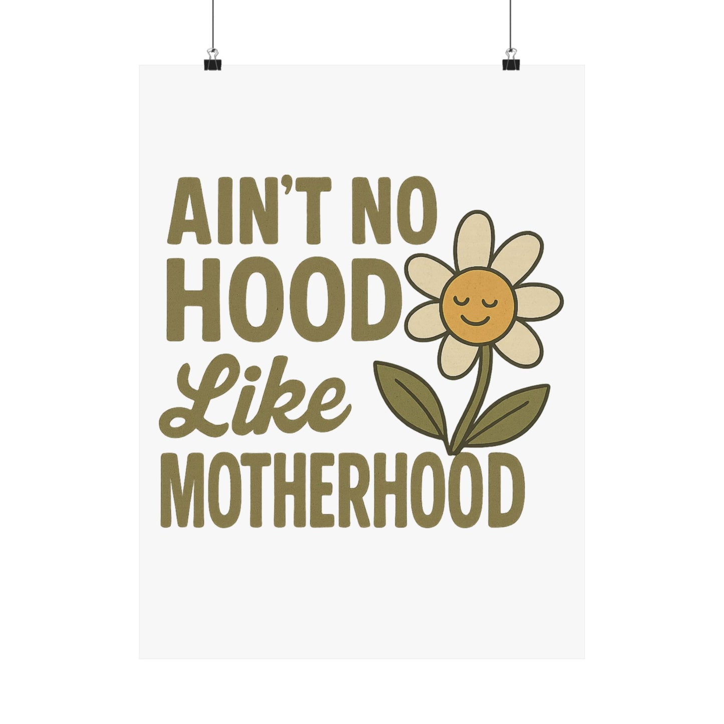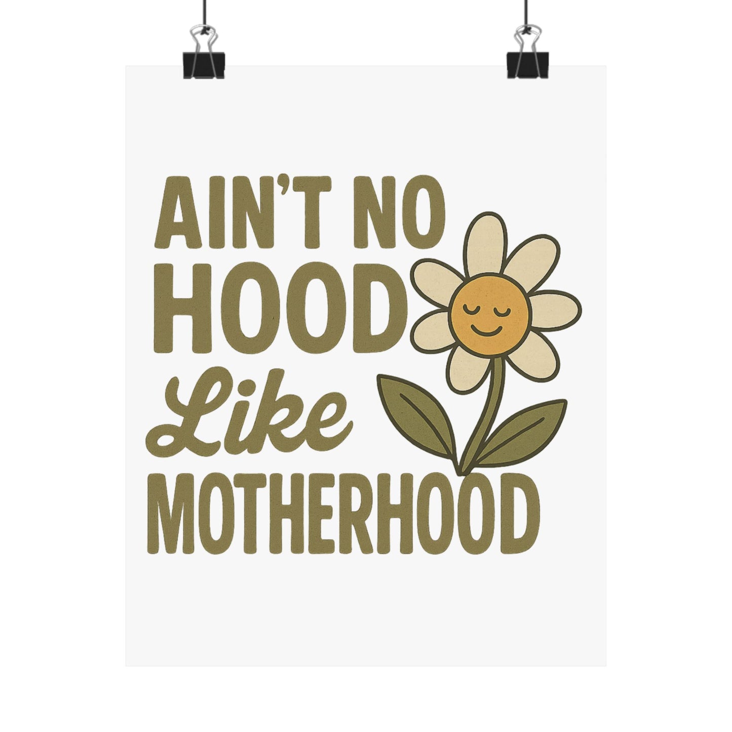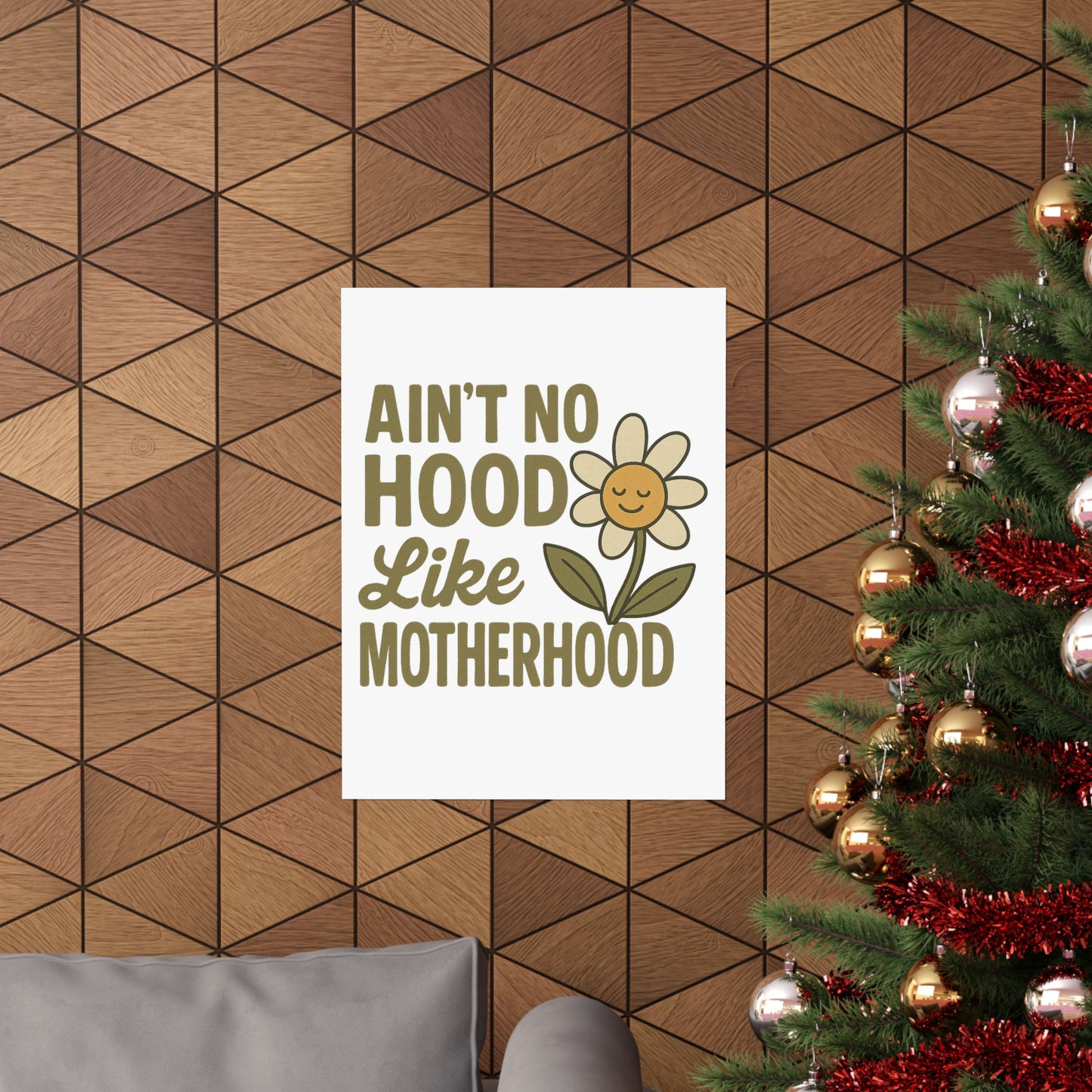 A fun poster with the phrase 'Ain't No Hood Like Motherhood'. This poster is perfect for mothers who want to showcase their love for motherhood in a stylish way. It can be a great addition to a home office, nursery, or living room. Ideal for Mother's Day, birthdays, baby showers, or just to show appreciation for moms.