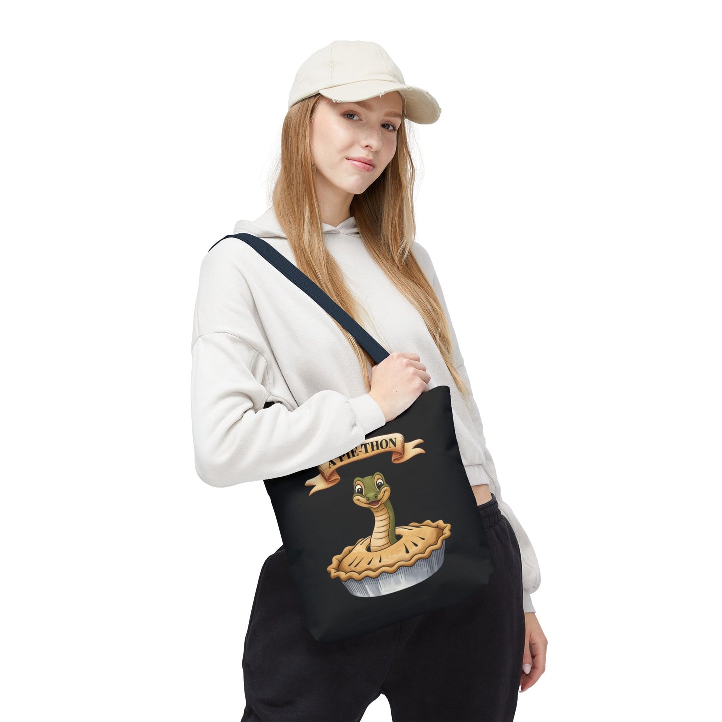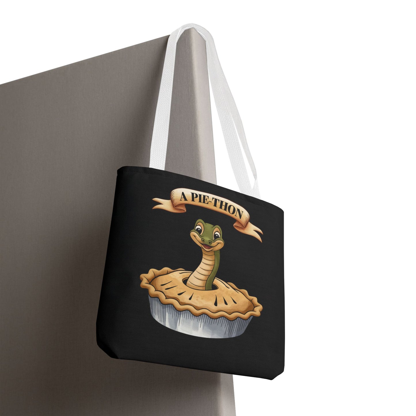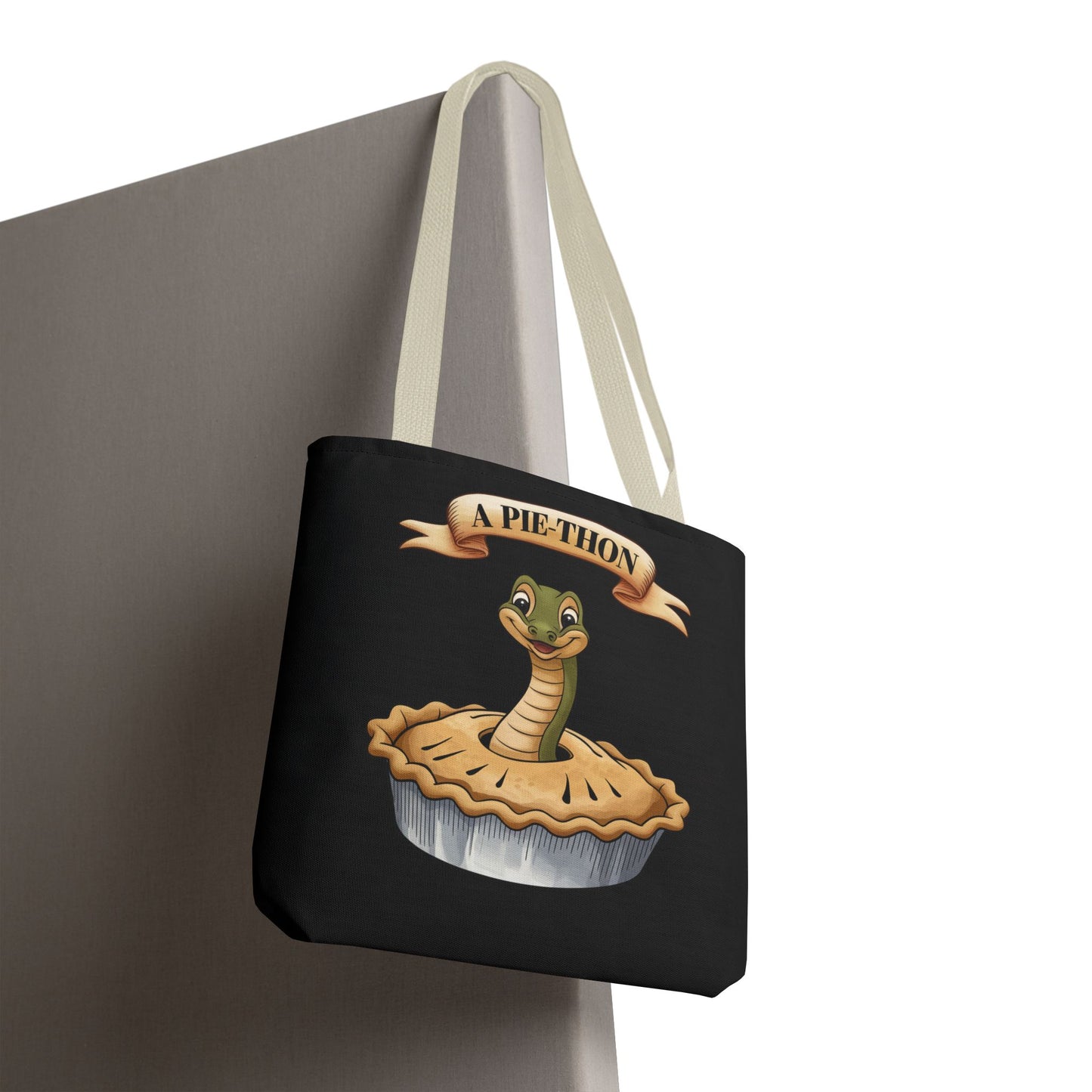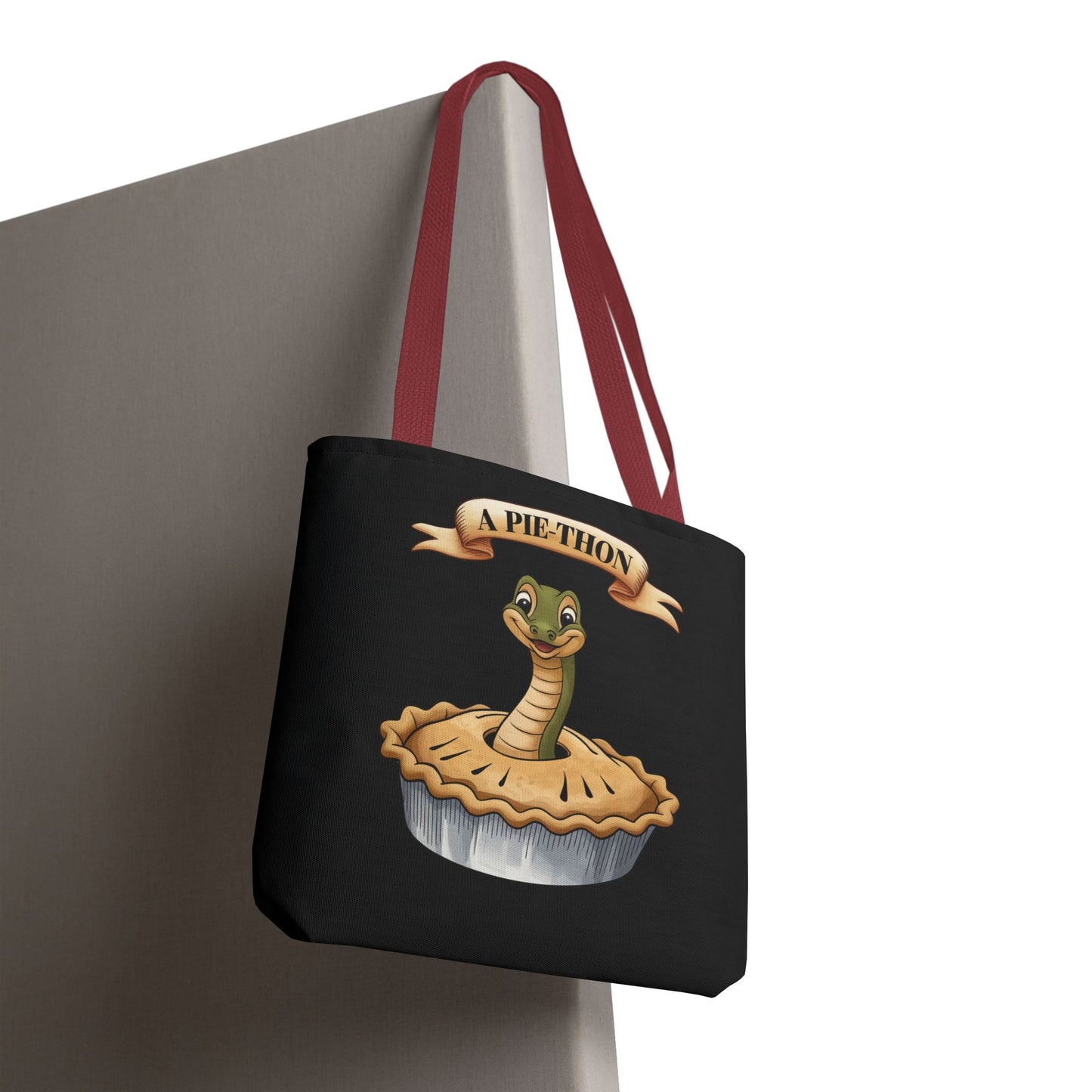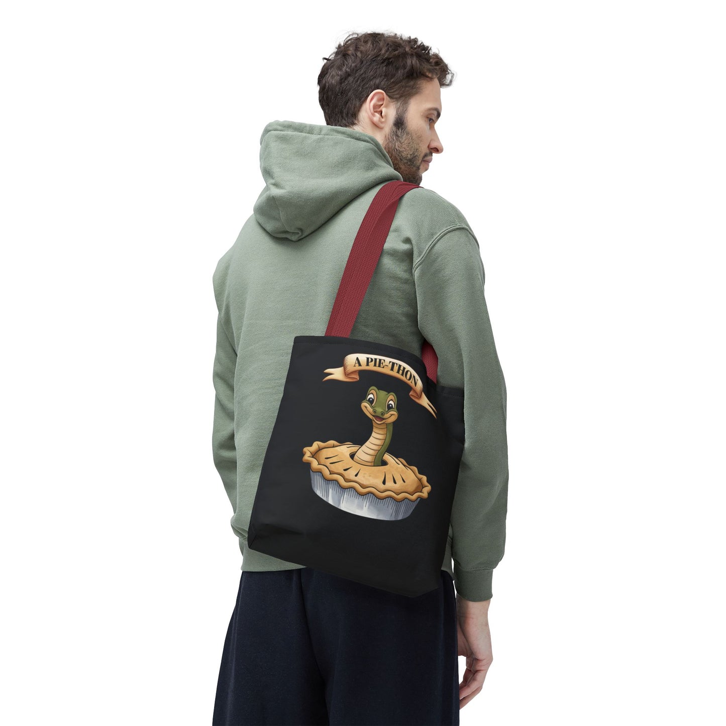 A fun tote bag with a joke on it of a snake coming out of a pie and saying "Pie-Thon". This tote bag is perfect for carrying groceries, books, or everyday essentials with a touch of humor. It's relevant for snake enthusiasts, pun lovers, and those who enjoy unique accessories. Great for gifting on April Fool's Day or to any comedy lover.