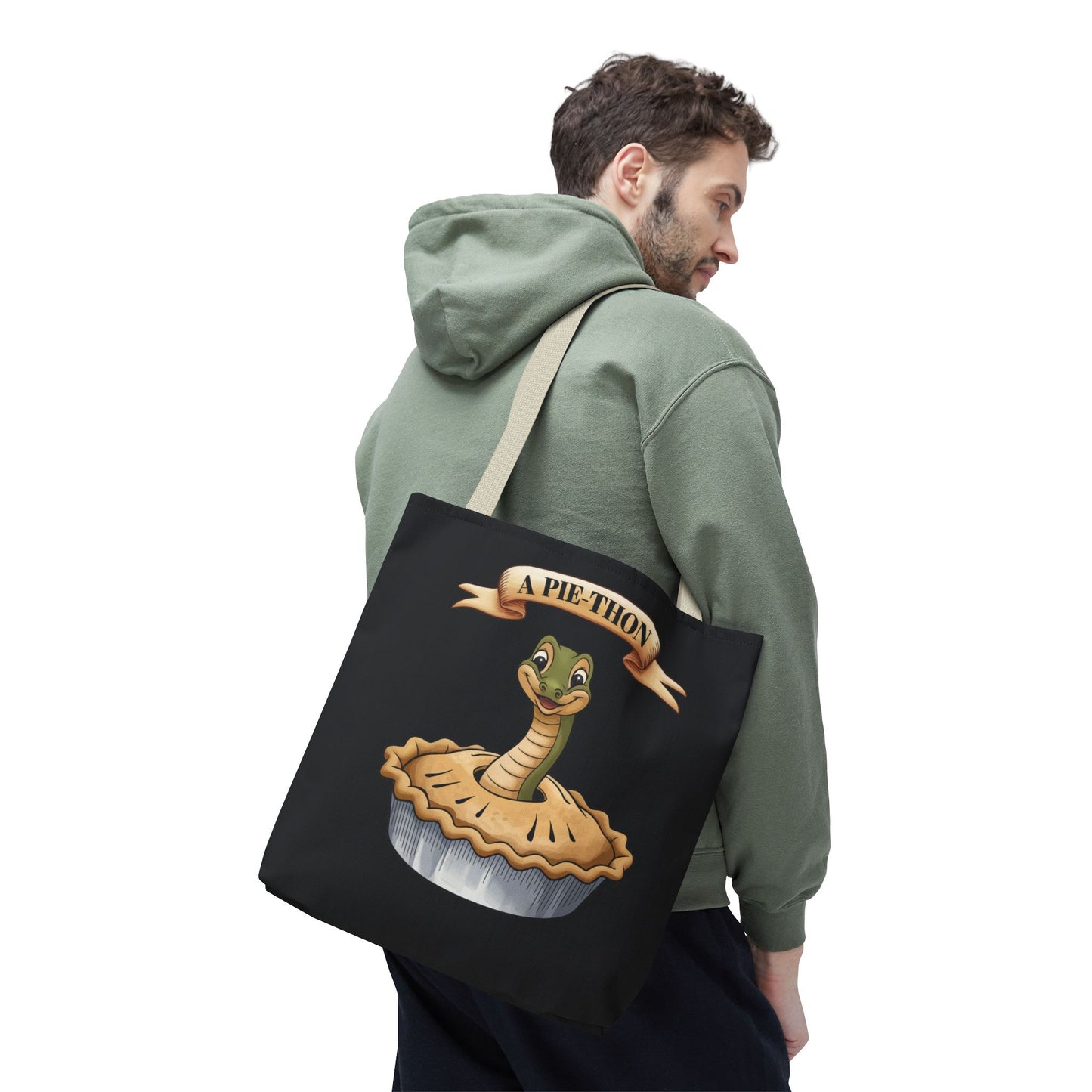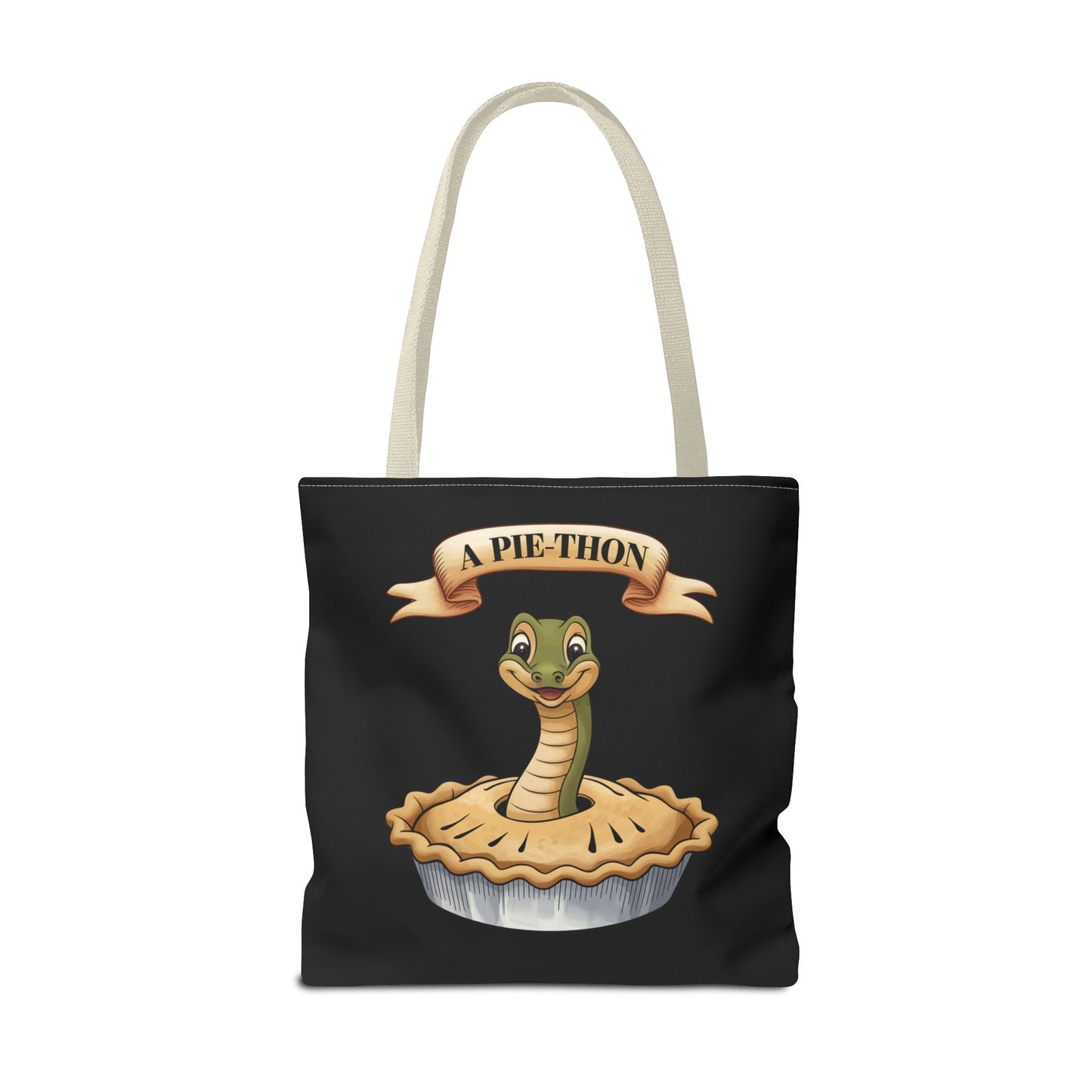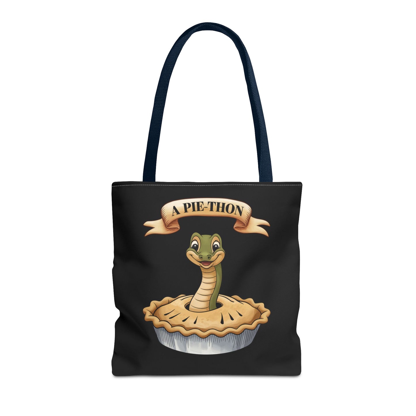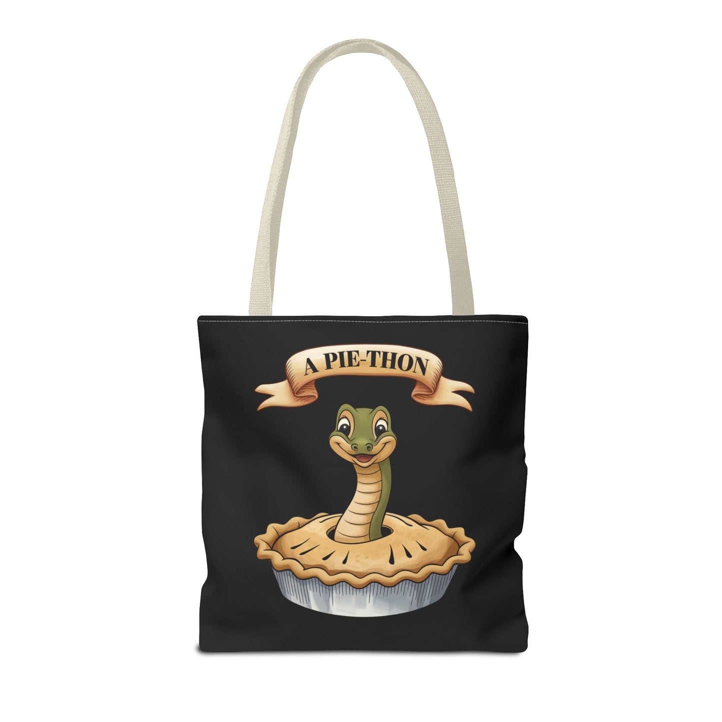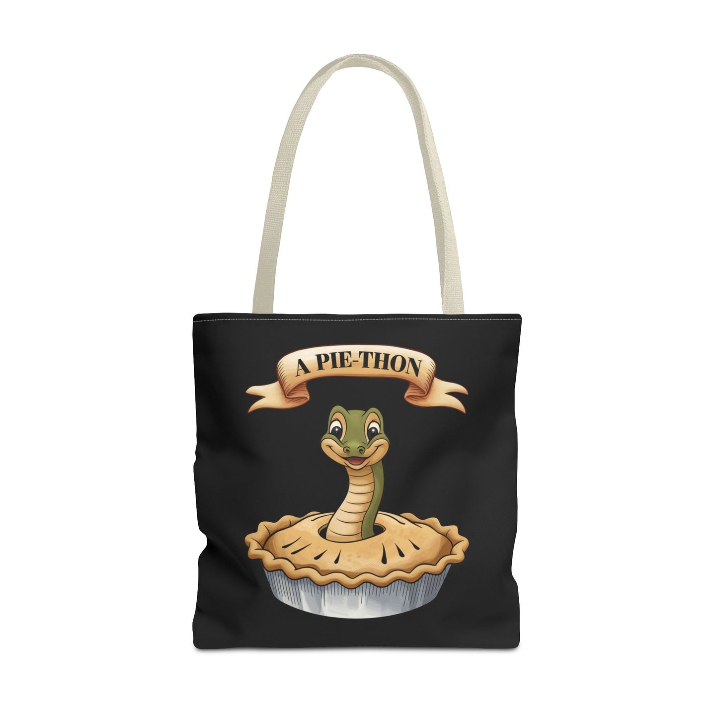 A fun tote bag with a joke on it of a snake coming out of a pie and saying "Pie-Thon". This tote bag is perfect for carrying groceries, books, or everyday essentials with a touch of humor. It's relevant for snake enthusiasts, pun lovers, and those who enjoy unique accessories. Great for gifting on April Fool's Day or to any comedy lover.