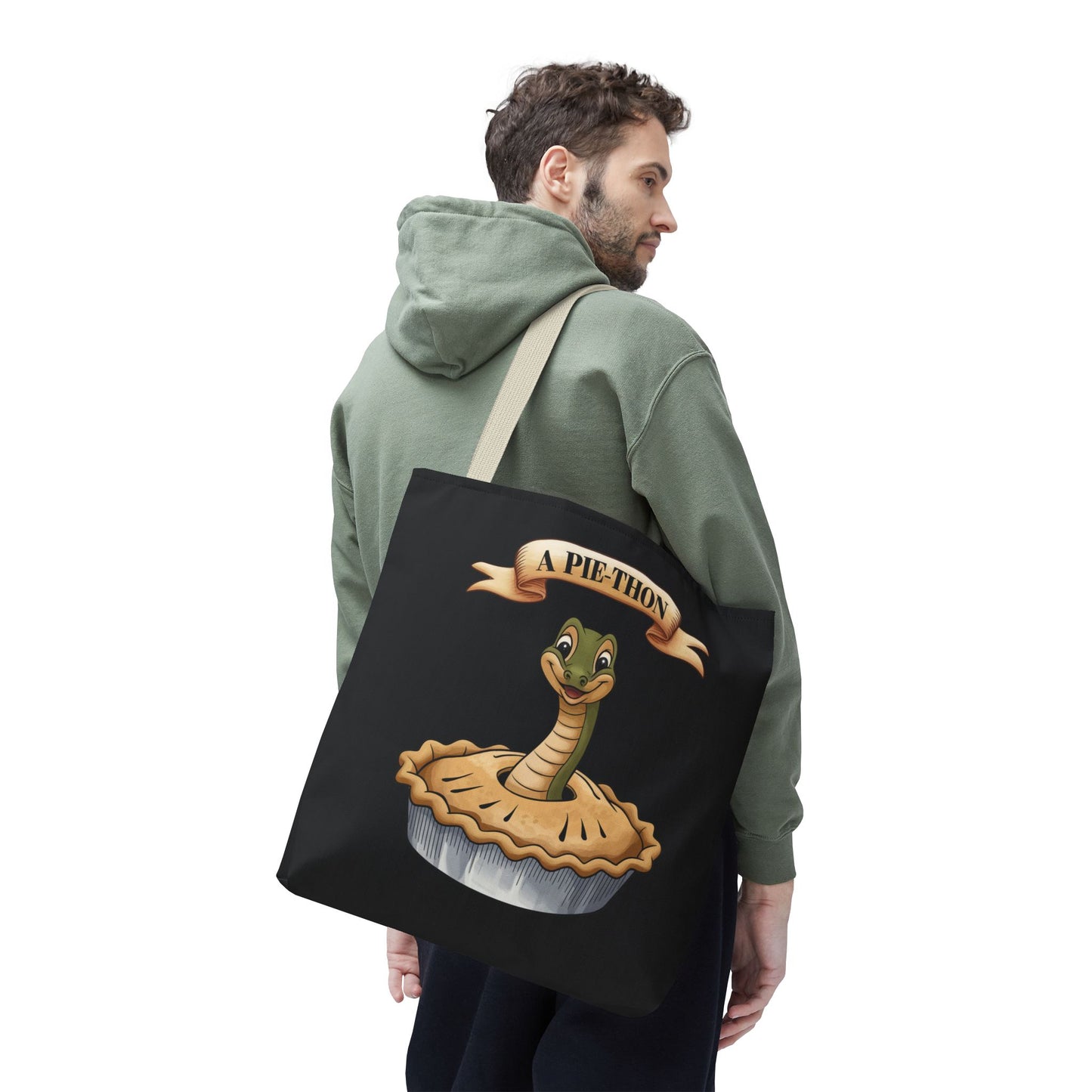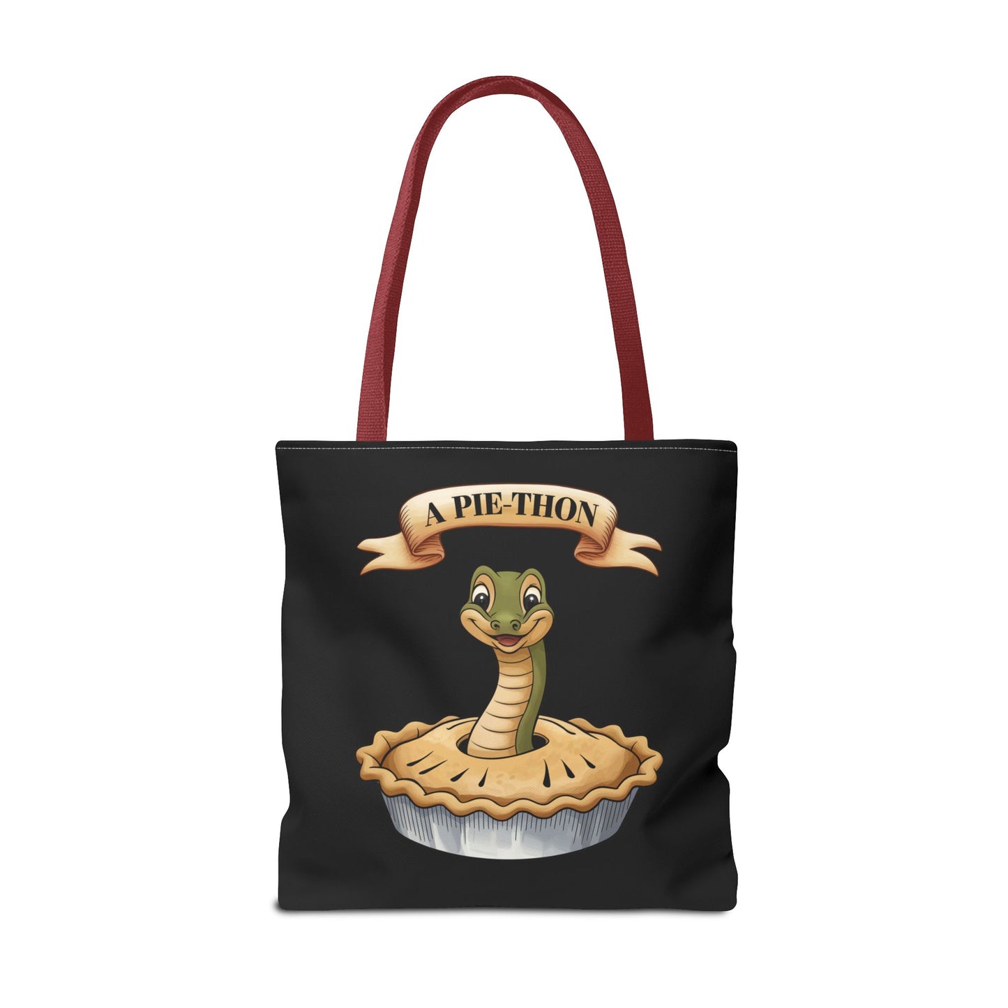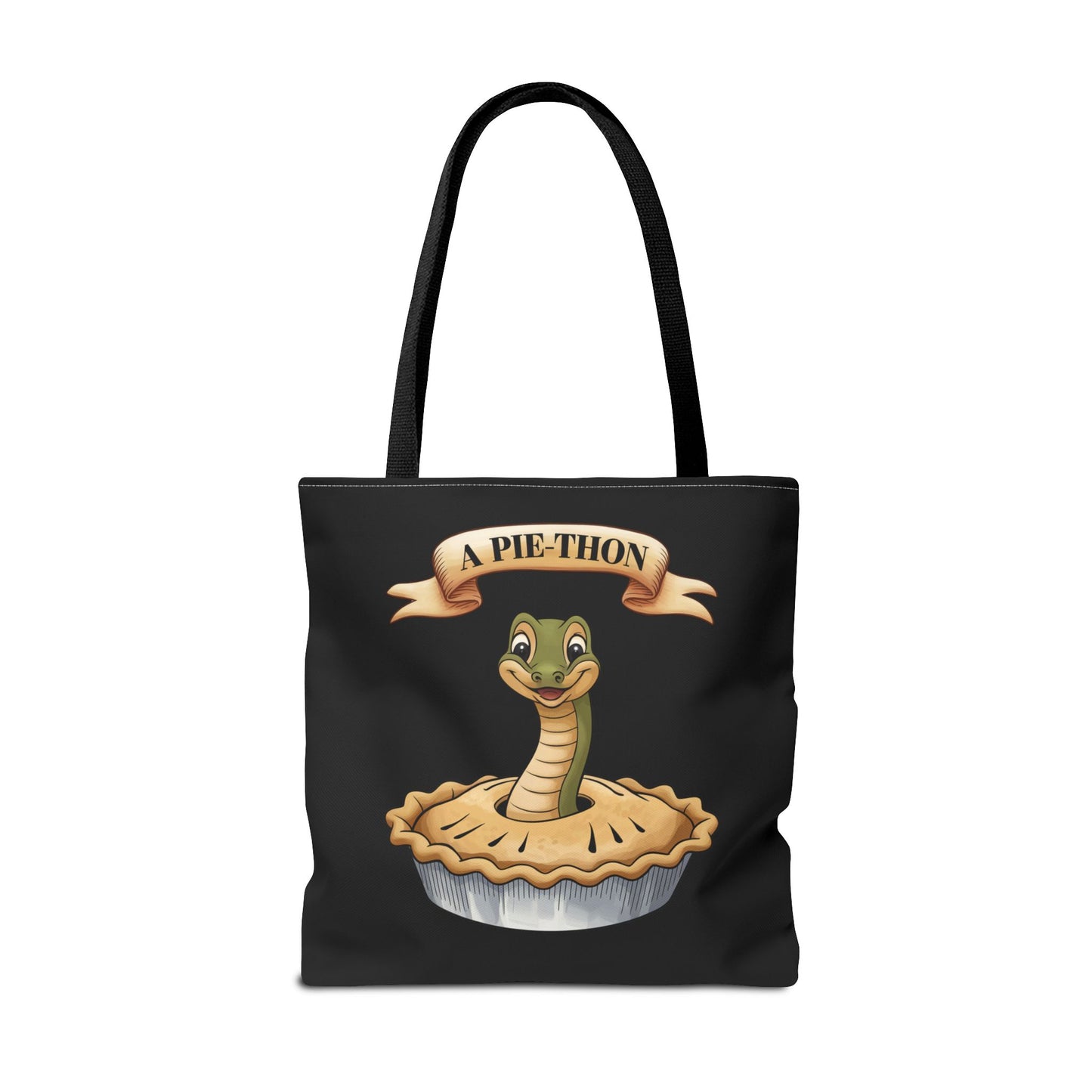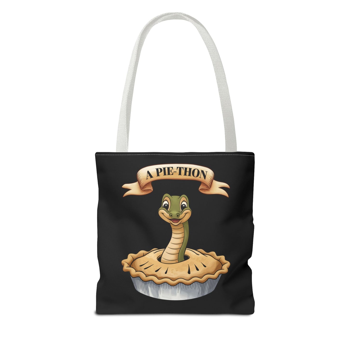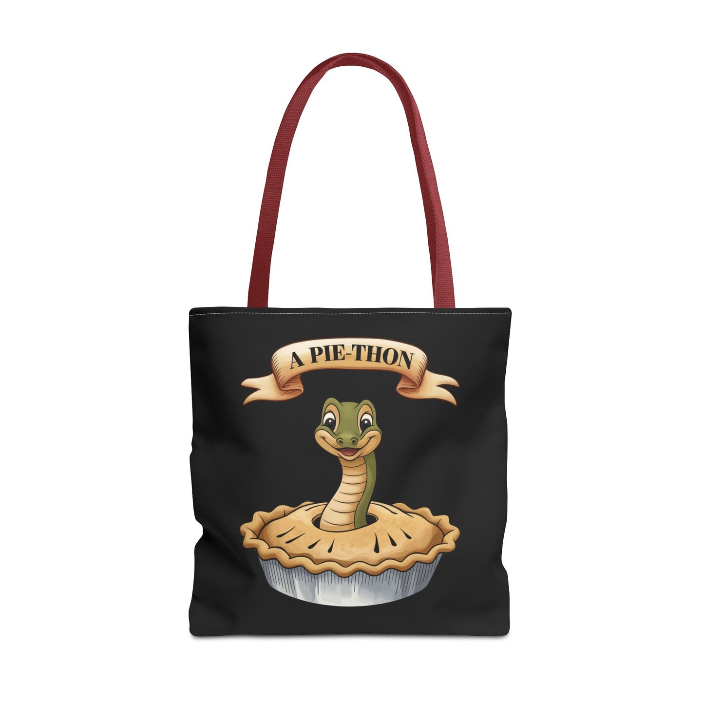 A fun tote bag with a joke on it of a snake coming out of a pie and saying "Pie-Thon". This tote bag is perfect for carrying groceries, books, or everyday essentials with a touch of humor. It's relevant for snake enthusiasts, pun lovers, and those who enjoy unique accessories. Great for gifting on April Fool's Day or to any comedy lover.