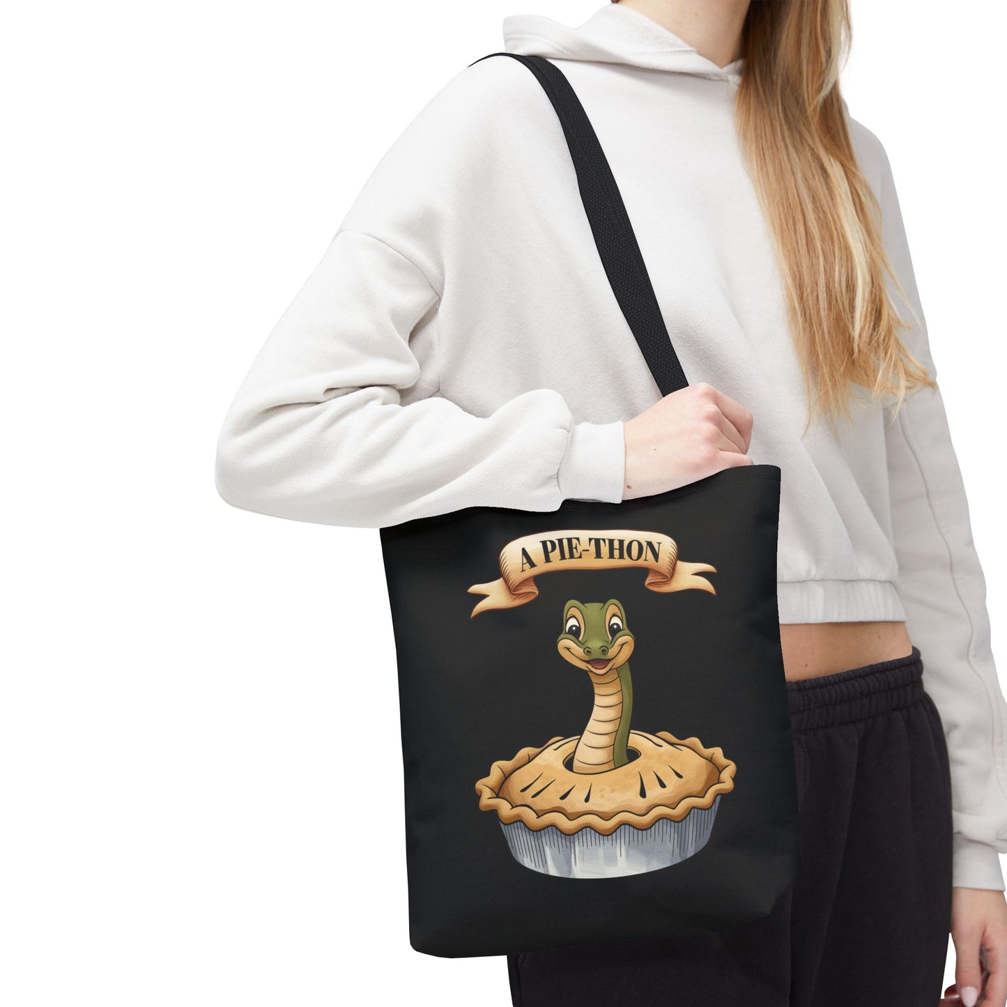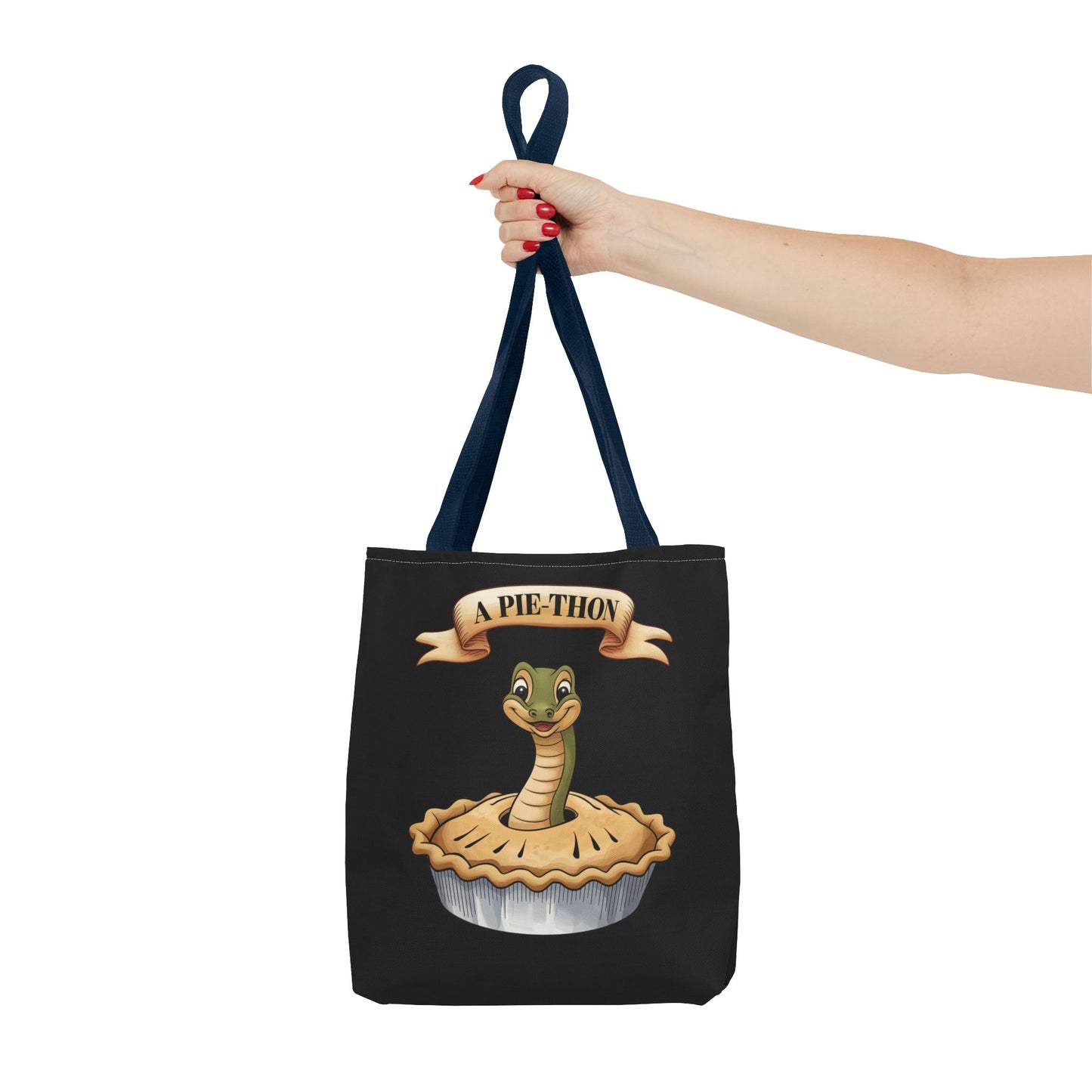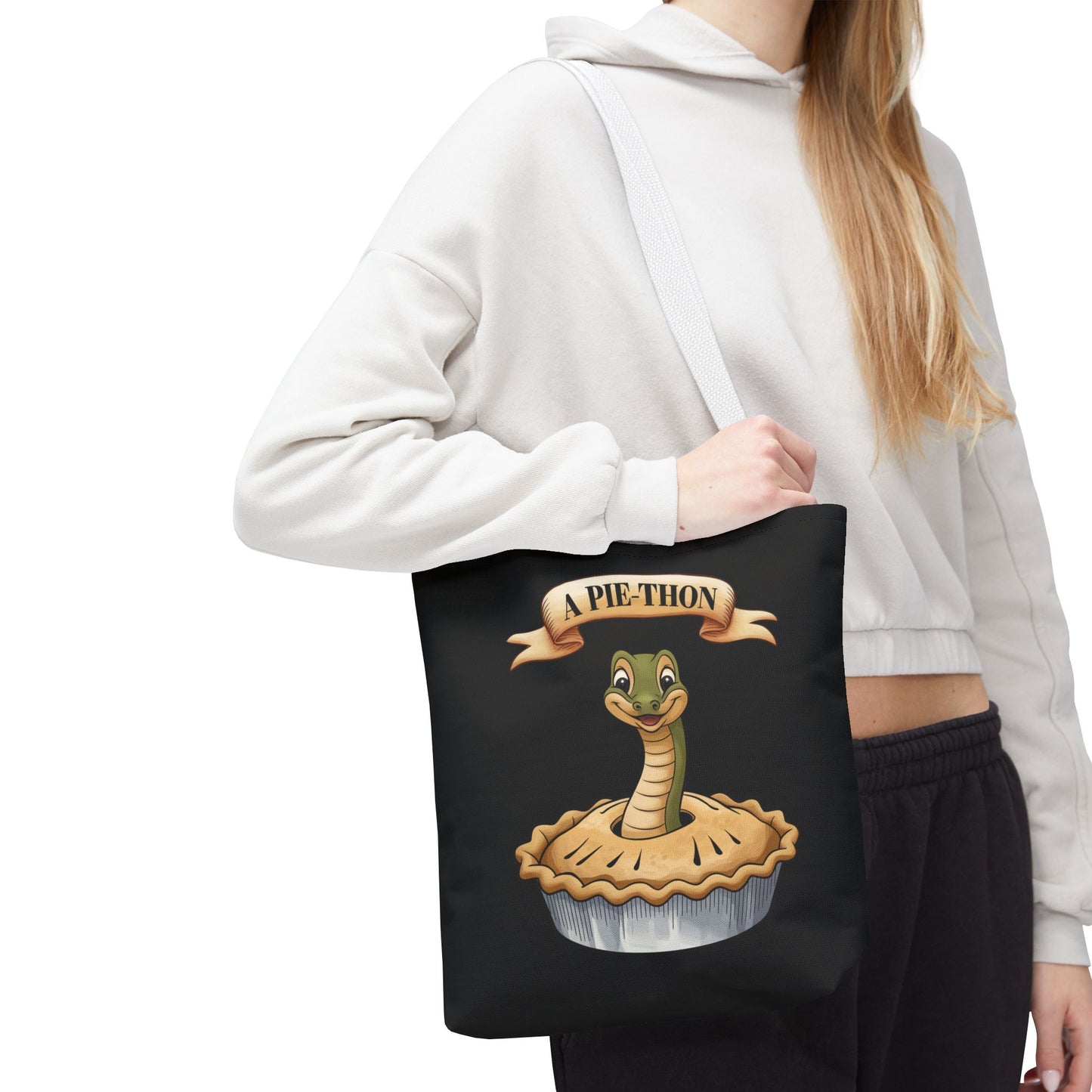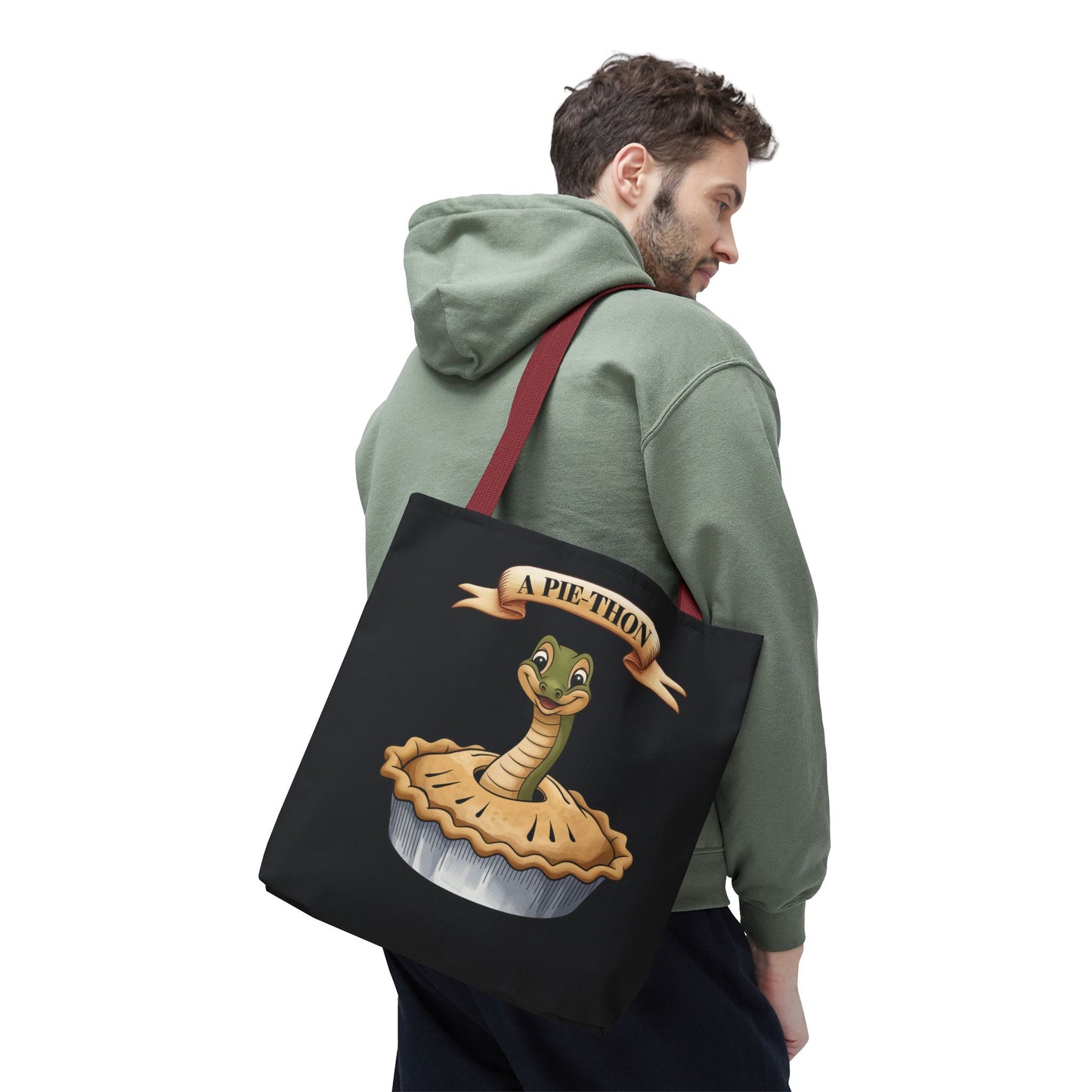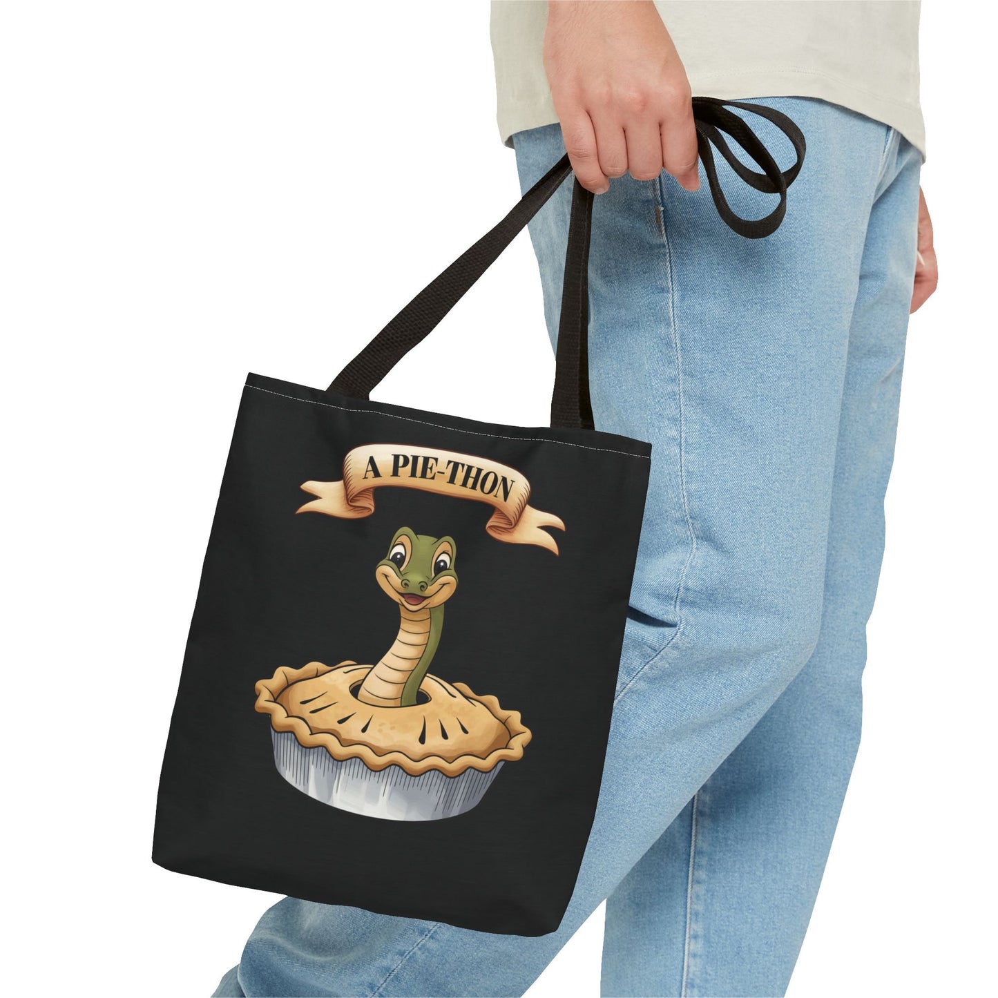 A fun tote bag with a joke on it of a snake coming out of a pie and saying "Pie-Thon". This tote bag is perfect for carrying groceries, books, or everyday essentials with a touch of humor. It's relevant for snake enthusiasts, pun lovers, and those who enjoy unique accessories. Great for gifting on April Fool's Day or to any comedy lover.