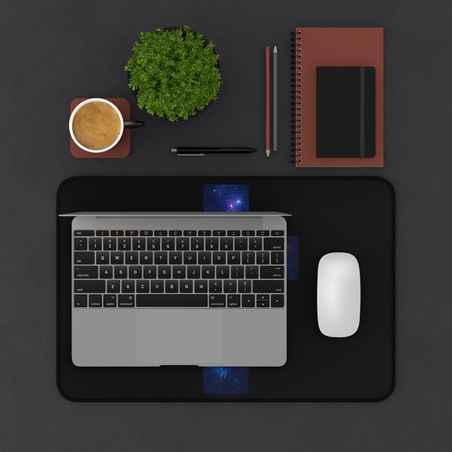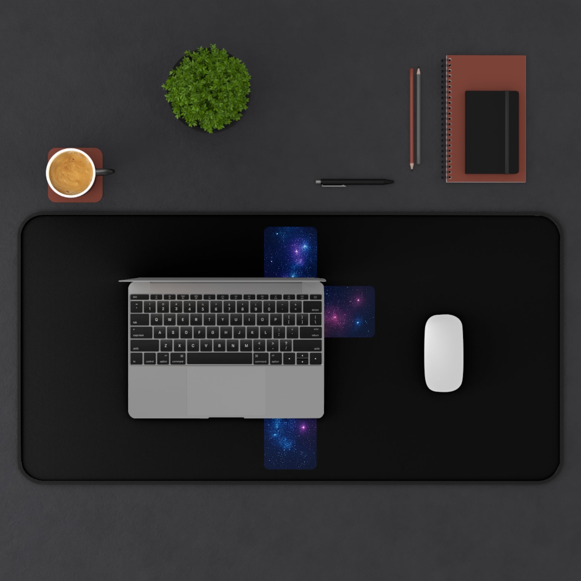 A fun desk mat with a galactic cross design, perfect for adding a touch of whimsy and personality to your workspace. Ideal for those who enjoy cosmic themes and want to spice up their desk setup. Relevant for back-to-school shopping, office decor, or as a gift for a sci-fi enthusiast.