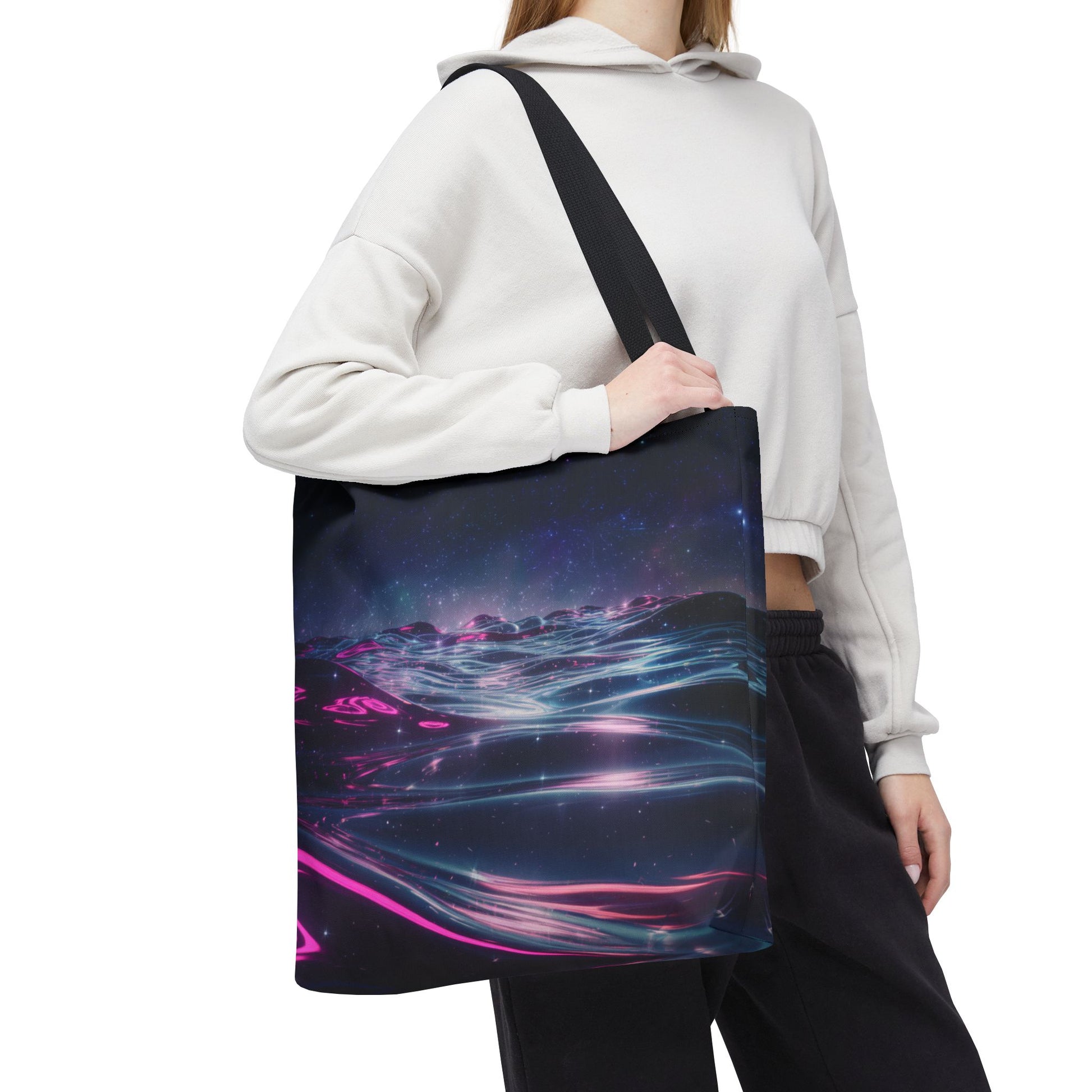 Ride the glow of the future with this Neon Wave Horizon Tote Bag, featuring a stunning sci-fi ocean design illuminated with vibrant pink and blue light streaks. The surreal landscape and galactic night sky make this tote a statement piece for anyone who loves futuristic art, retrowave aesthetics, or cosmic-inspired fashion. Durable, stylish, and eco-friendly — it’s your go-to bag for daily adventures or gifting with a bold twist.