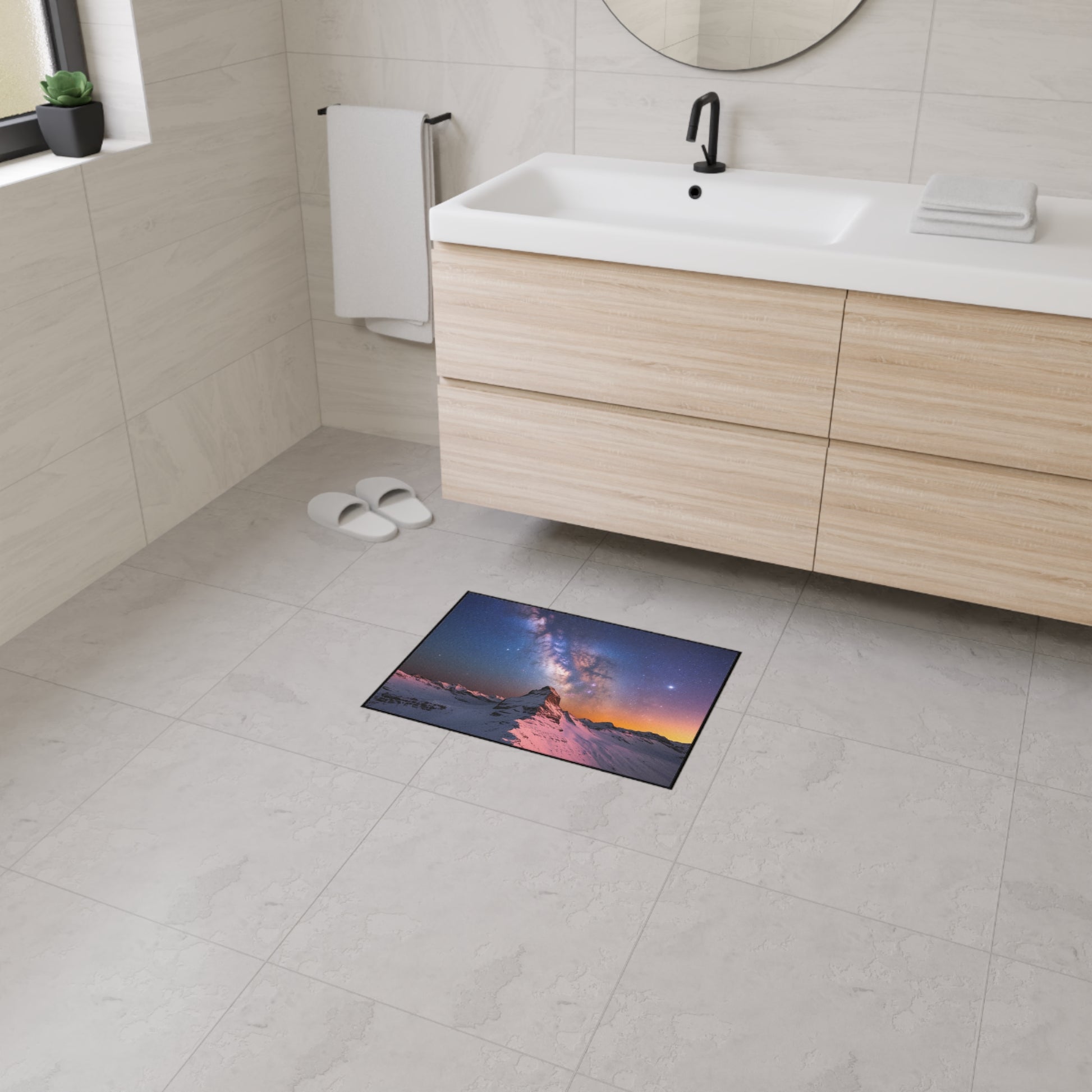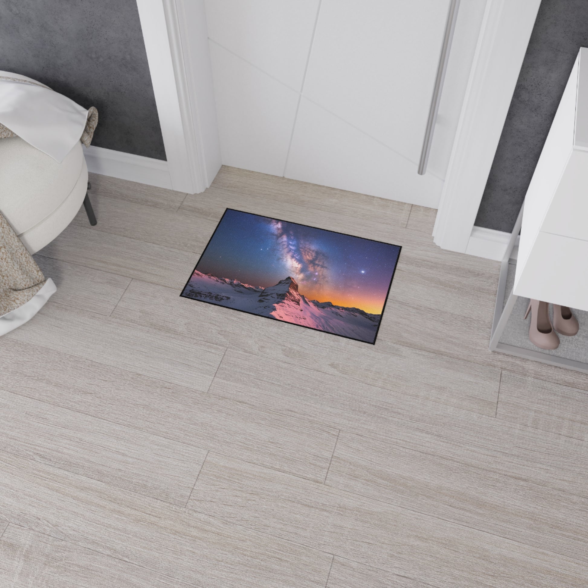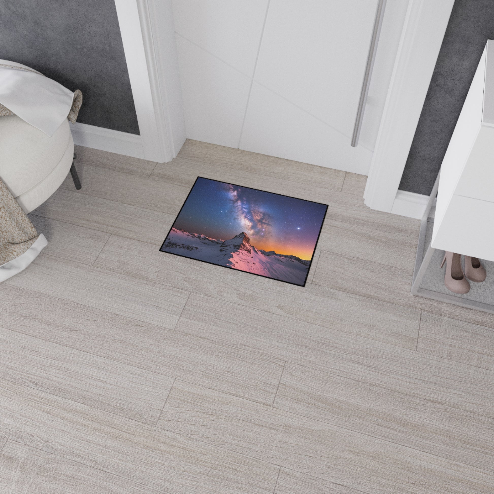 Bring the breathtaking beauty of the cosmos to your doorstep with our Galaxy Landscape Heavy-Duty Floor Mat. ๐ Featuring a stunning vista of a snow-covered mountain range under a mesmerizing starlit sky and the Milky Way, this mat adds a touch of celestial wonder to your home decor. Crafted for durability with a non-slip backing, it's both a visually captivating piece and a practical addition to your entryway or any room. Welcome guests with an awe-inspiring glimpse of the universe.