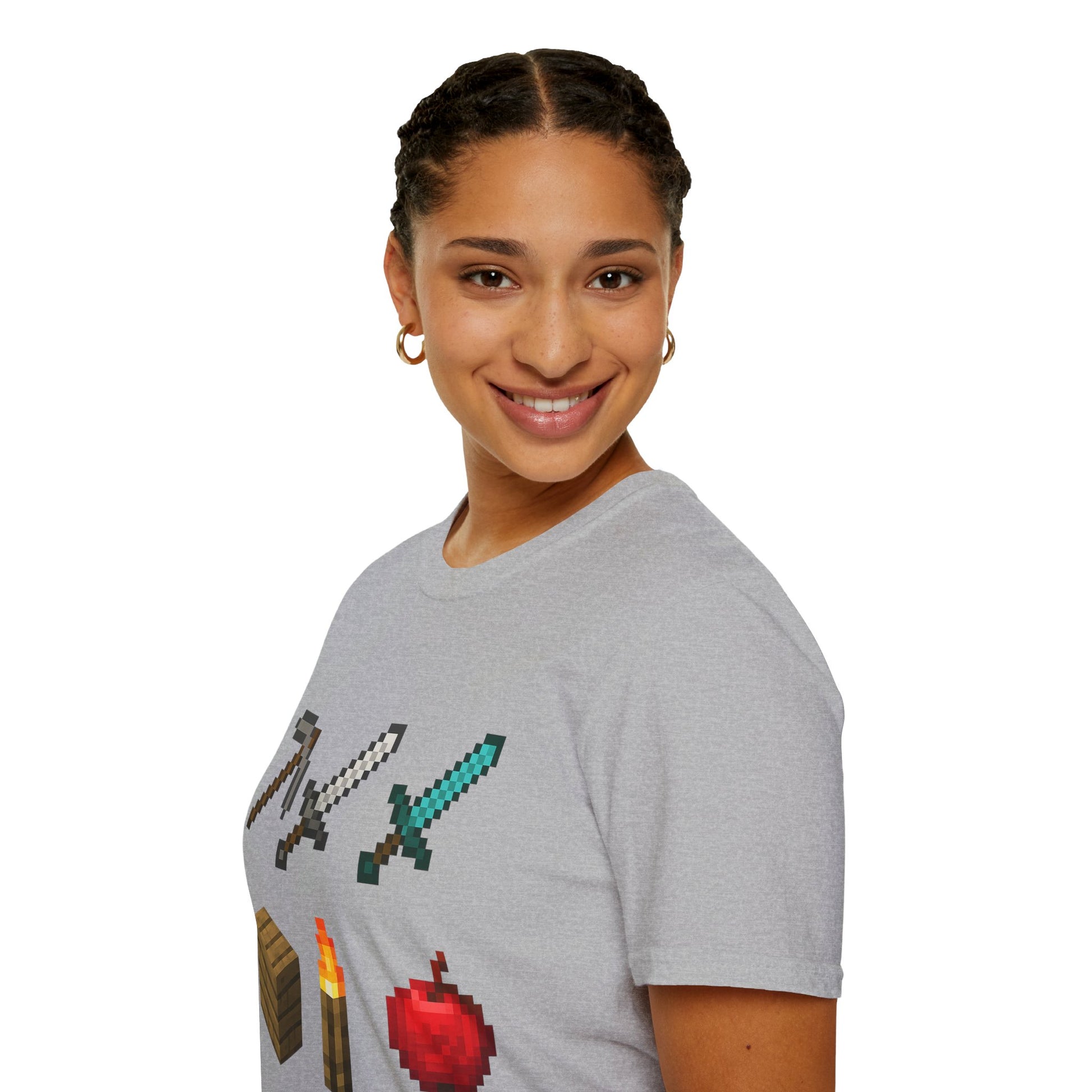 Our Pixel Tools & Items T-Shirt features a collection of iconic 8-bit style gear—perfect for gamers, streamers, and retro gaming fans alike. From swords and pickaxes to blocks and apples, it’s like wearing your inventory IRL.