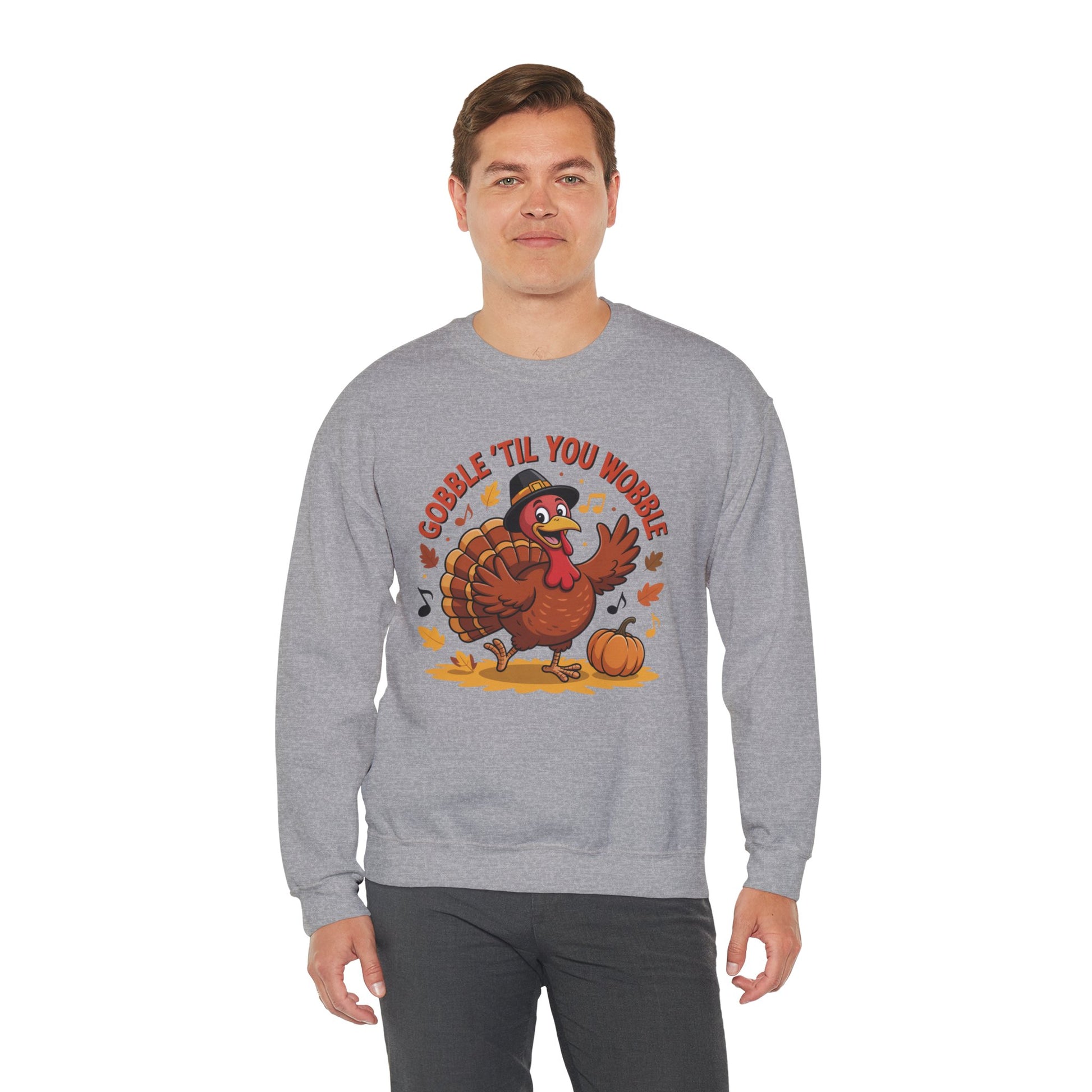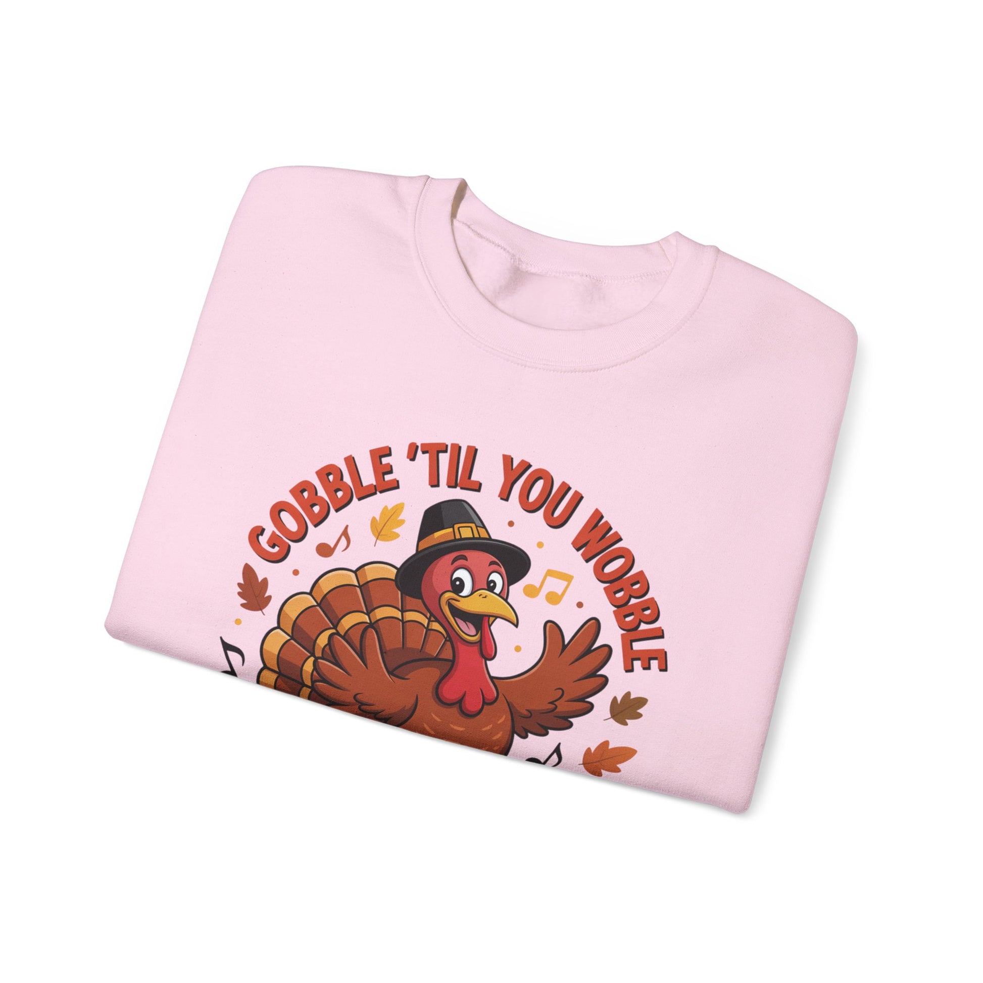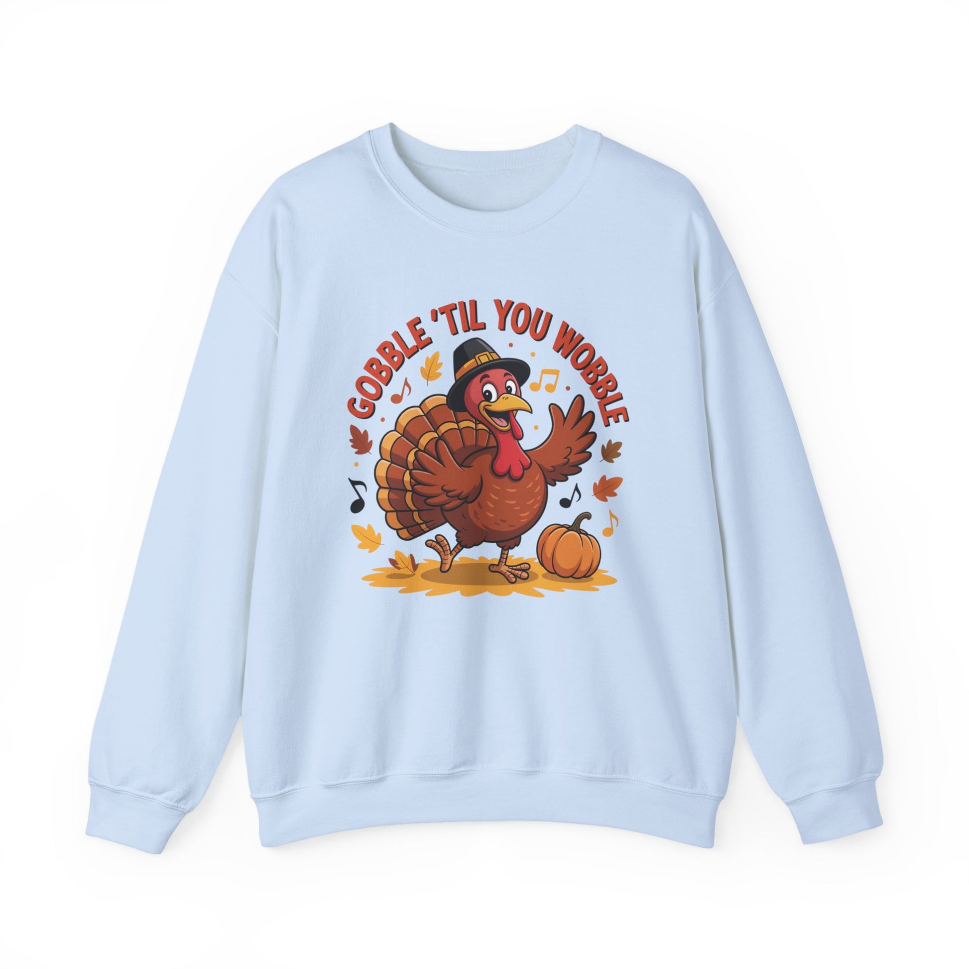Get festive and funny with this Gobble ’Til You Wobble Sweatshirt, featuring a cheerful cartoon turkey dancing with pumpkins, autumn leaves, and music notes. This cozy fall pullover is the perfect Thanksgiving crewneck for turkey day fun.