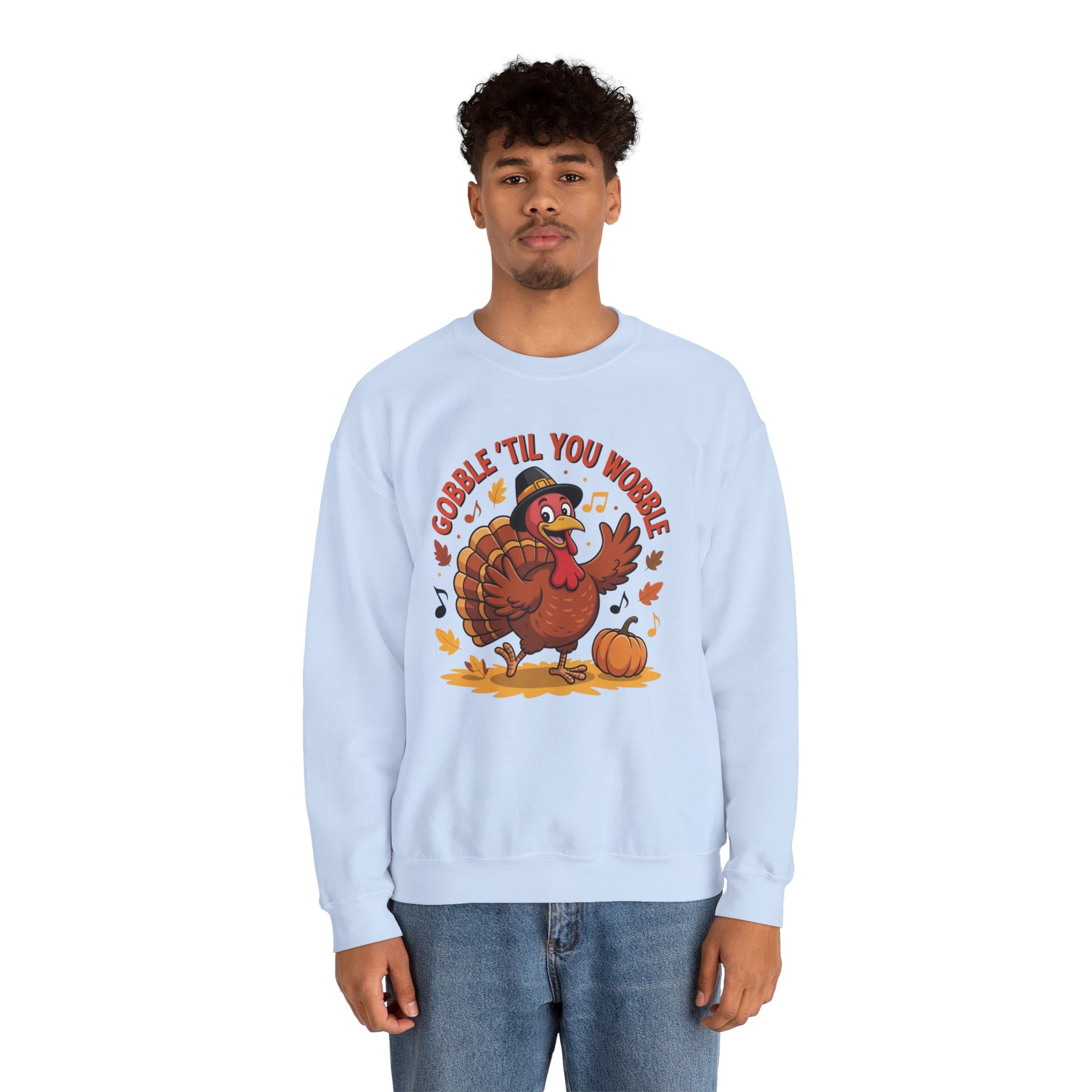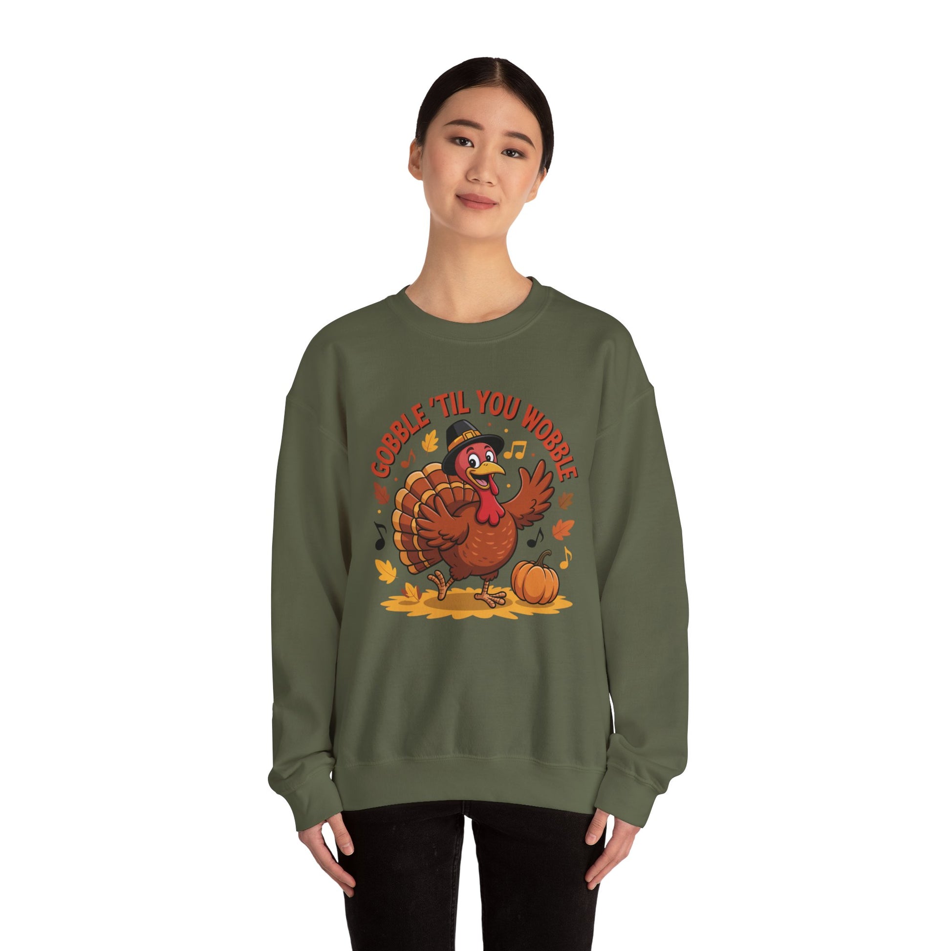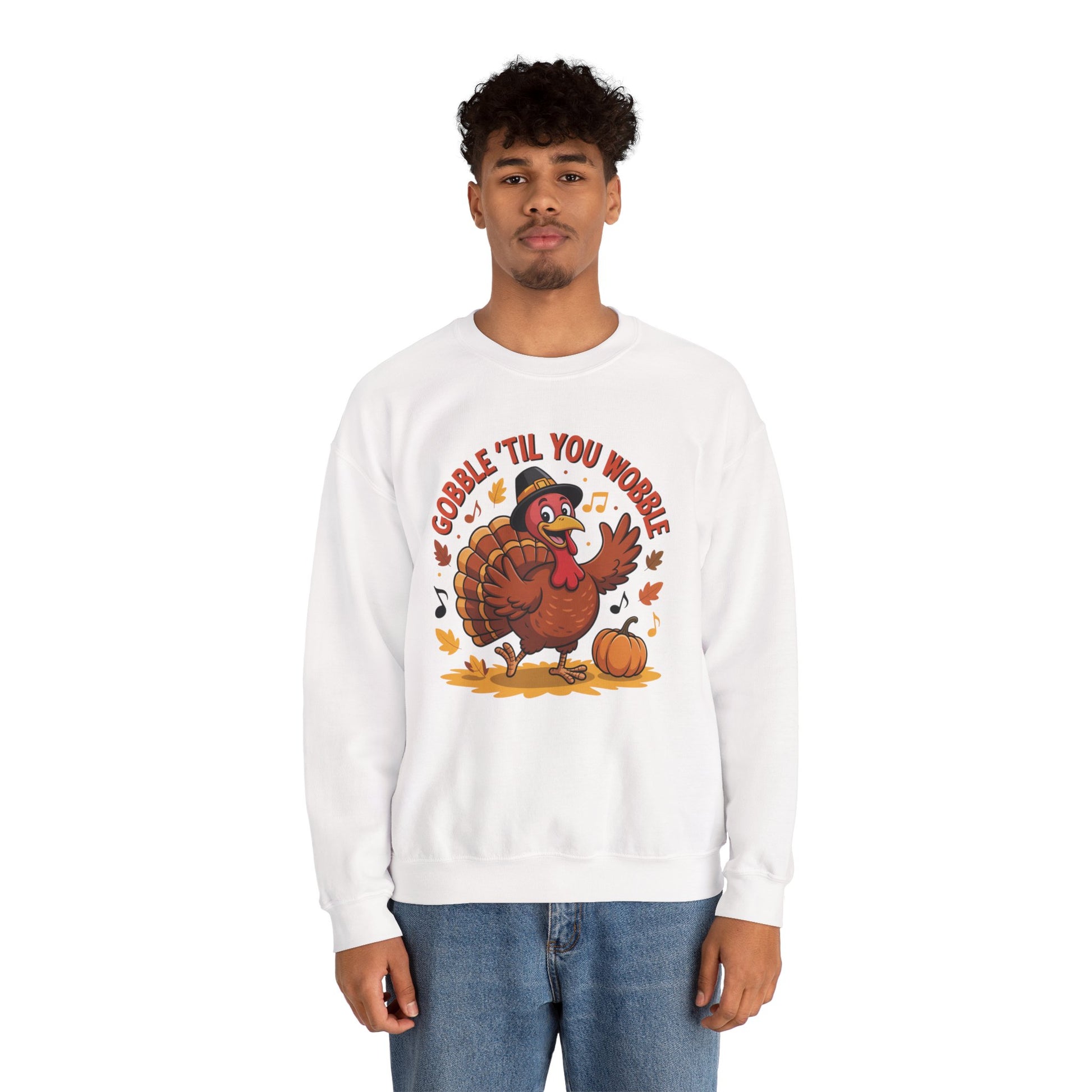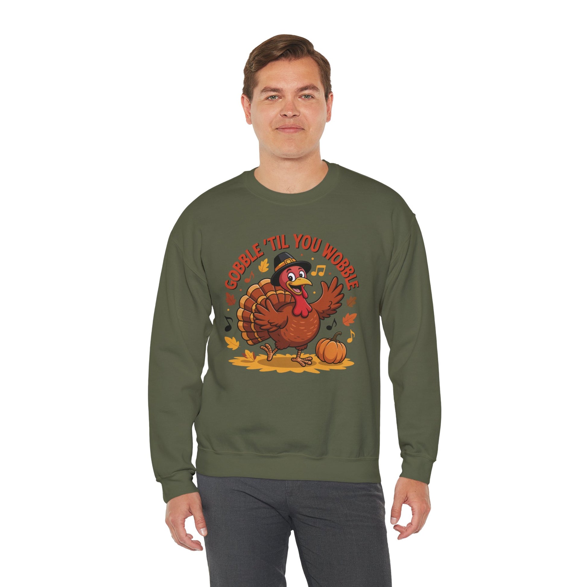 Get festive and funny with this Gobble ’Til You Wobble Sweatshirt, featuring a cheerful cartoon turkey dancing with pumpkins, autumn leaves, and music notes. This cozy fall pullover is the perfect Thanksgiving crewneck for turkey day fun.
