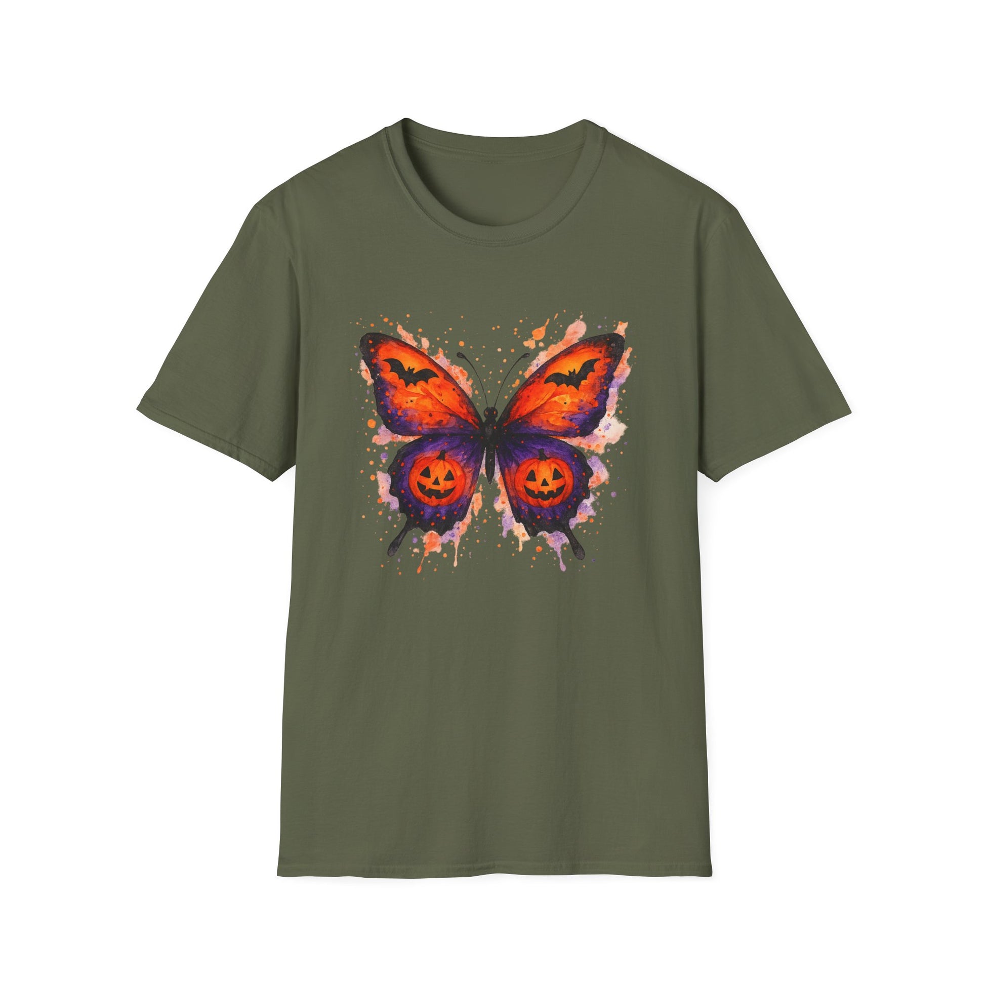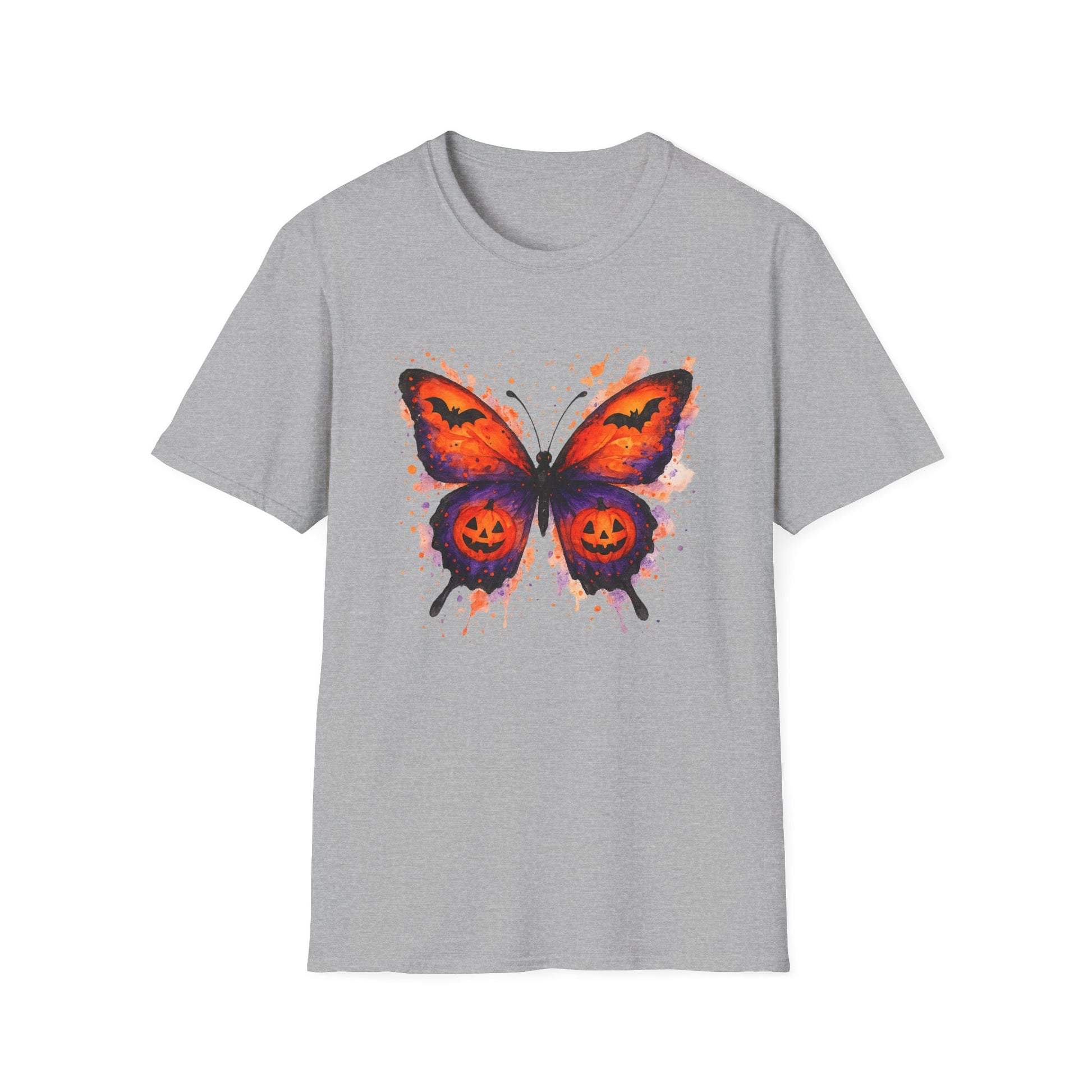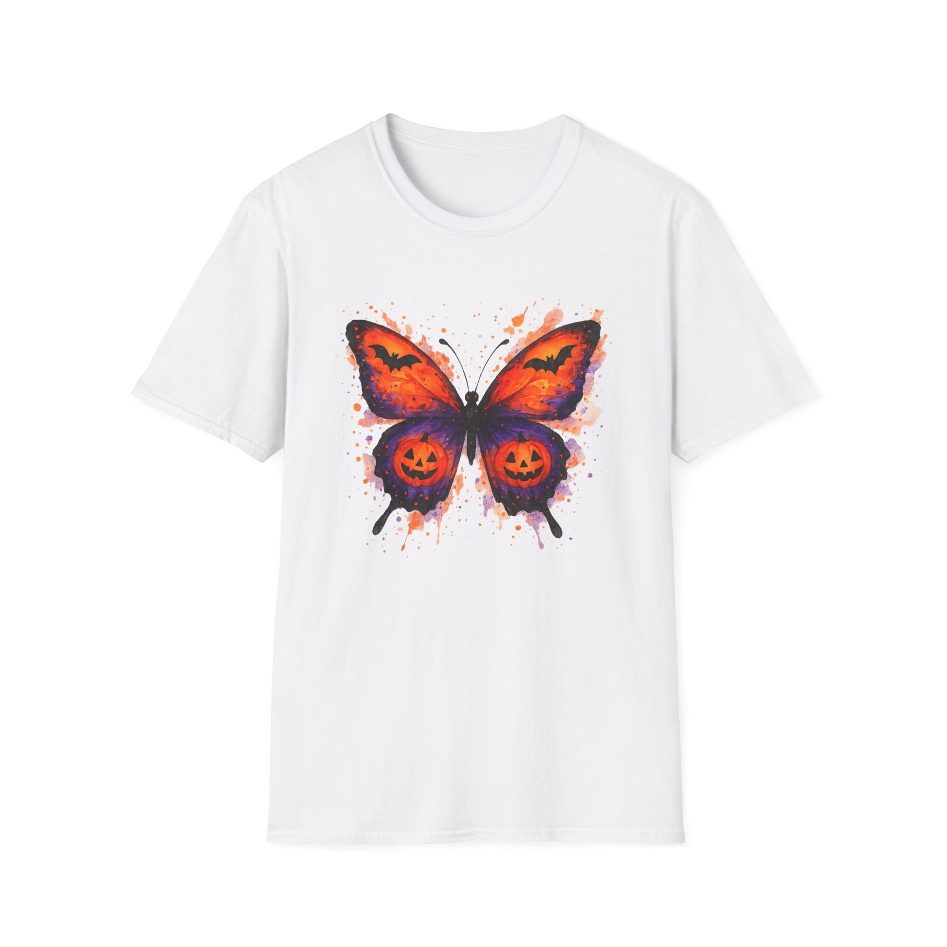Halloween Watercolor Butterfly T-Shirt - Pumpkin Butterfly Tee, Spooky Butterfly Shirt, Bat and Jack-O'Lantern Wings, Fall Aesthetic Tee