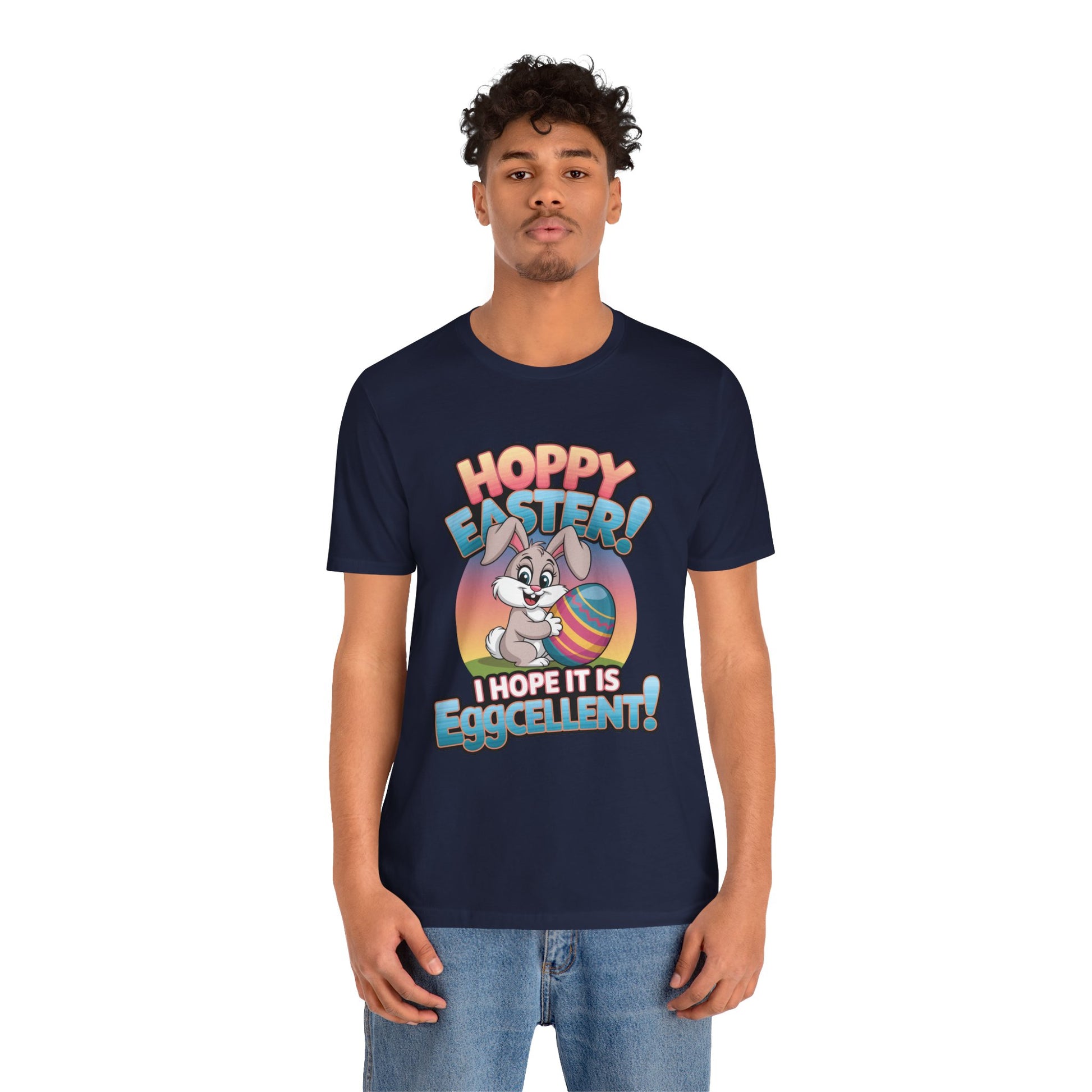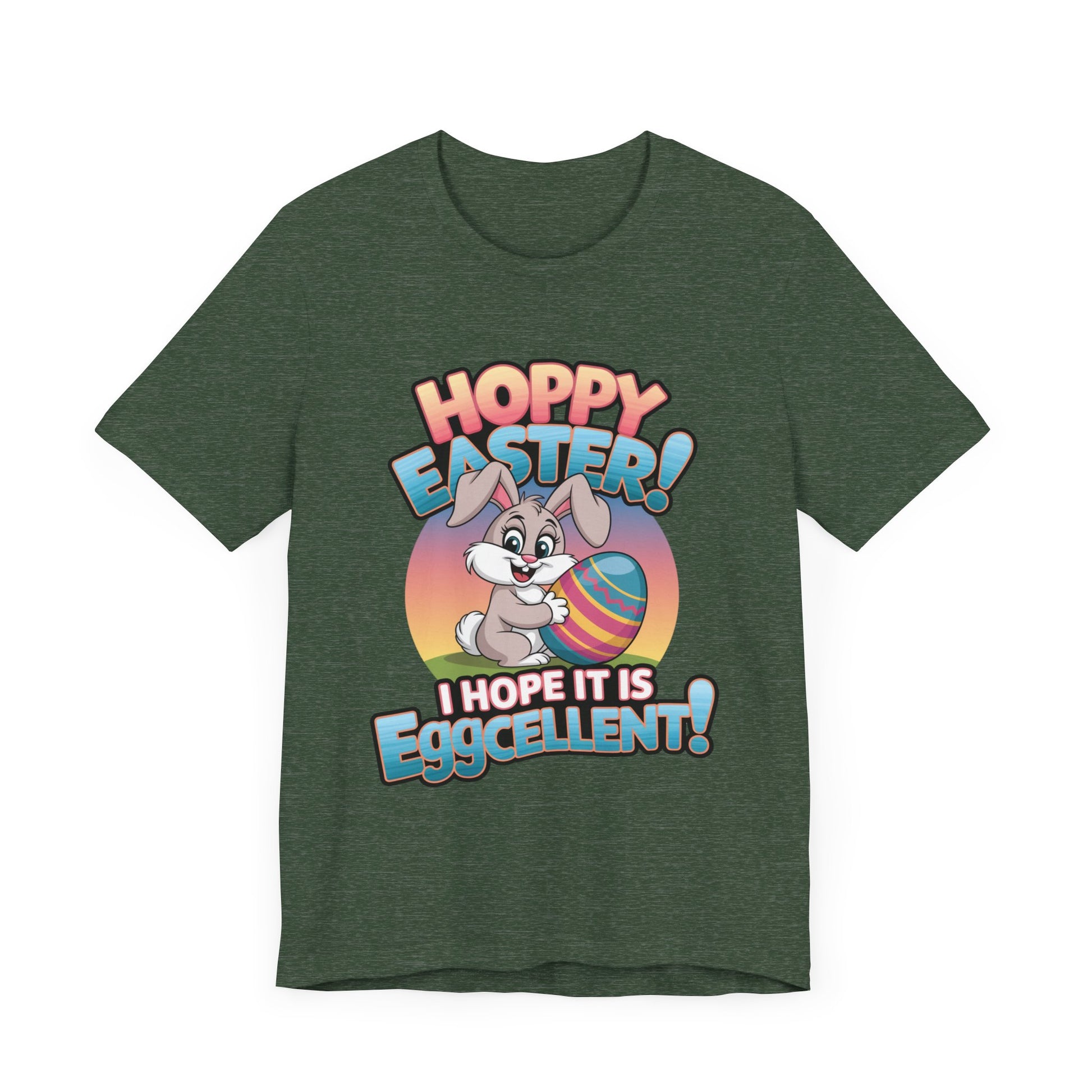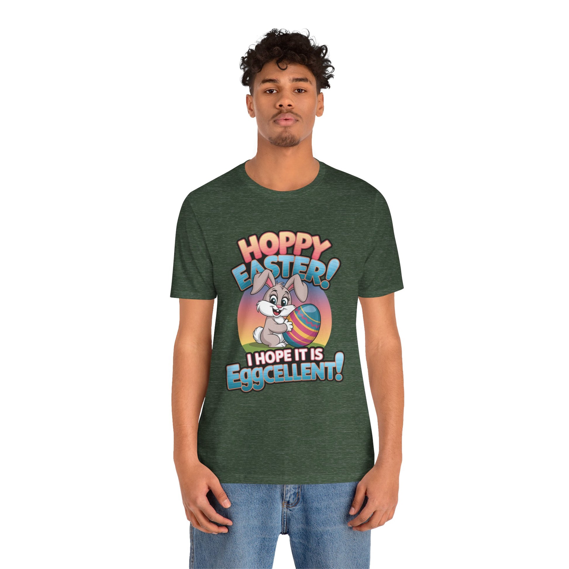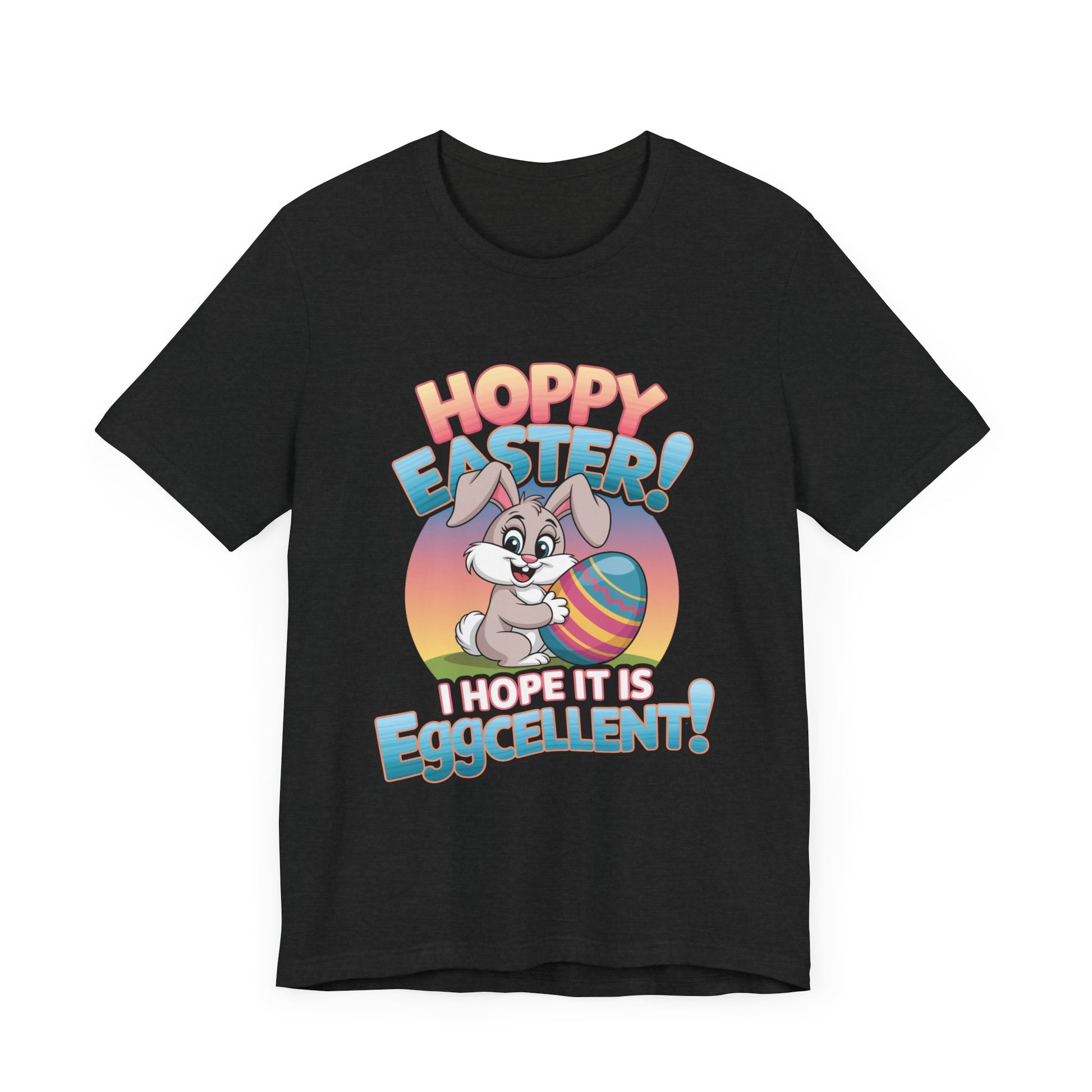 Celebrate Easter in style with this adorable "Hoppy Easter! I Hope It Is Eggcellent!" unisex t-shirt. Featuring a playful bunny holding a colorful Easter egg against a vibrant sunset backdrop, this lightweight and comfortable tee is perfect for spreading holiday cheer. Whether you're hunting for eggs, attending a family gathering, or simply enjoying the spring season, this shirt is sure to bring smiles and compliments. Made from high-quality fabric, it offers a soft feel and durability for all-day wear.