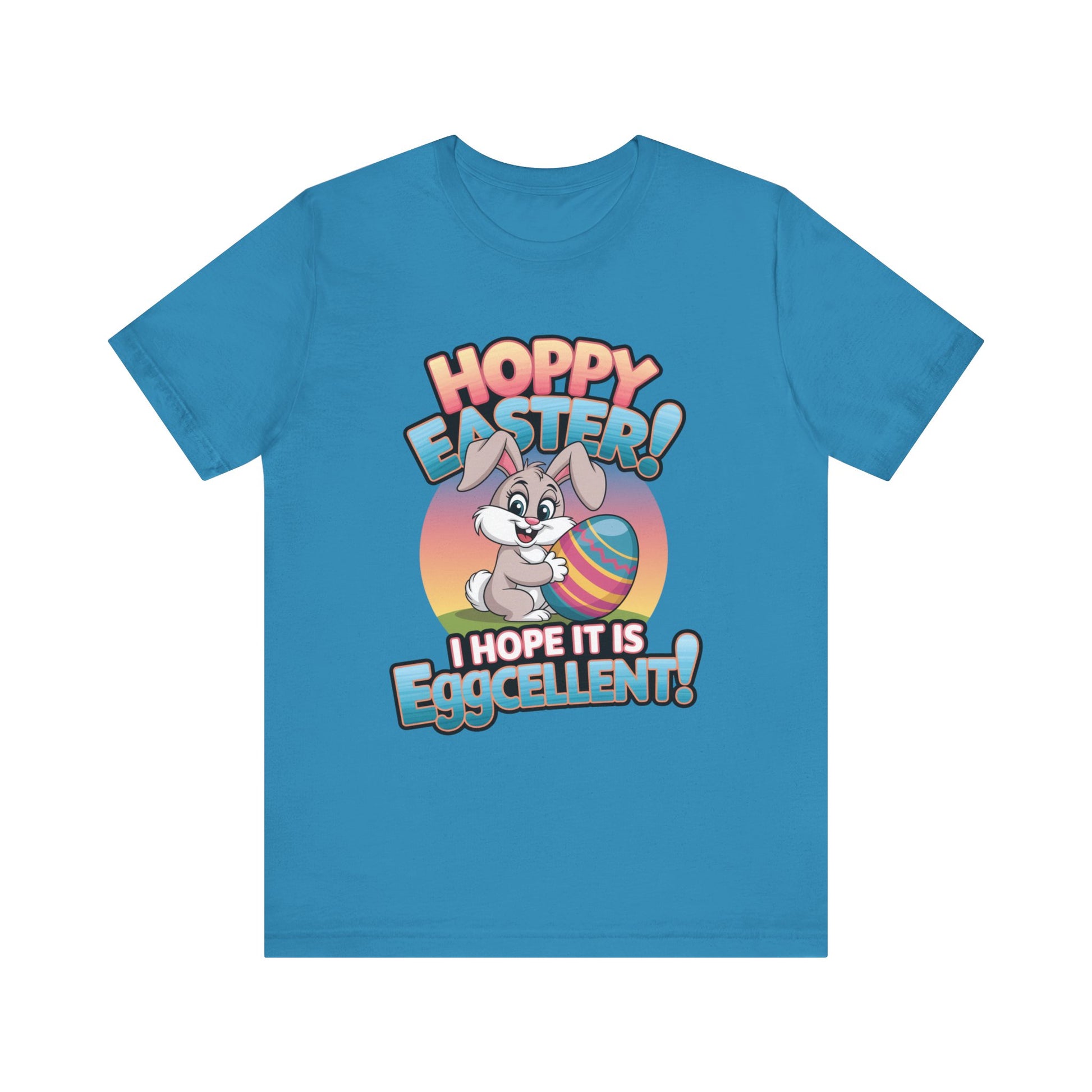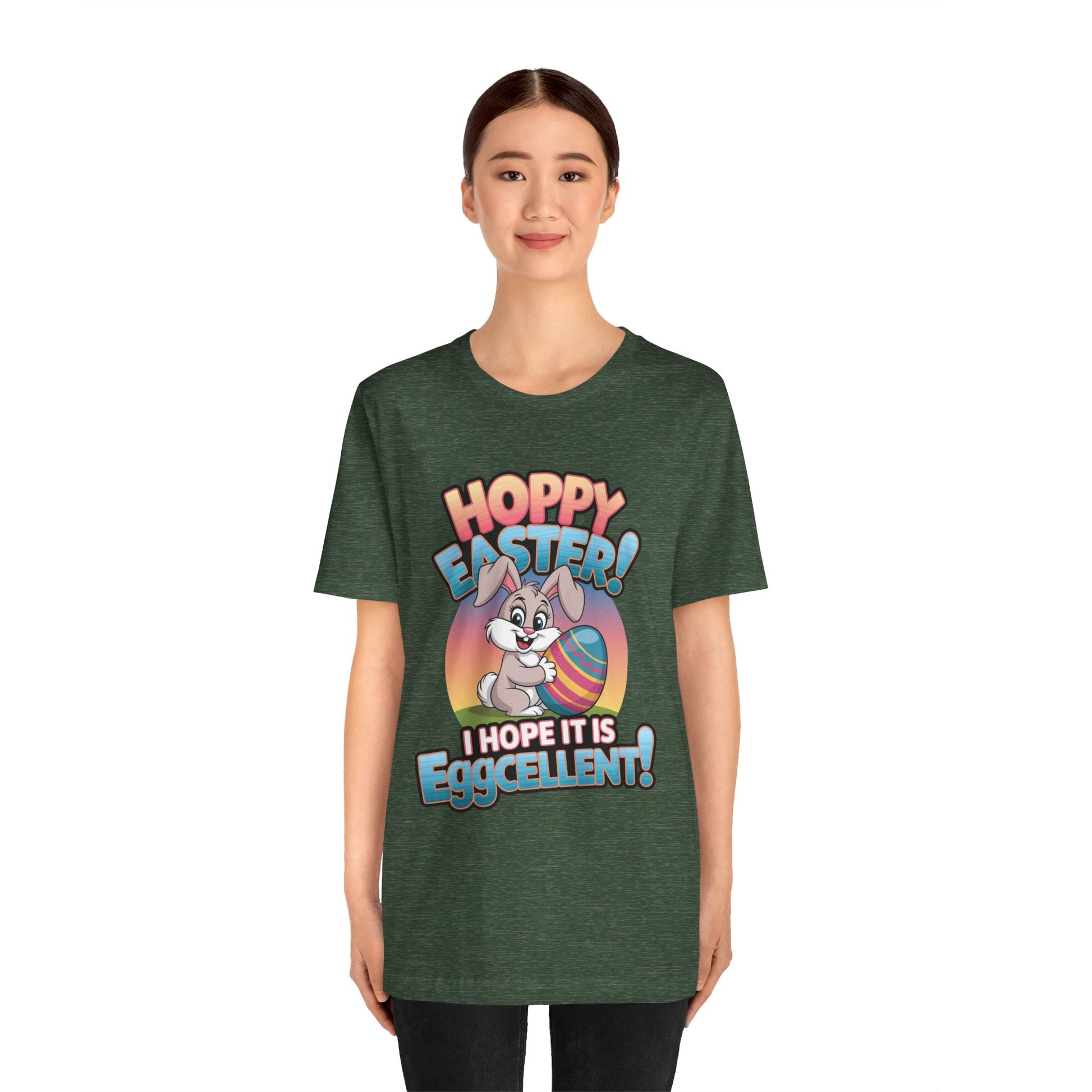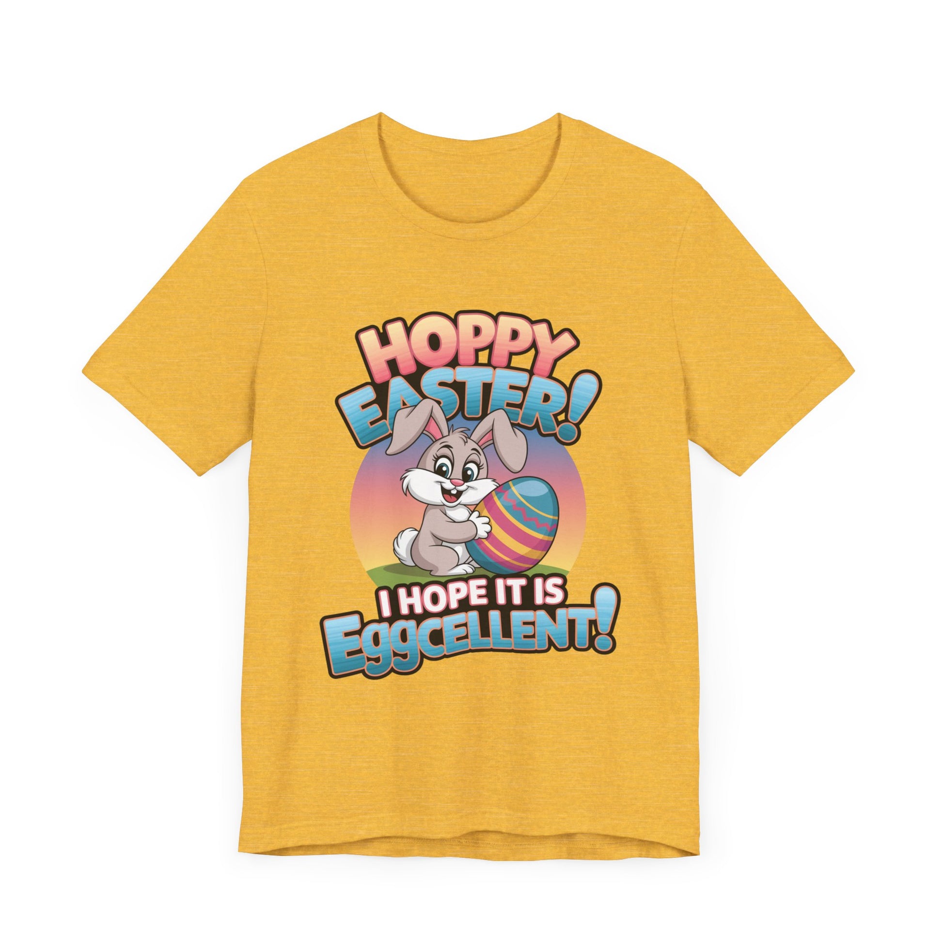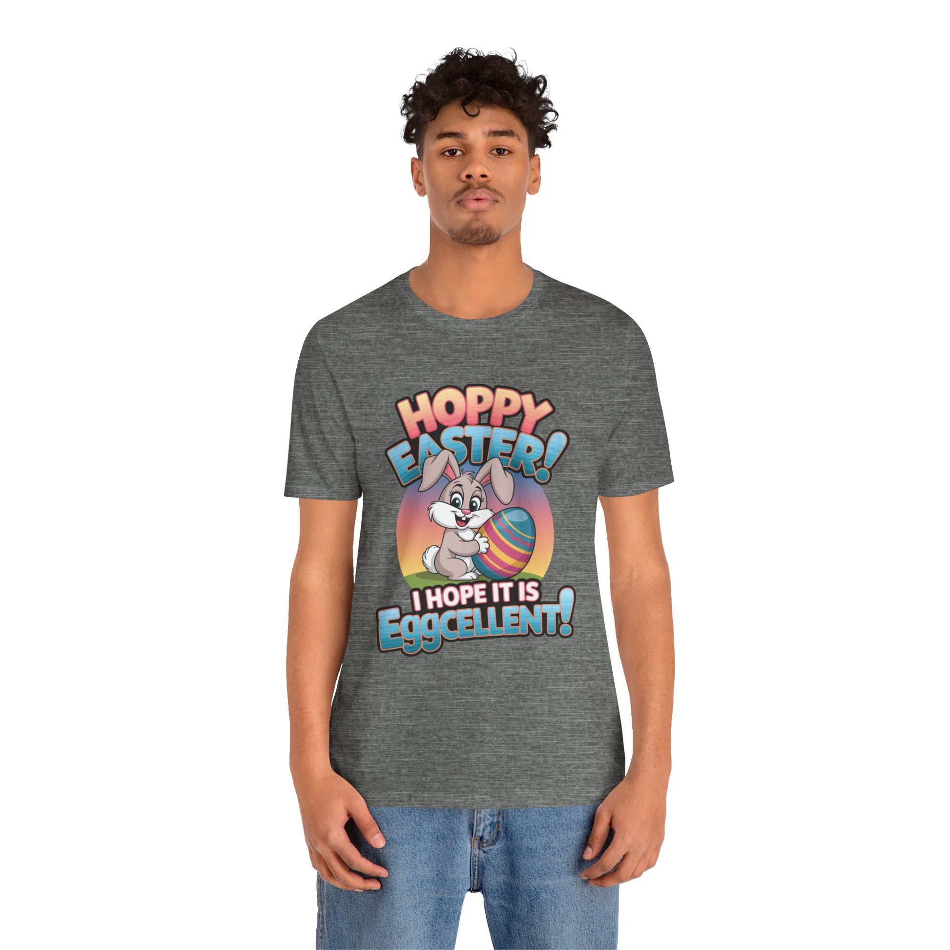 Celebrate Easter in style with this adorable "Hoppy Easter! I Hope It Is Eggcellent!" unisex t-shirt. Featuring a playful bunny holding a colorful Easter egg against a vibrant sunset backdrop, this lightweight and comfortable tee is perfect for spreading holiday cheer. Whether you're hunting for eggs, attending a family gathering, or simply enjoying the spring season, this shirt is sure to bring smiles and compliments. Made from high-quality fabric, it offers a soft feel and durability for all-day wear.