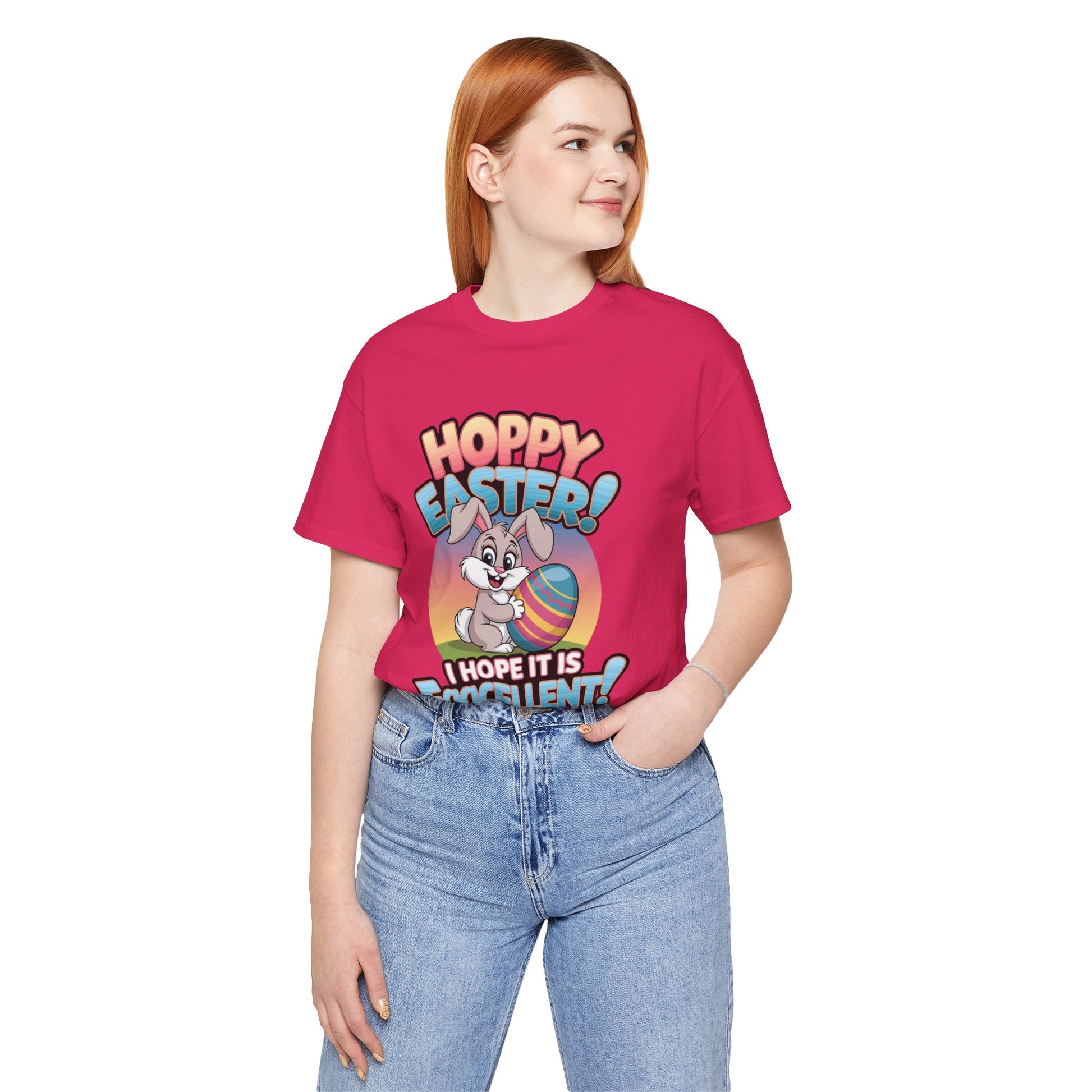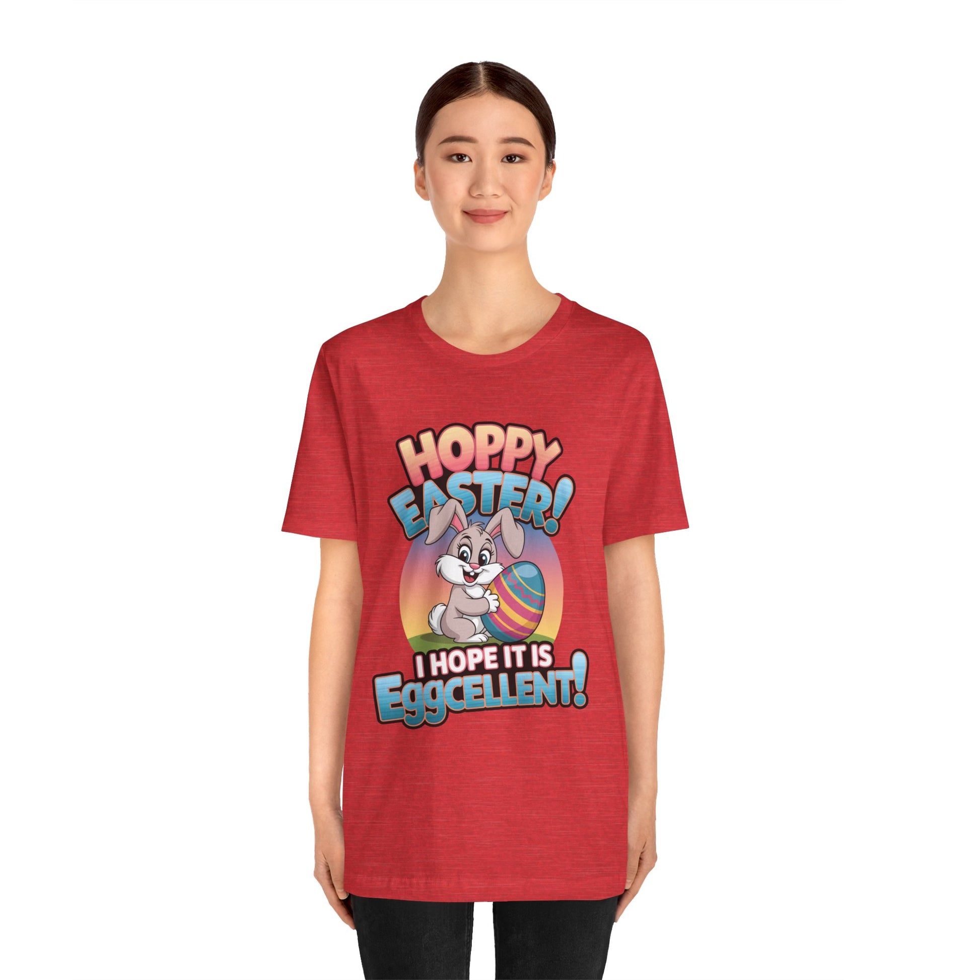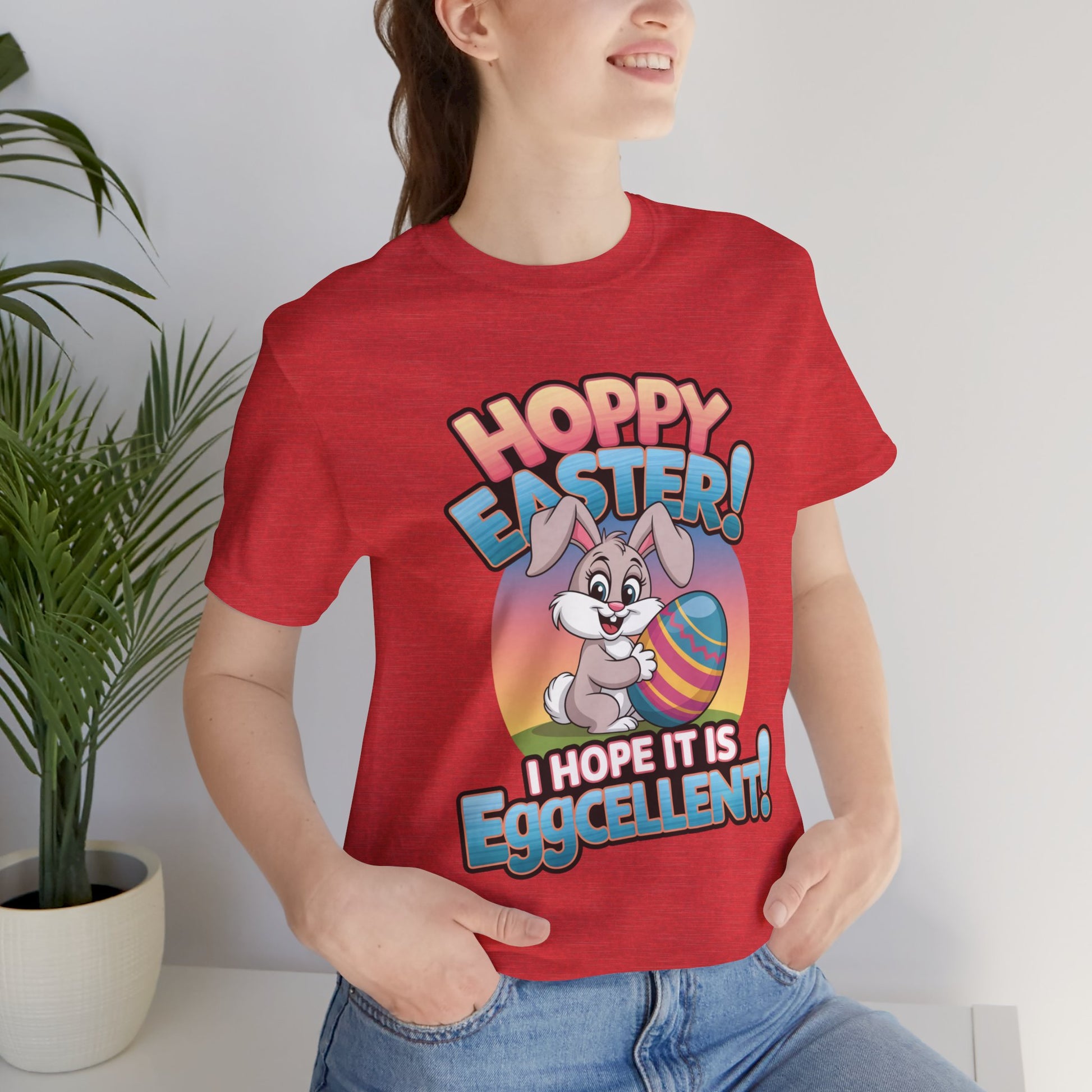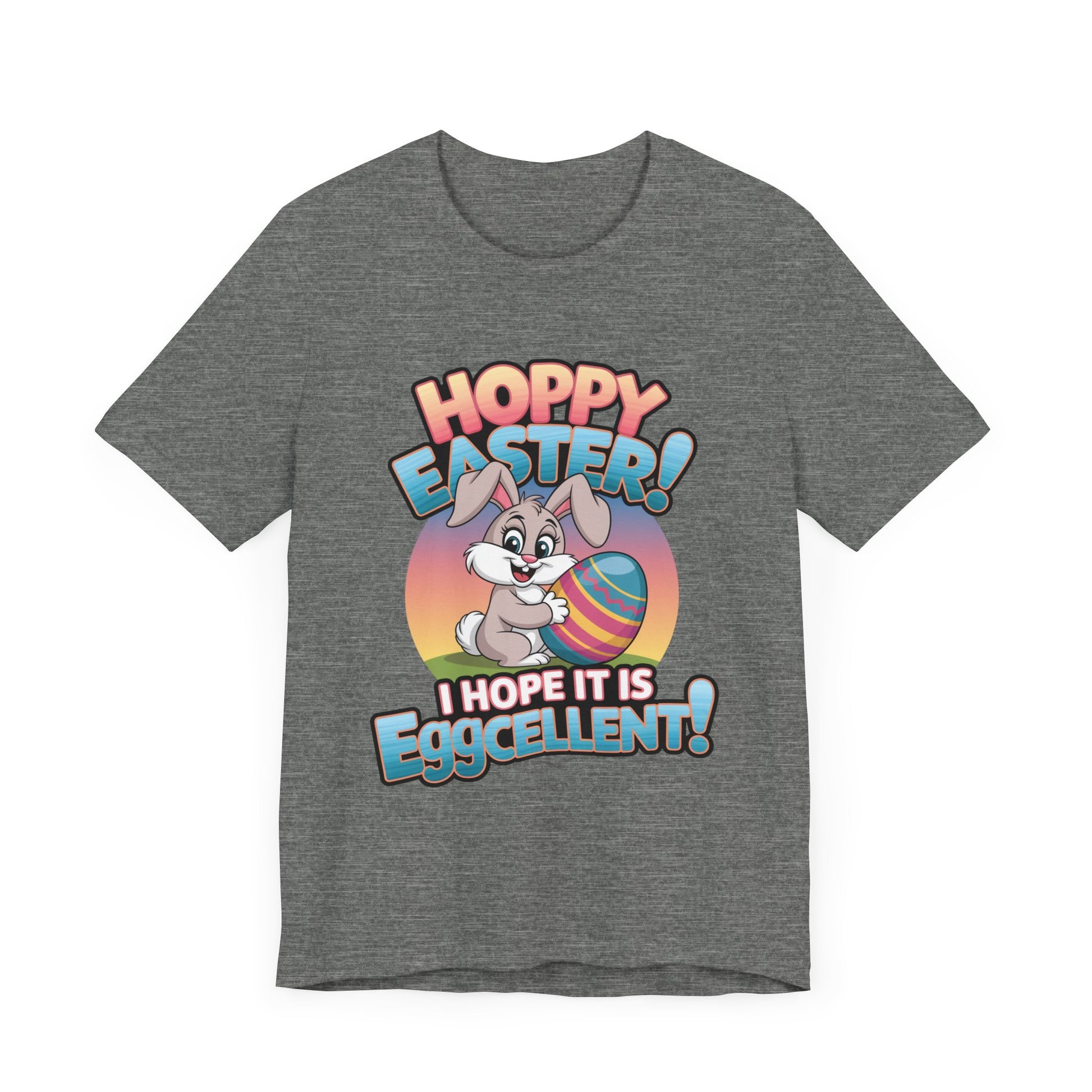 Celebrate Easter in style with this adorable "Hoppy Easter! I Hope It Is Eggcellent!" unisex t-shirt. Featuring a playful bunny holding a colorful Easter egg against a vibrant sunset backdrop, this lightweight and comfortable tee is perfect for spreading holiday cheer. Whether you're hunting for eggs, attending a family gathering, or simply enjoying the spring season, this shirt is sure to bring smiles and compliments. Made from high-quality fabric, it offers a soft feel and durability for all-day wear.