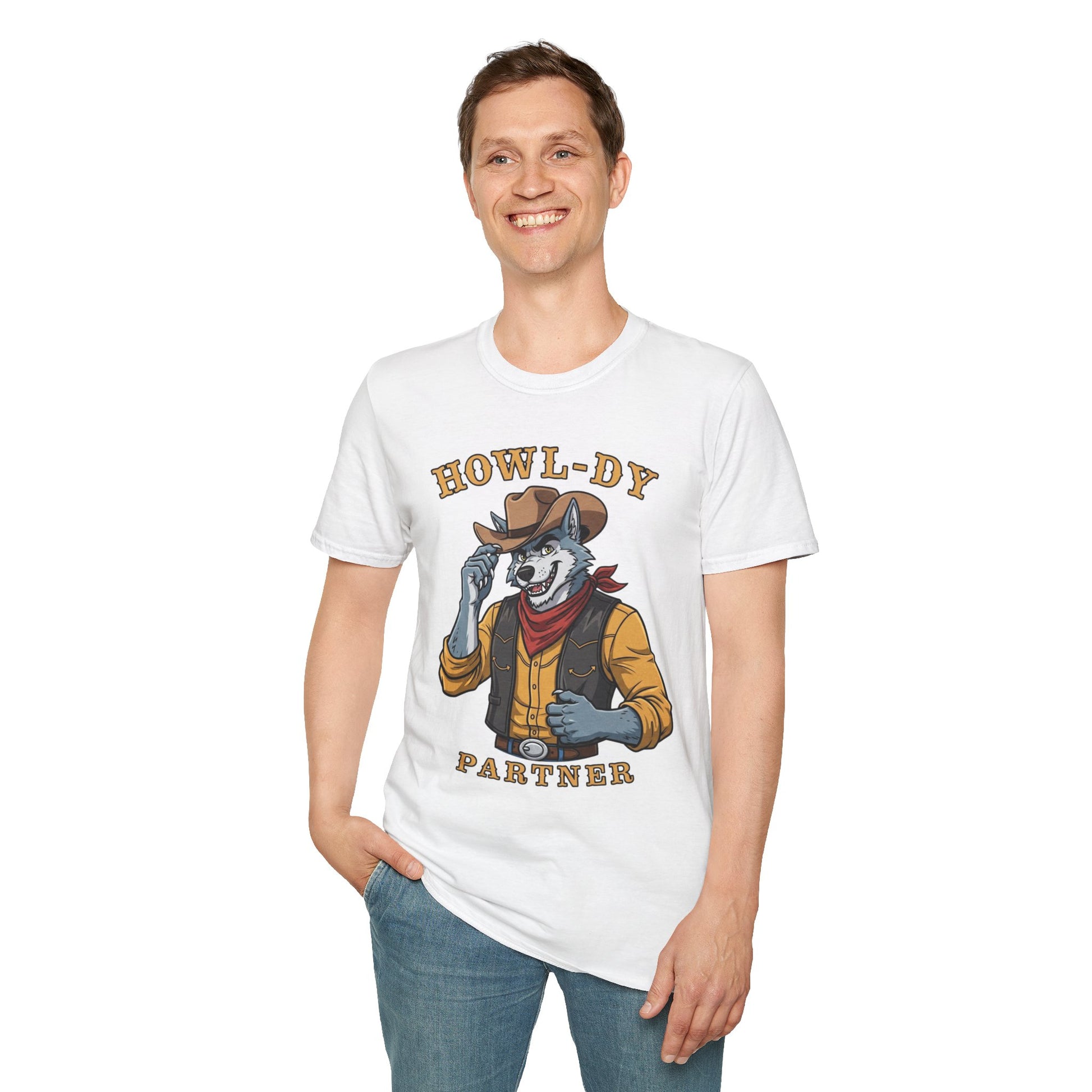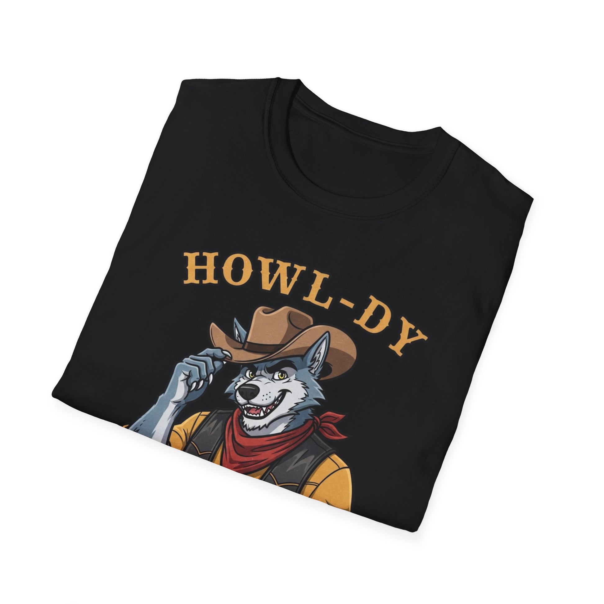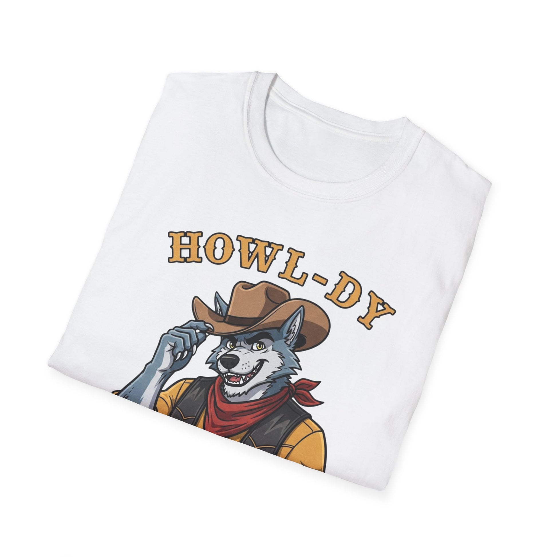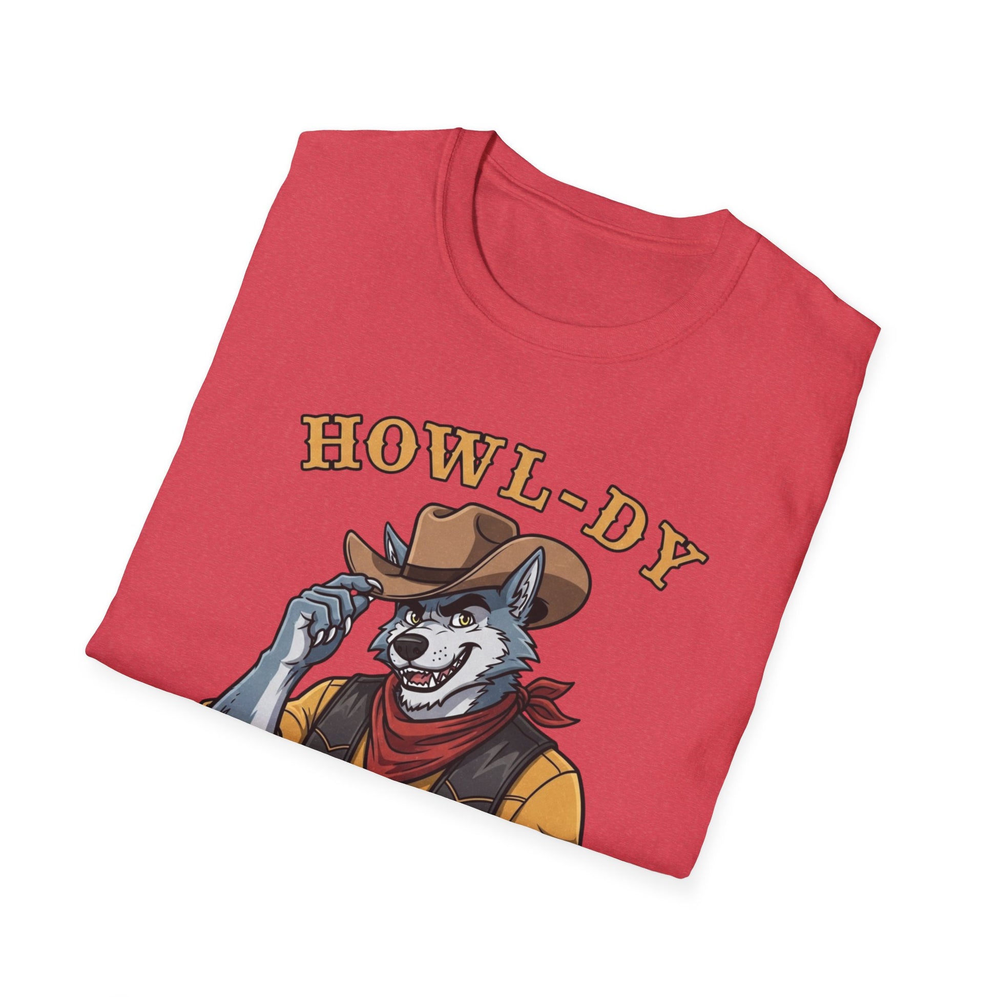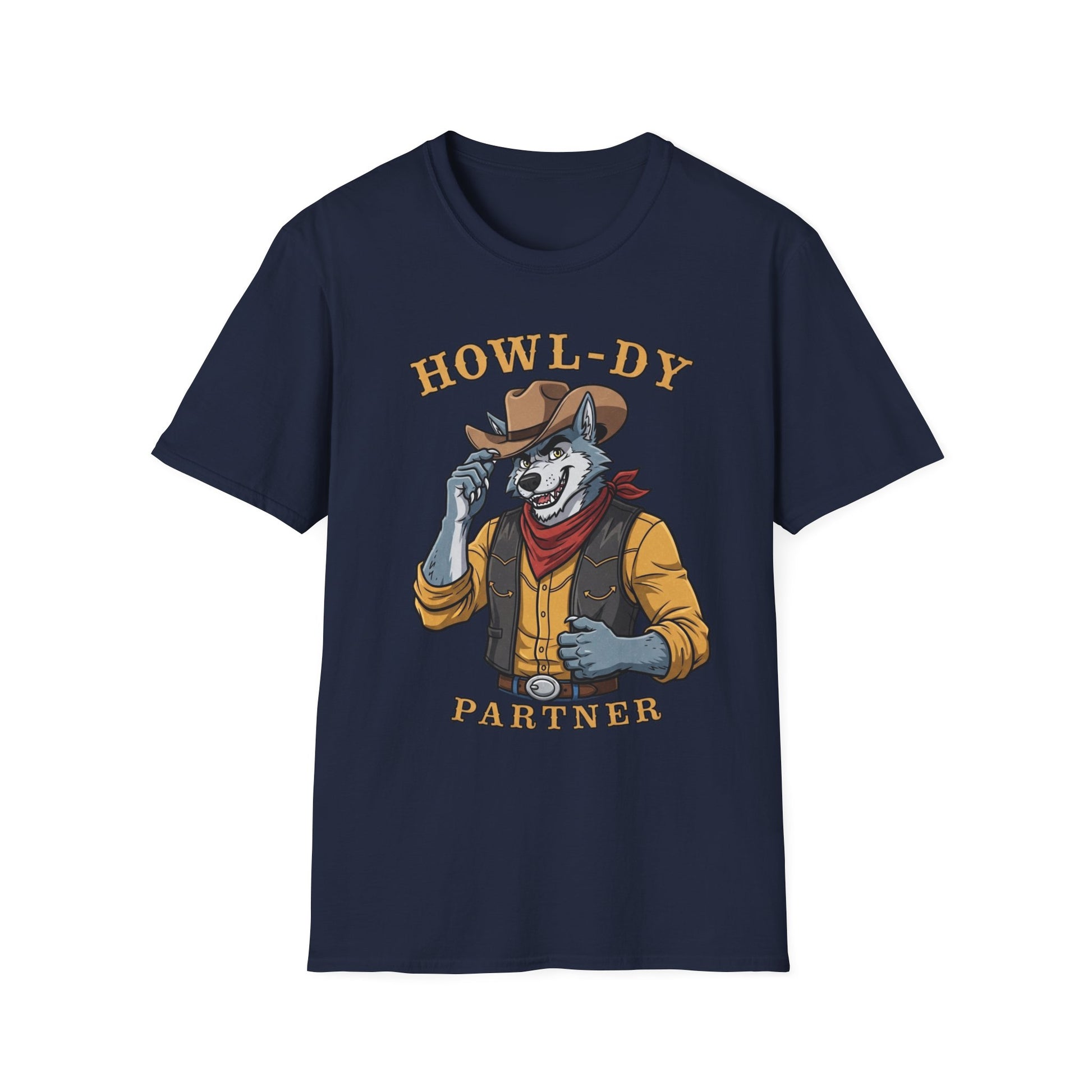 Howl-dy Partner Wolf Cowboy T-Shirt | Western Howling Wolf Graphic Tee, Funny Animal Shirt, Cowboy Gifts, Rustic Country Tee