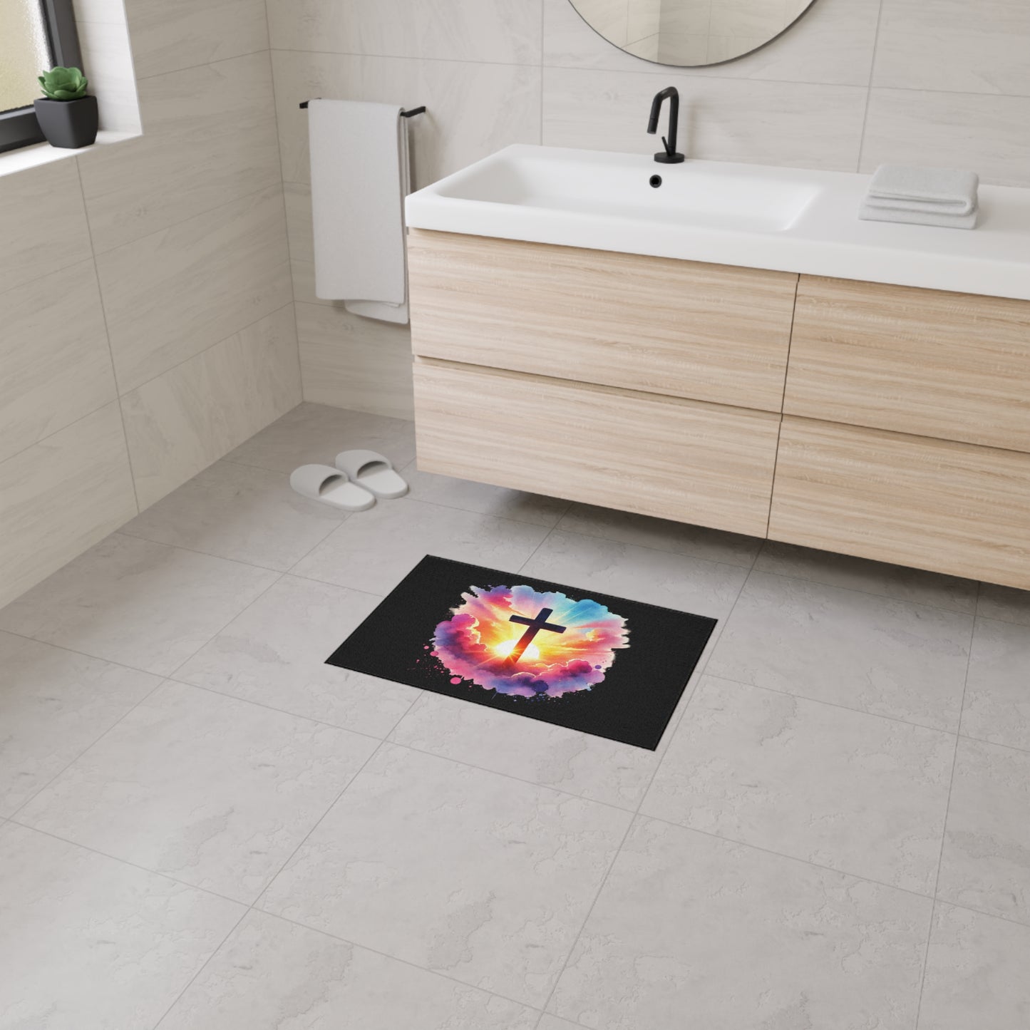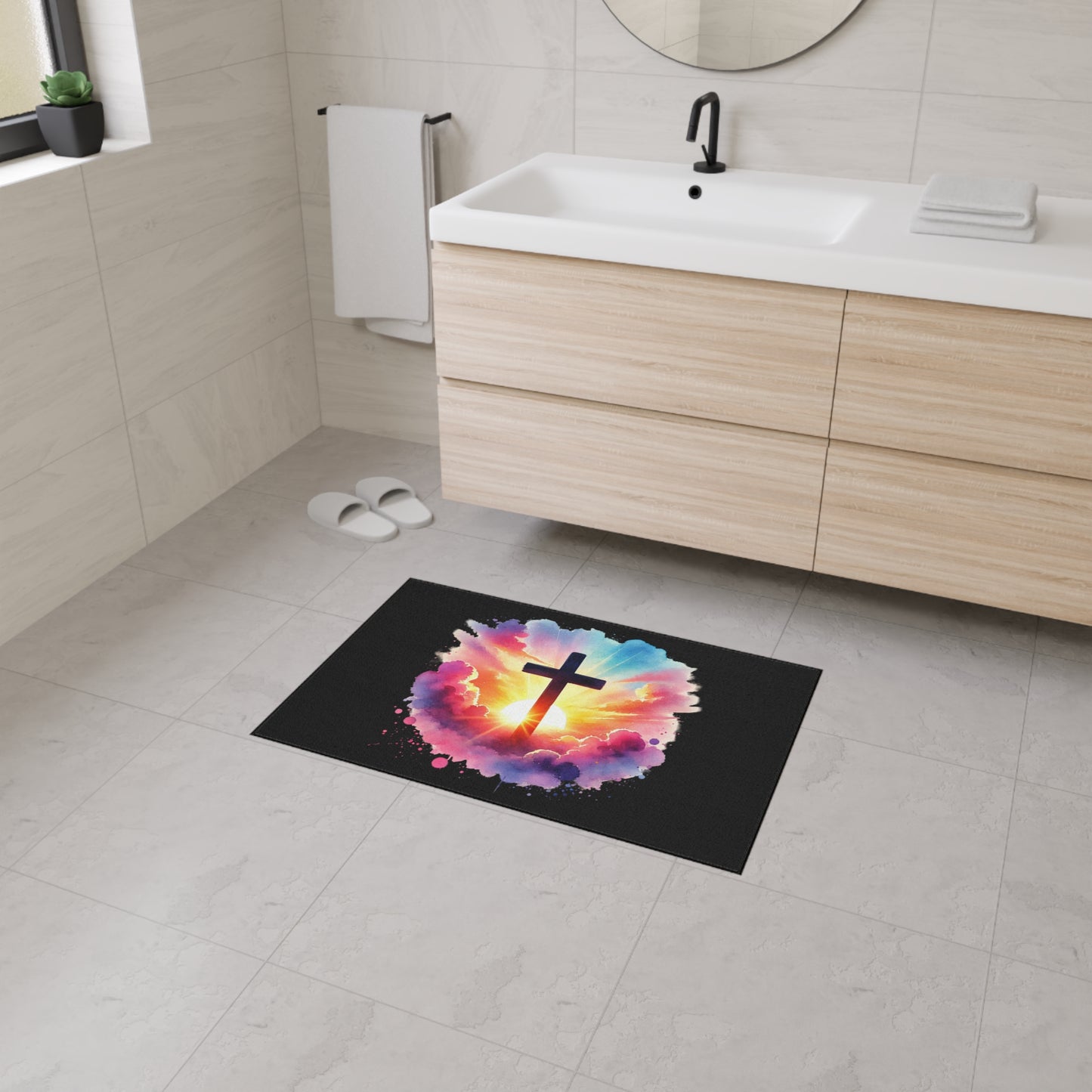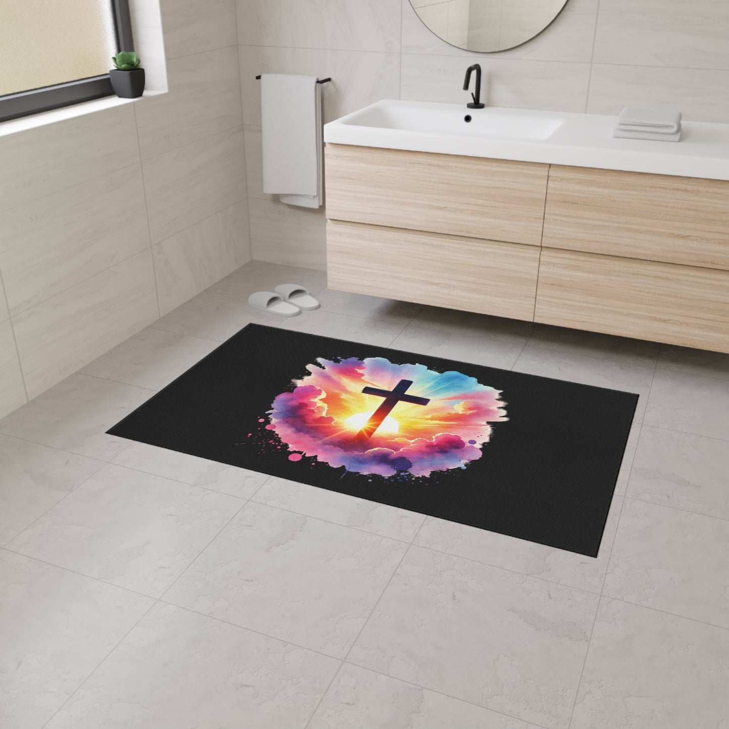 Elevate your home décor with this Inspirational Christian Heavy-Duty Floor Mat featuring a stunning watercolor-style cross design. With its bold contrast of a radiant sunrise and soft, artistic clouds, this rug beautifully symbolizes faith, hope, and new beginnings. Perfect for entryways, living rooms, or prayer spaces, this high-quality mat is both visually striking and practical, offering durability and slip resistance for everyday use.