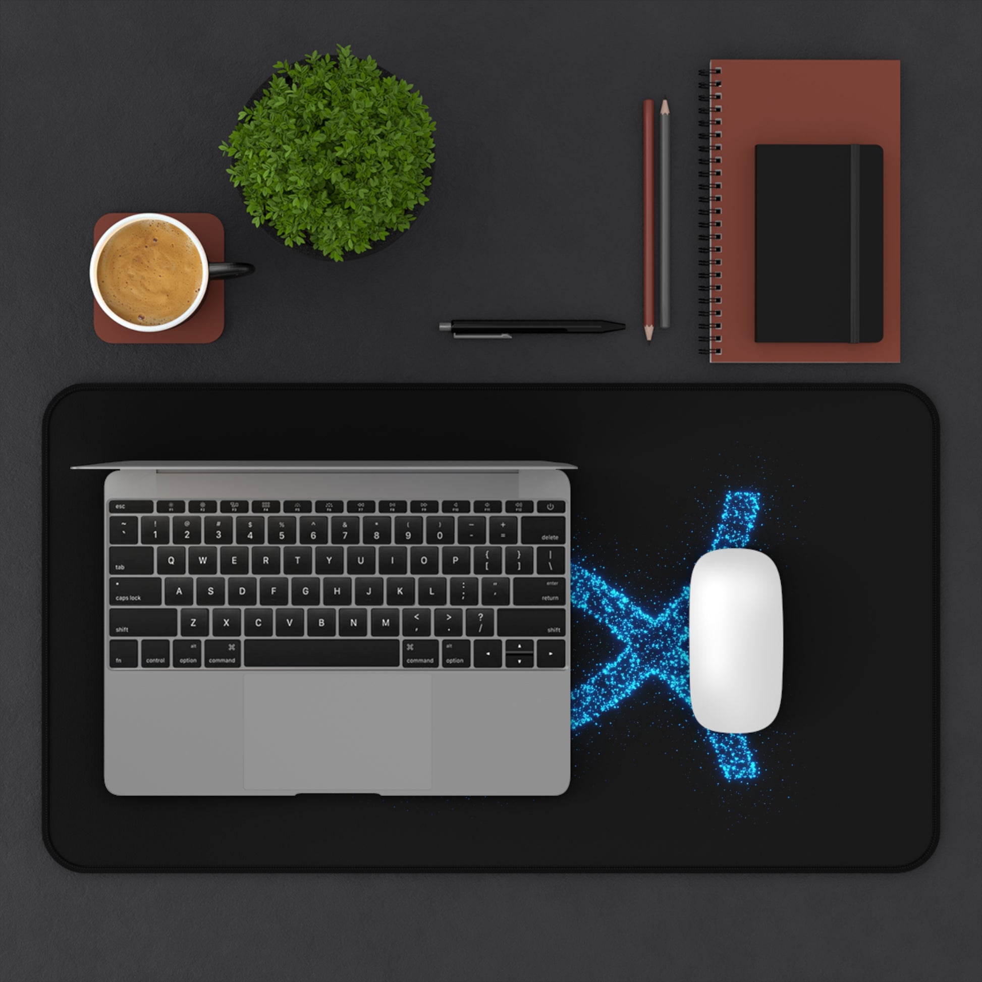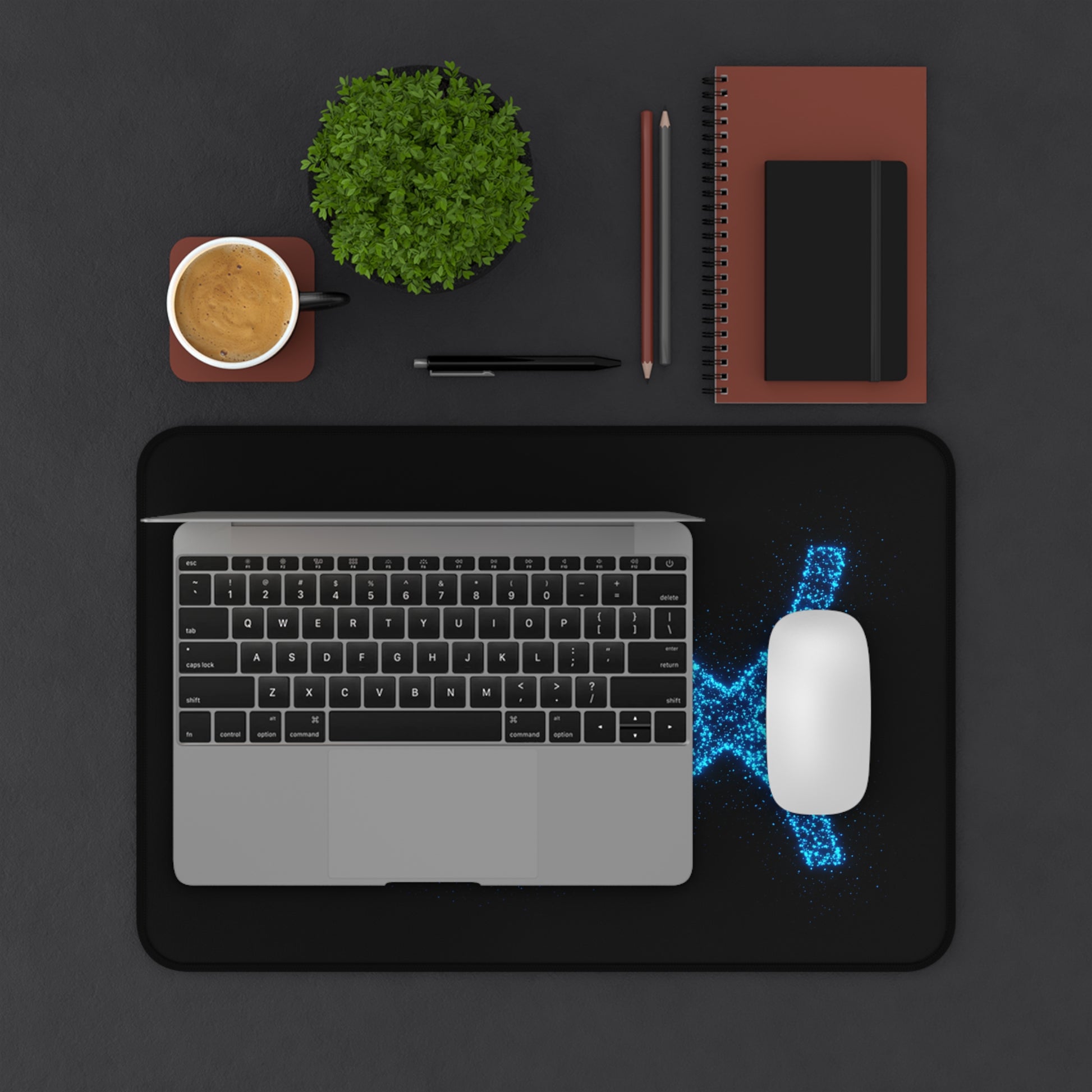 Elevate your workspace with this inspirational desk mat, featuring a modern, stylized Ichthys (fish) symbol. The vibrant blue design on a sleek black background adds a touch of faith and inspiration to your daily work. This desk mat isn't just visually appealing; it also provides a smooth, comfortable surface for your mouse and keyboard, protecting your desk from scratches and spills. Perfect for anyone seeking a blend of faith, functionality, and style in their office decor.