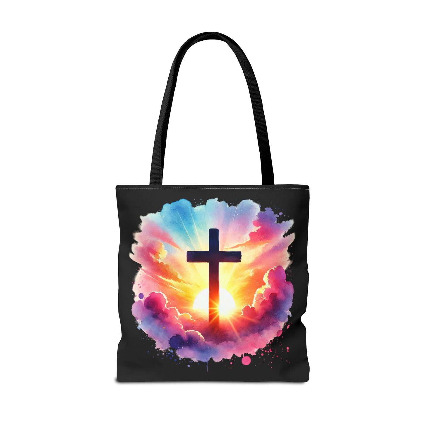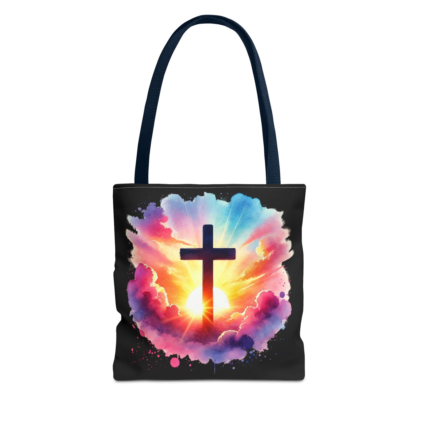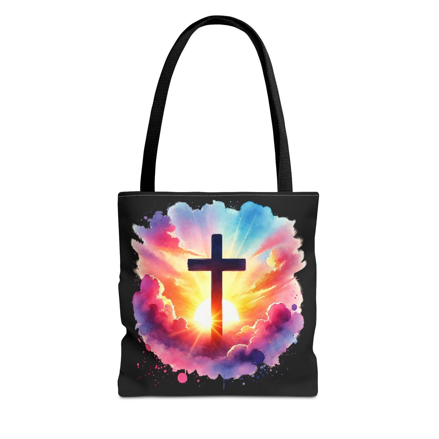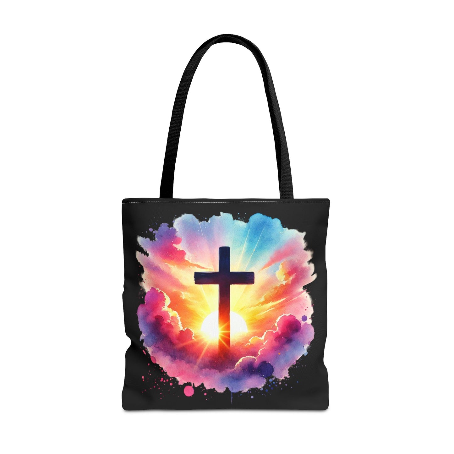 Inspirational Watercolor Sunrise Cross Tote Bag – Faith Art Canvas Tote, Christian Gift, Spiritual Aesthetic, Colorful Bible Verse Tote – Reusable Black Tote