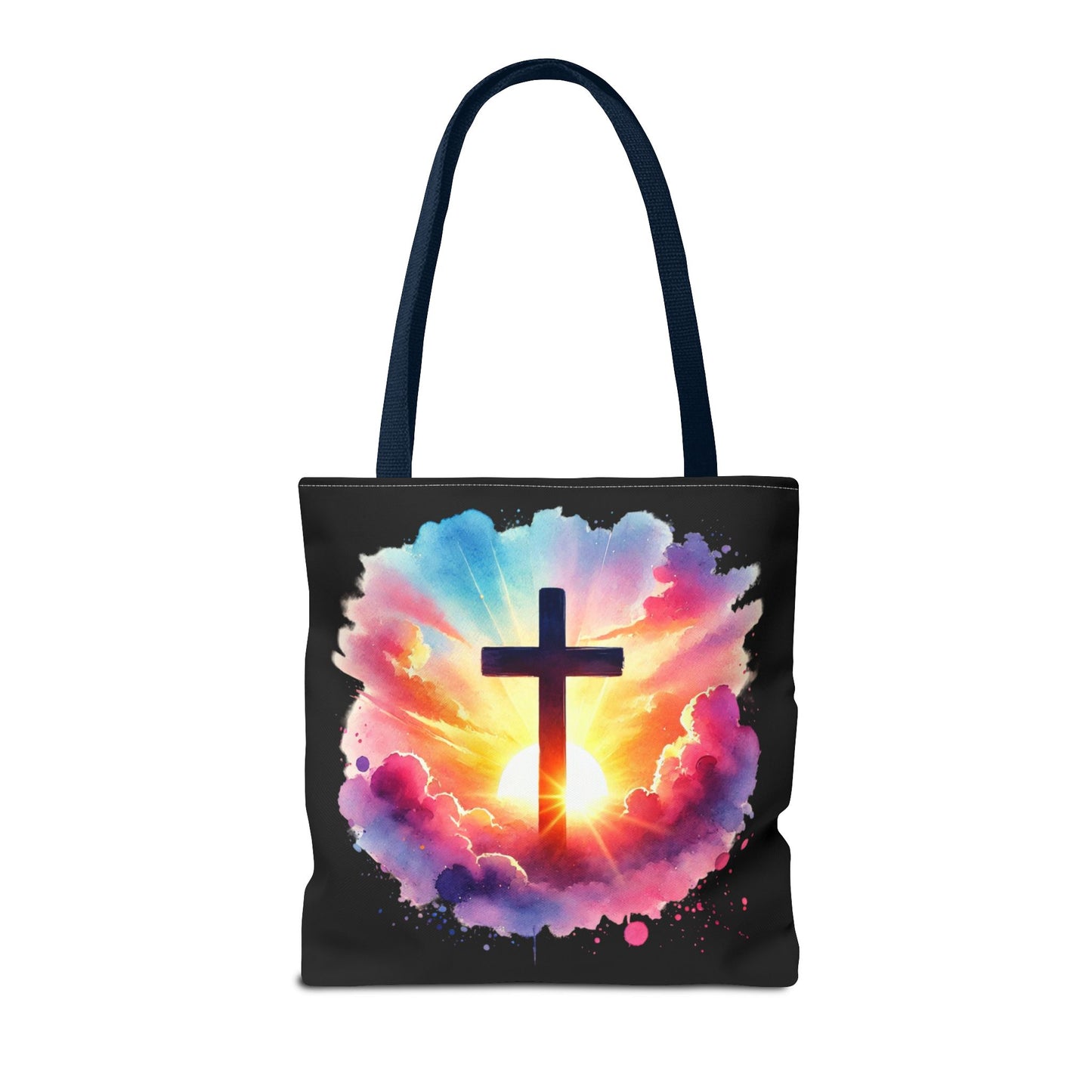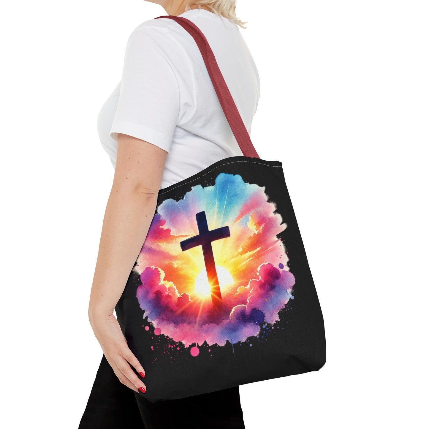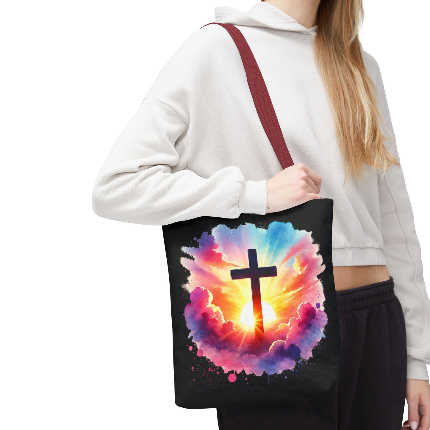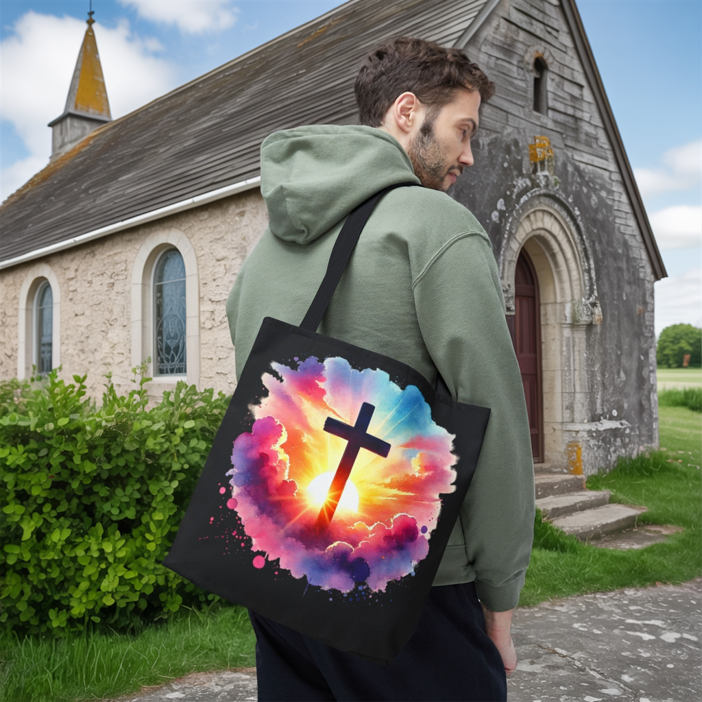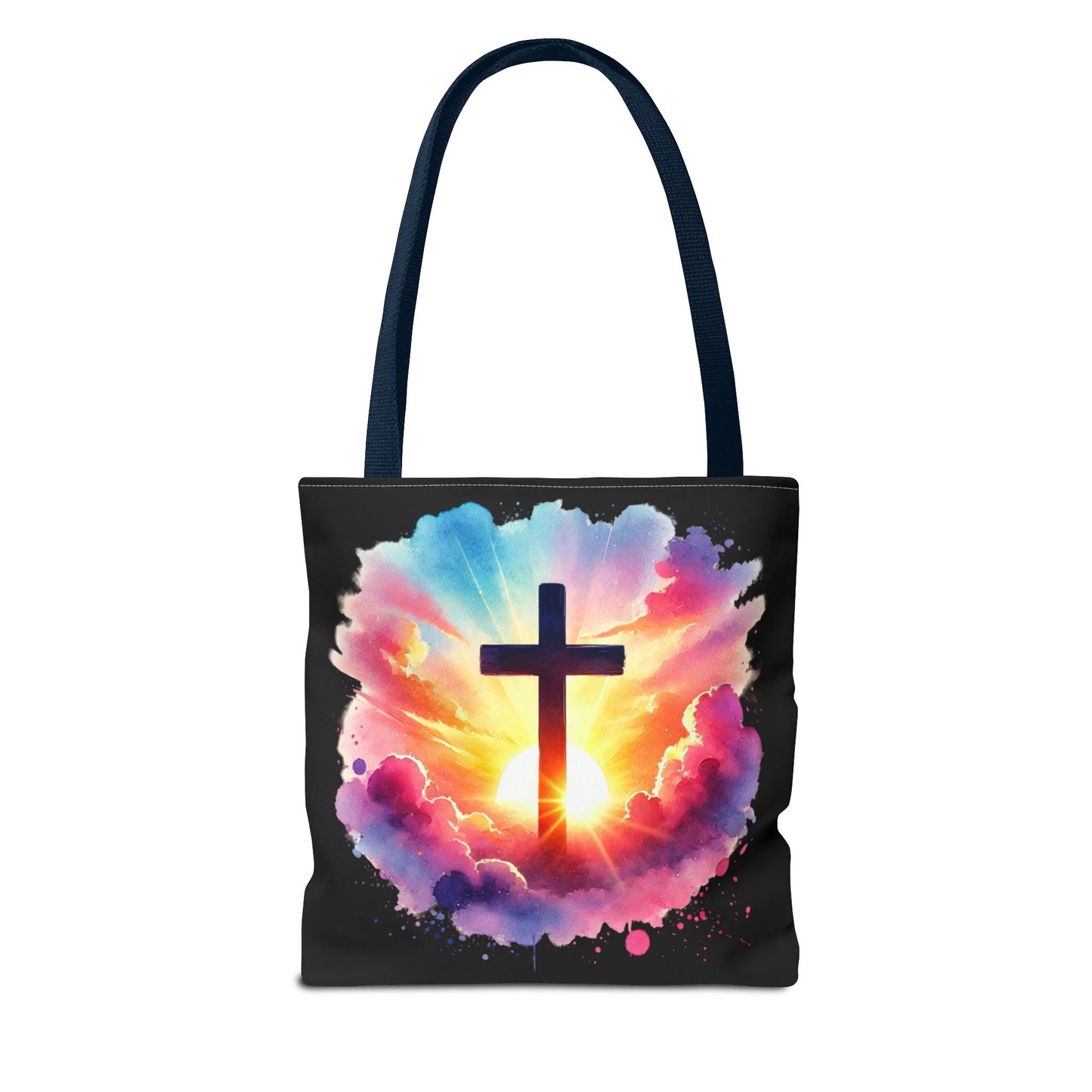 Inspirational Watercolor Sunrise Cross Tote Bag – Faith Art Canvas Tote, Christian Gift, Spiritual Aesthetic, Colorful Bible Verse Tote – Reusable Black Tote