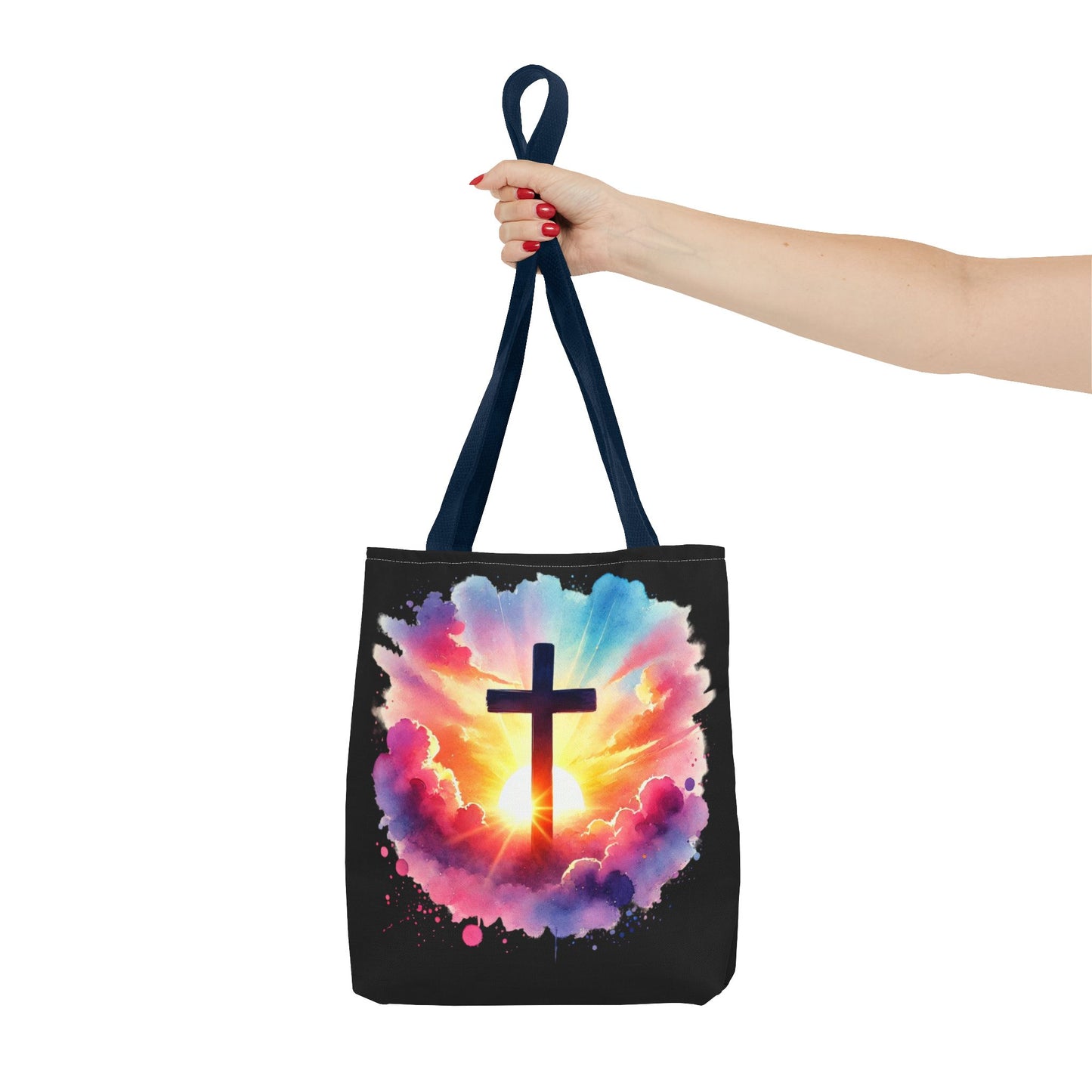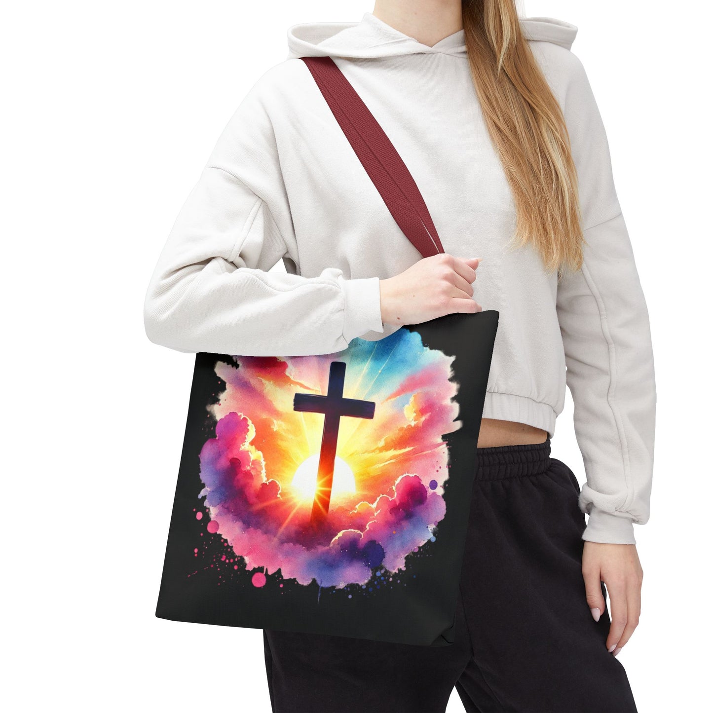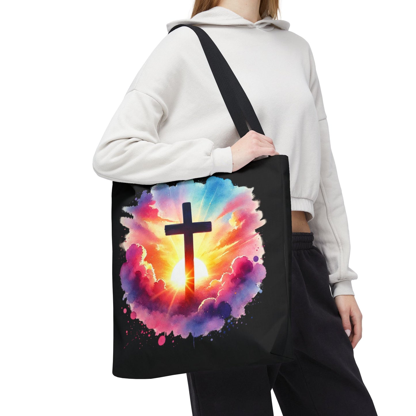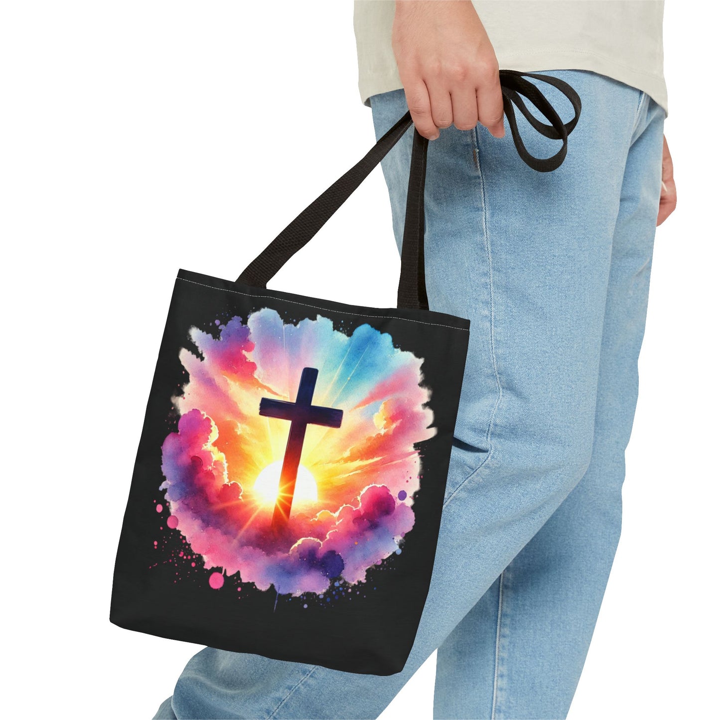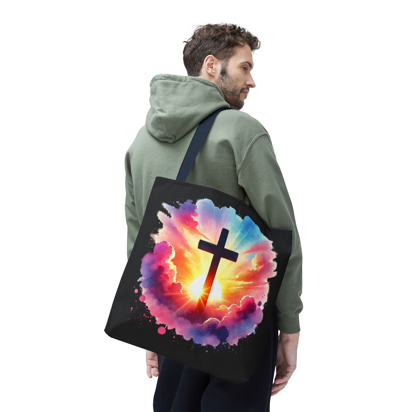 Inspirational Watercolor Sunrise Cross Tote Bag – Faith Art Canvas Tote, Christian Gift, Spiritual Aesthetic, Colorful Bible Verse Tote – Reusable Black Tote