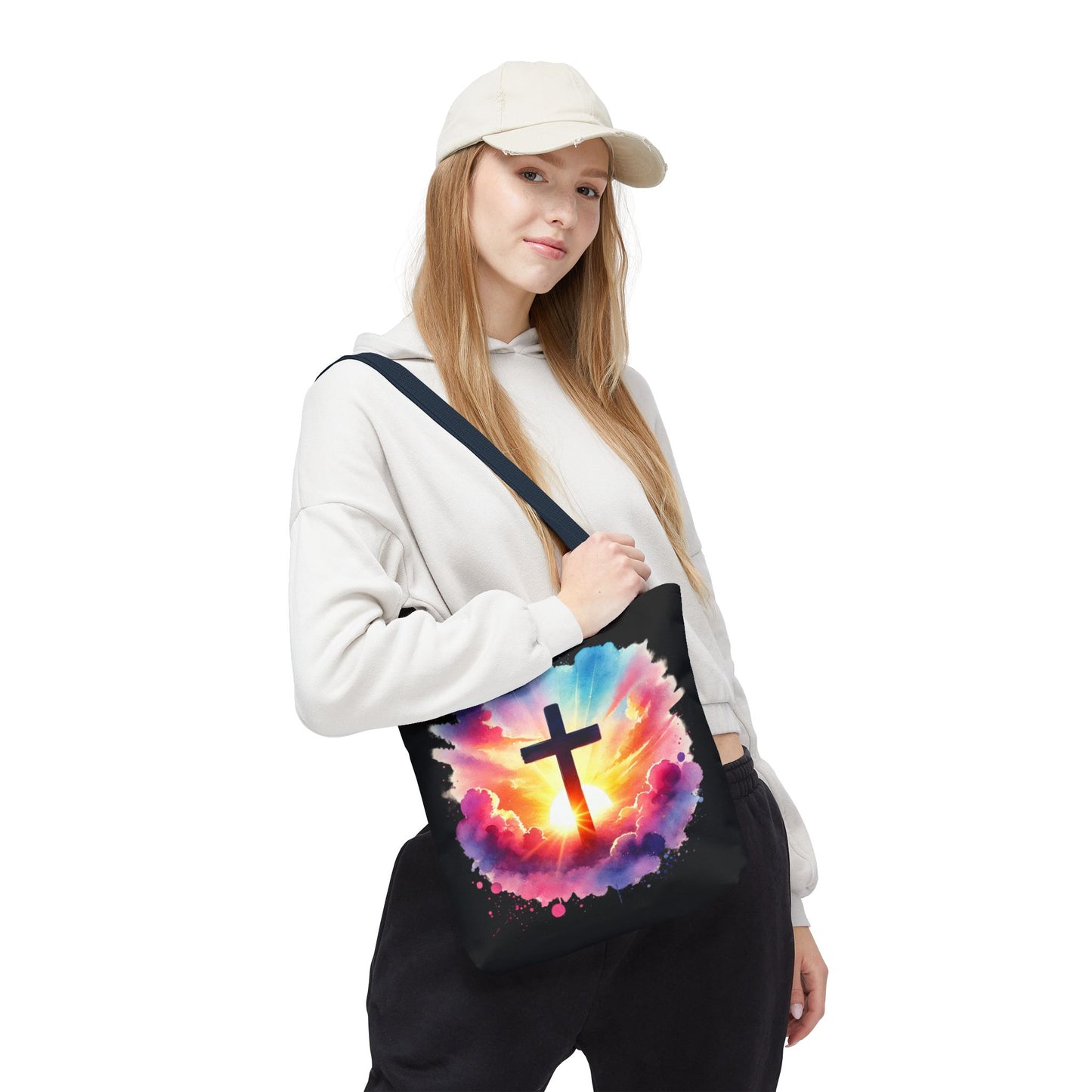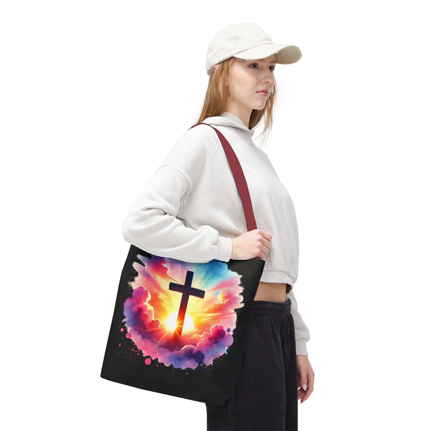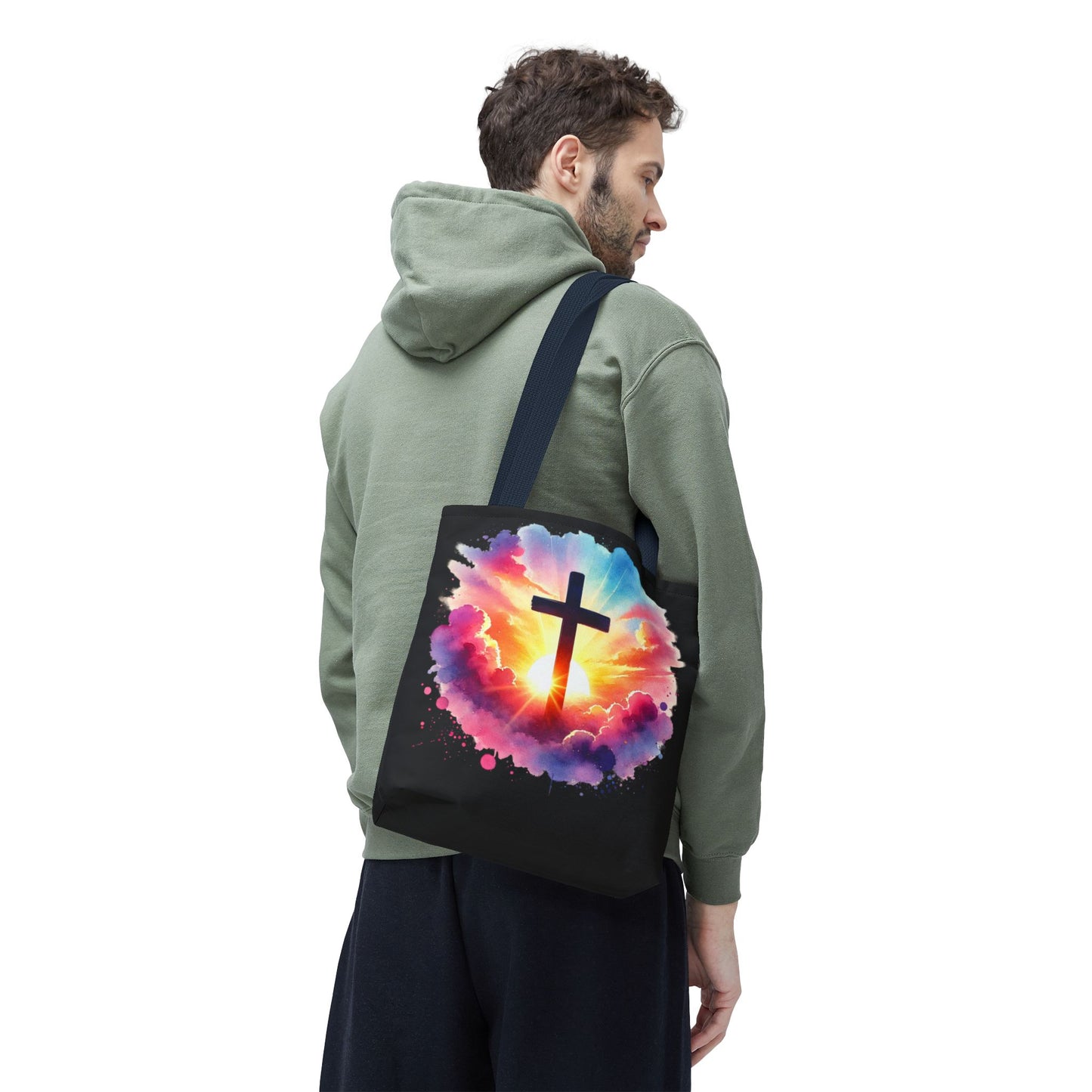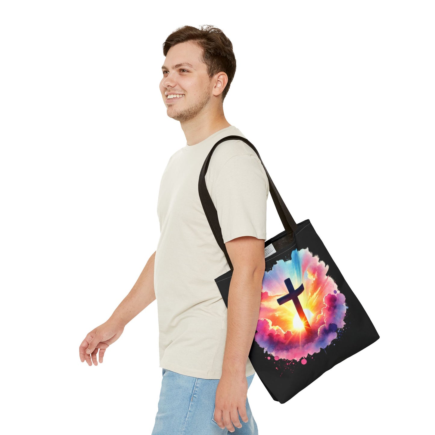 Inspirational Watercolor Sunrise Cross Tote Bag – Faith Art Canvas Tote, Christian Gift, Spiritual Aesthetic, Colorful Bible Verse Tote – Reusable Black Tote