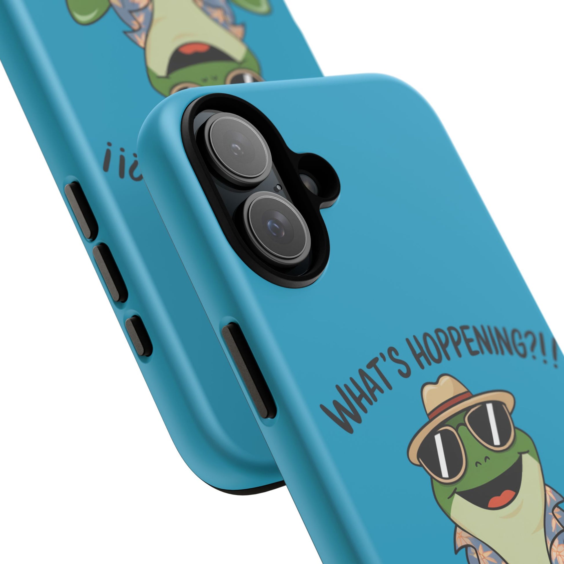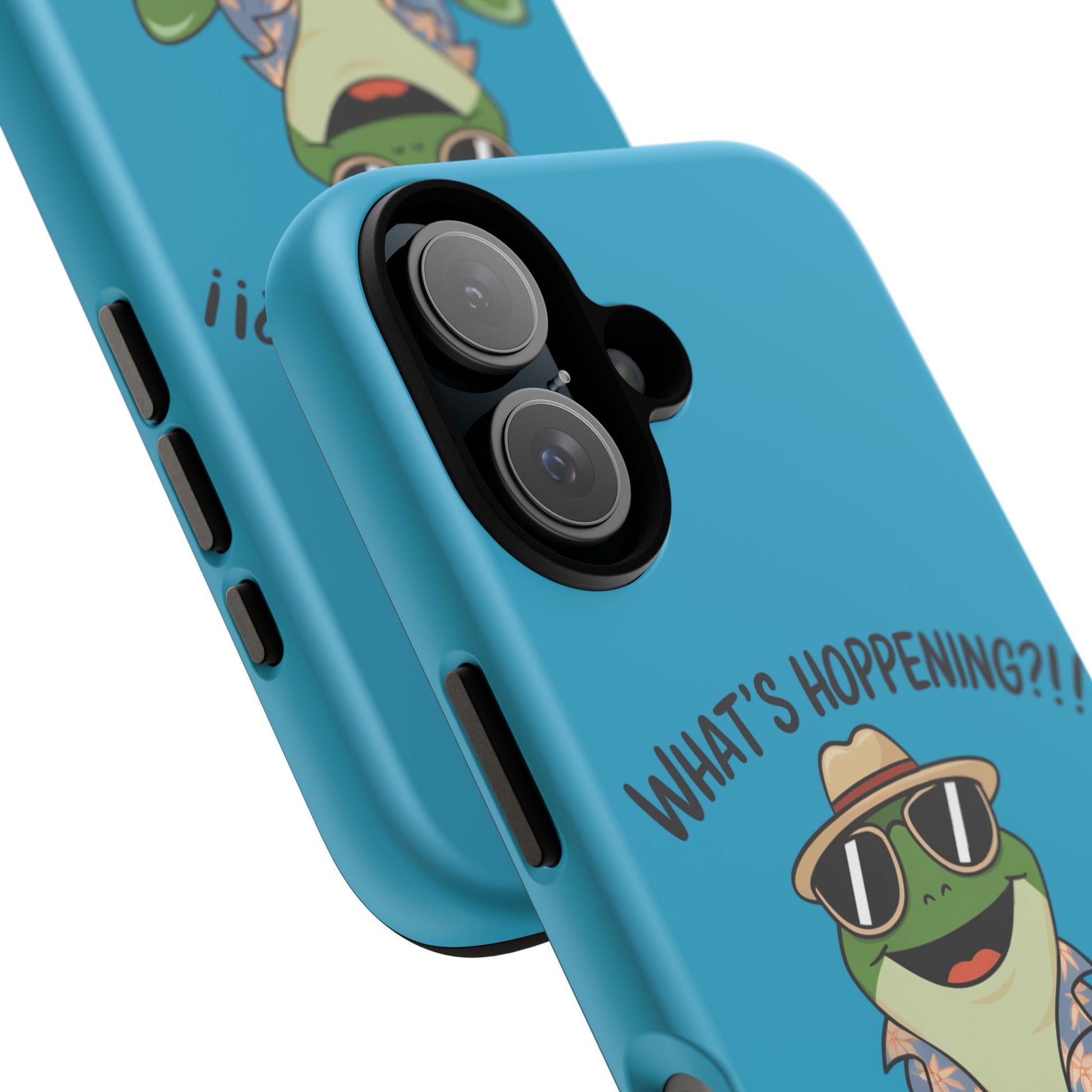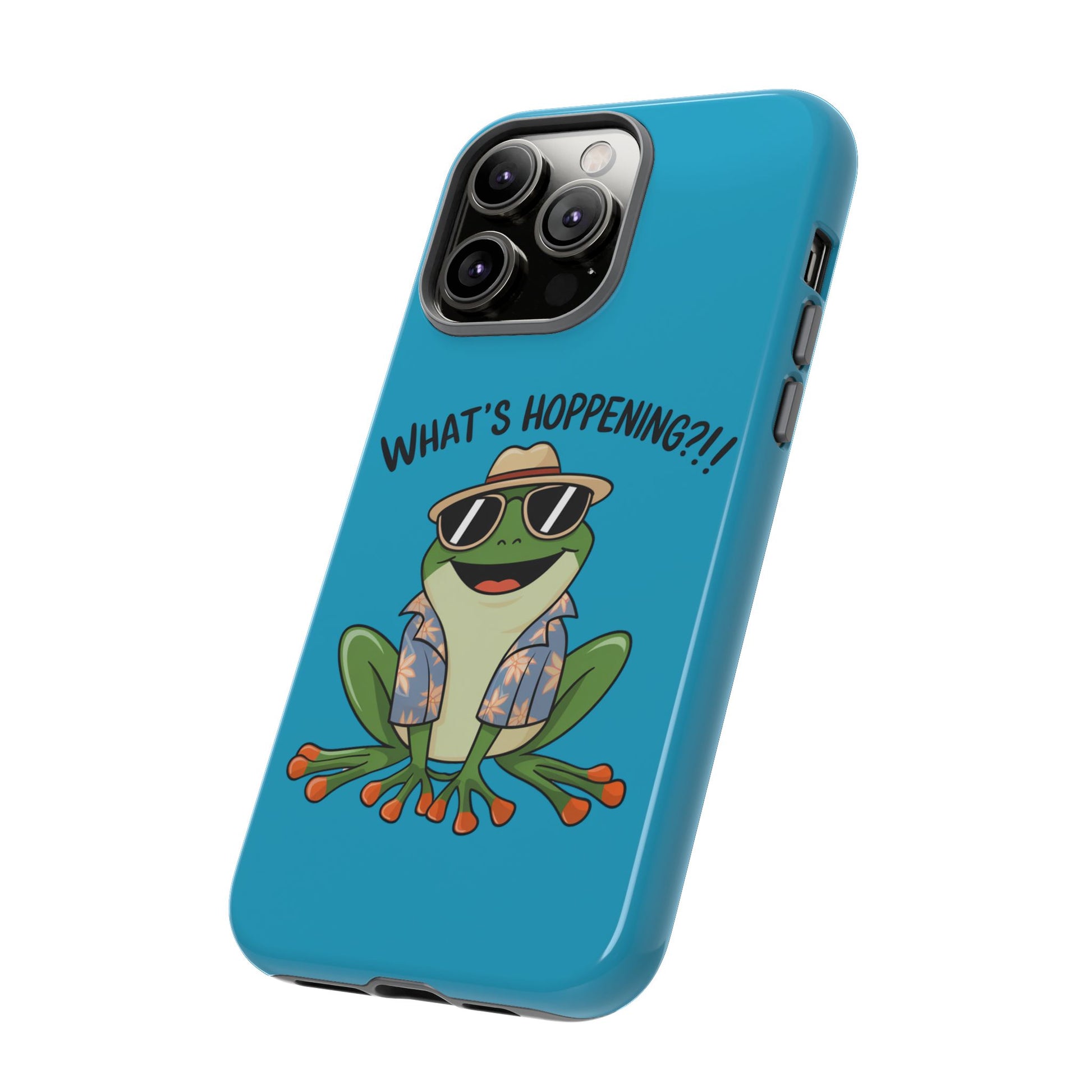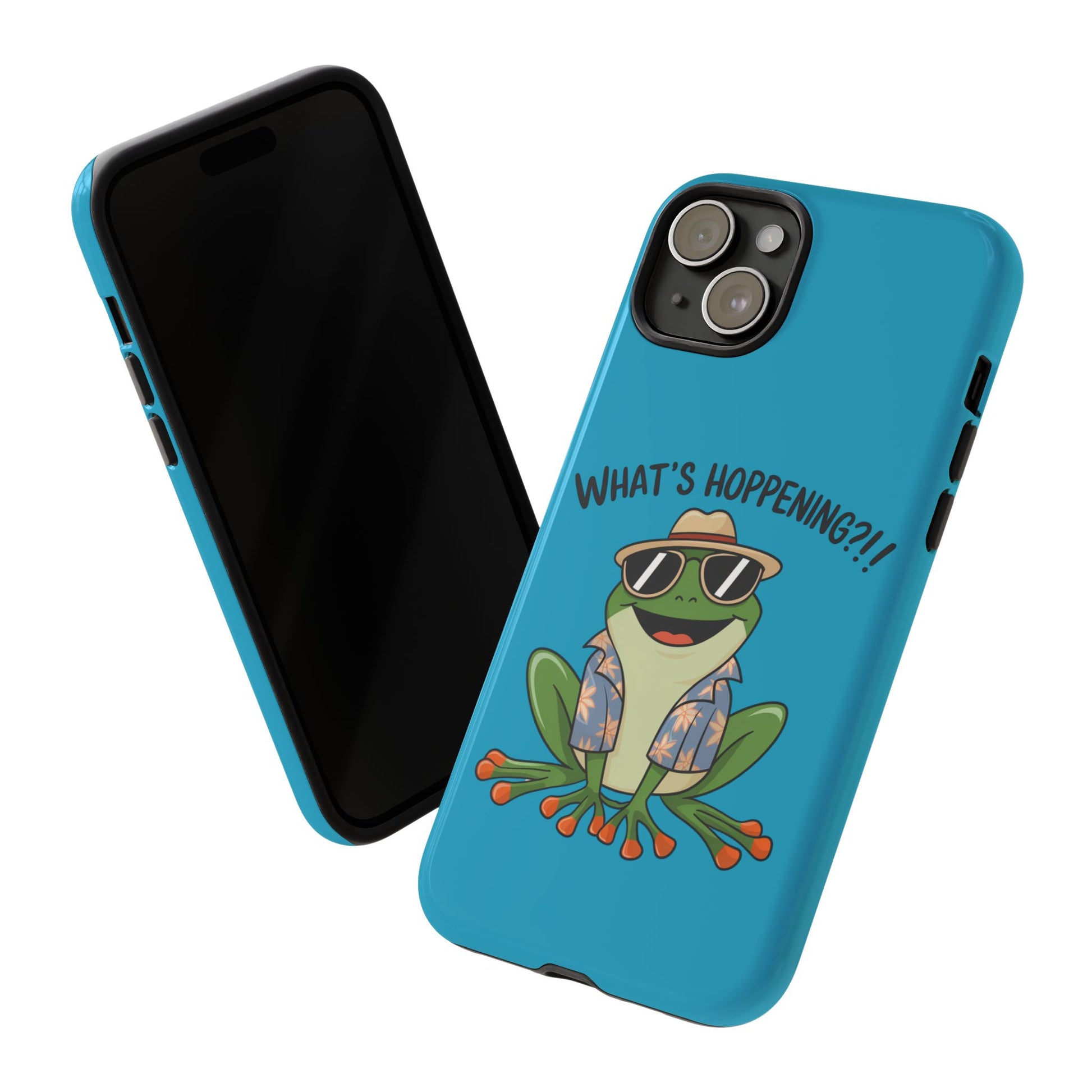A fun pun iPhone case featuring a frog with the phrase "What's Hoppening", giving off a playful and whimsical vibe. This phone case is perfect for adults who love cute and quirky designs. It is relevant for birthdays, Christmas, or everyday use.