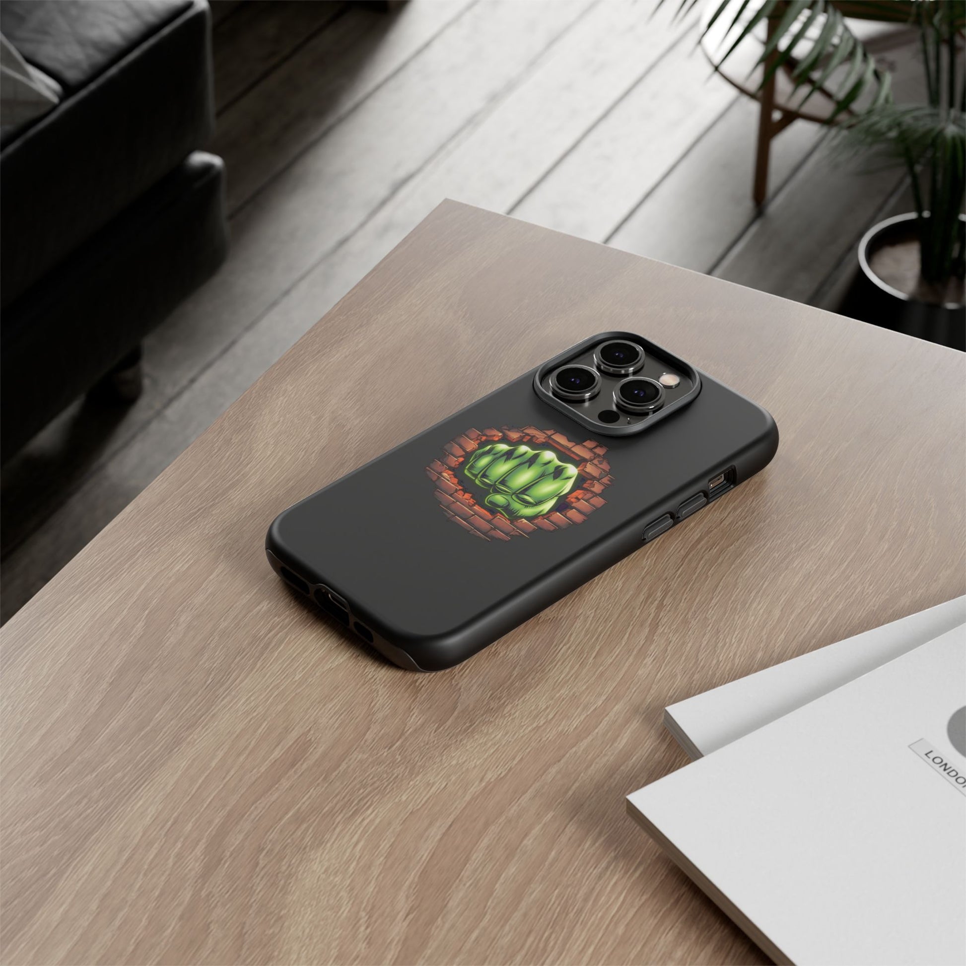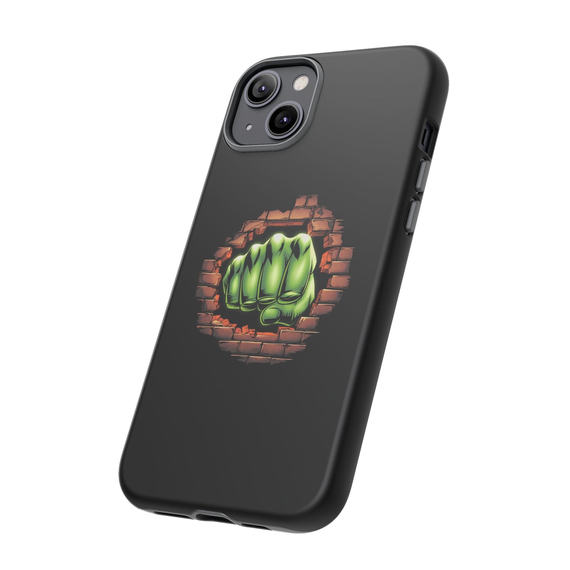 A fun iPhone case with the Green Fist smashing through a wall on it, giving off a bold and energetic vibe. This phone case is perfect for adults who love unique designs and want to protect their iPhone in style. Ideal for fans of action movies or comic books. Great for gifting on birthdays, Father's Day, or as a fun surprise for someone who enjoys quirky accessories.
