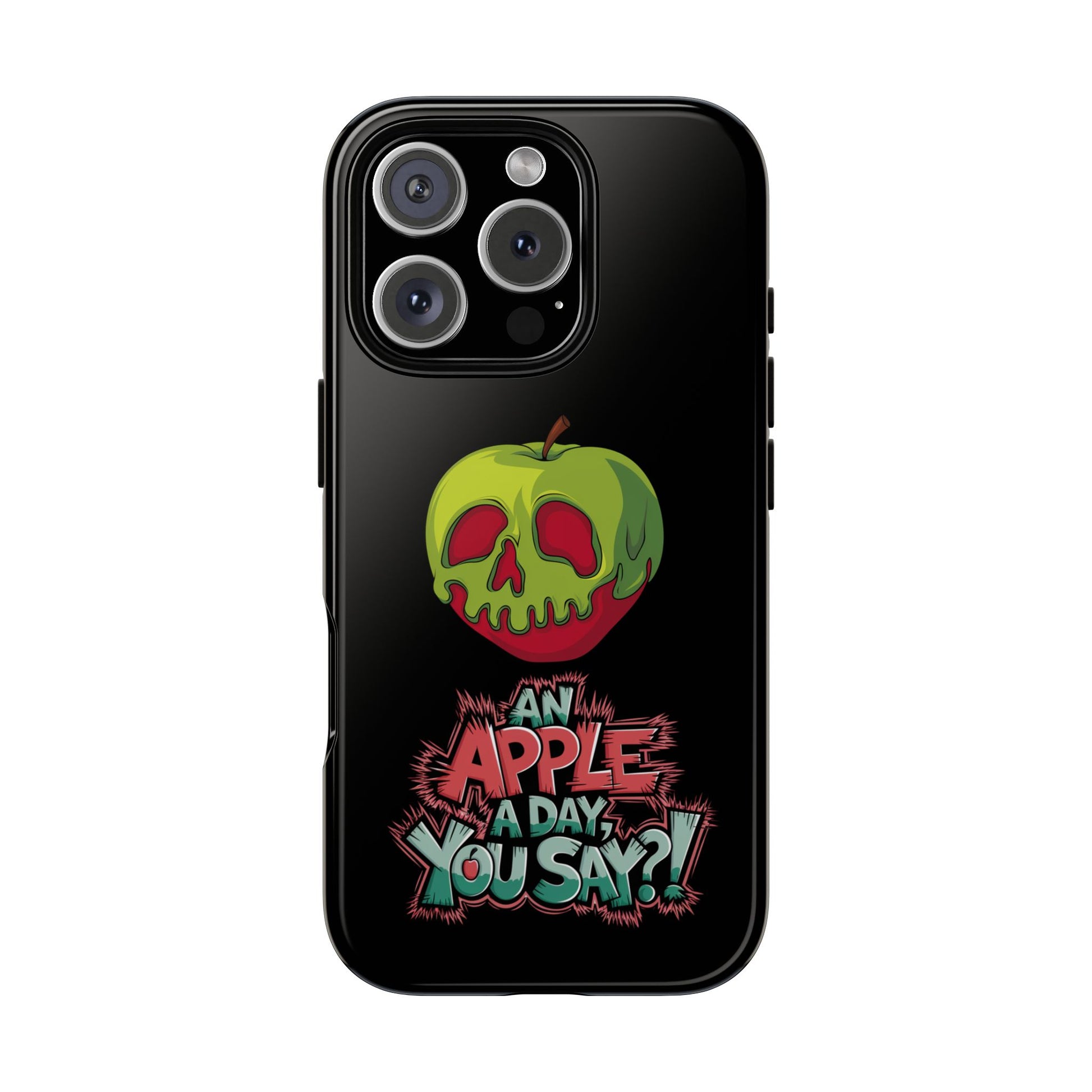 A fun iPhone case with a poison apple design stating "An Apple a Day You Say". This case gives a playful and whimsical vibe, perfect for those who enjoy unique and quirky accessories. Ideal for those who appreciate fun and statement pieces in their everyday life. Relevant for Halloween, poison apple enthusiasts, and those who appreciate dark humor.
