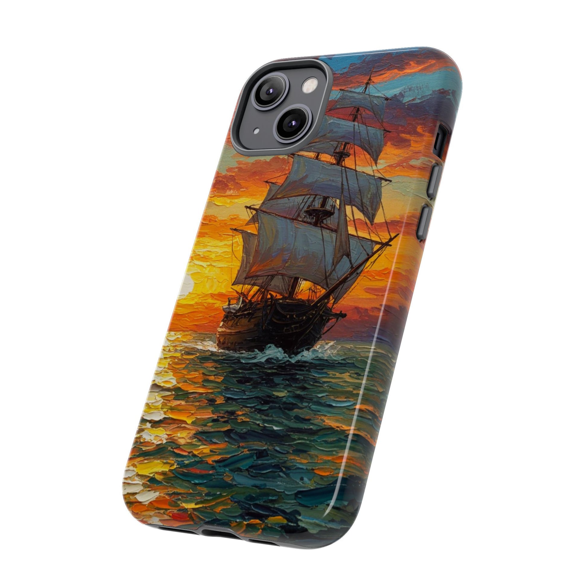 A fun iPhone case featuring a ship sailing at sunset, perfect for adding a touch of adventure to your phone. This case is ideal for adults looking to protect their device in style. Great for gifts during holidays like birthdays or Christmas.