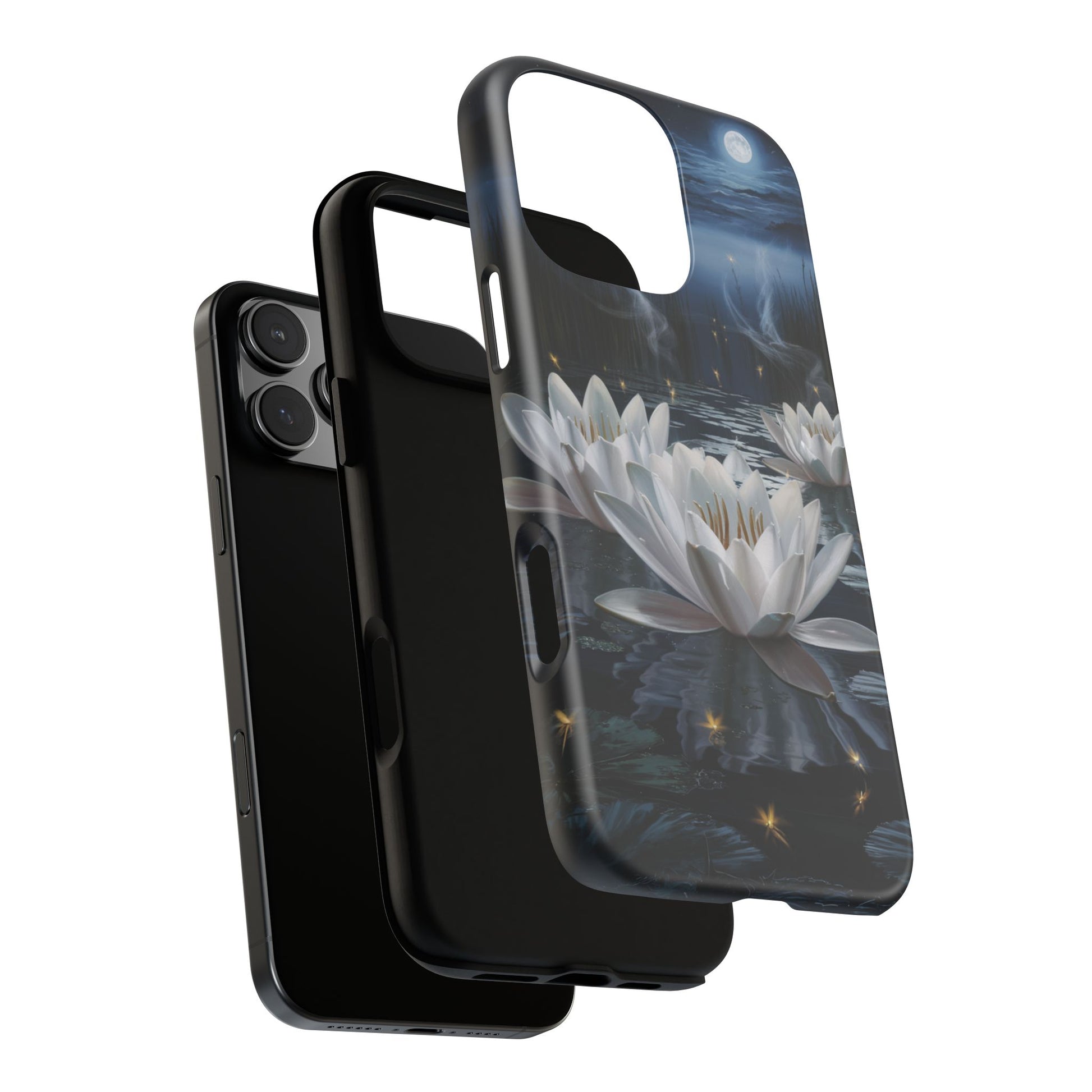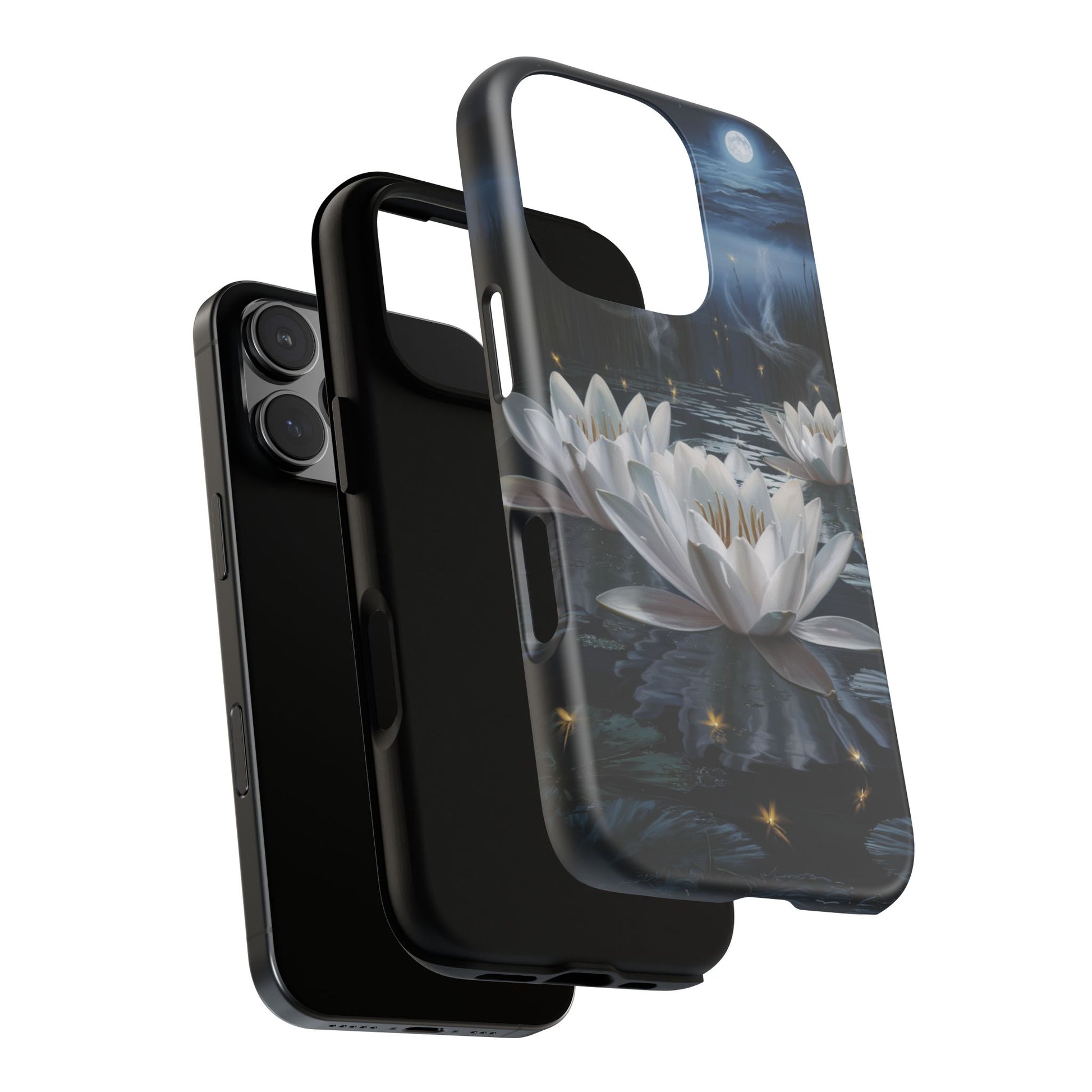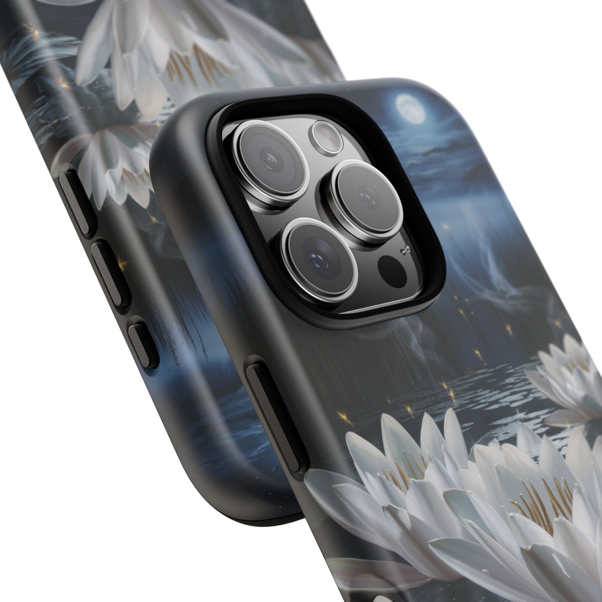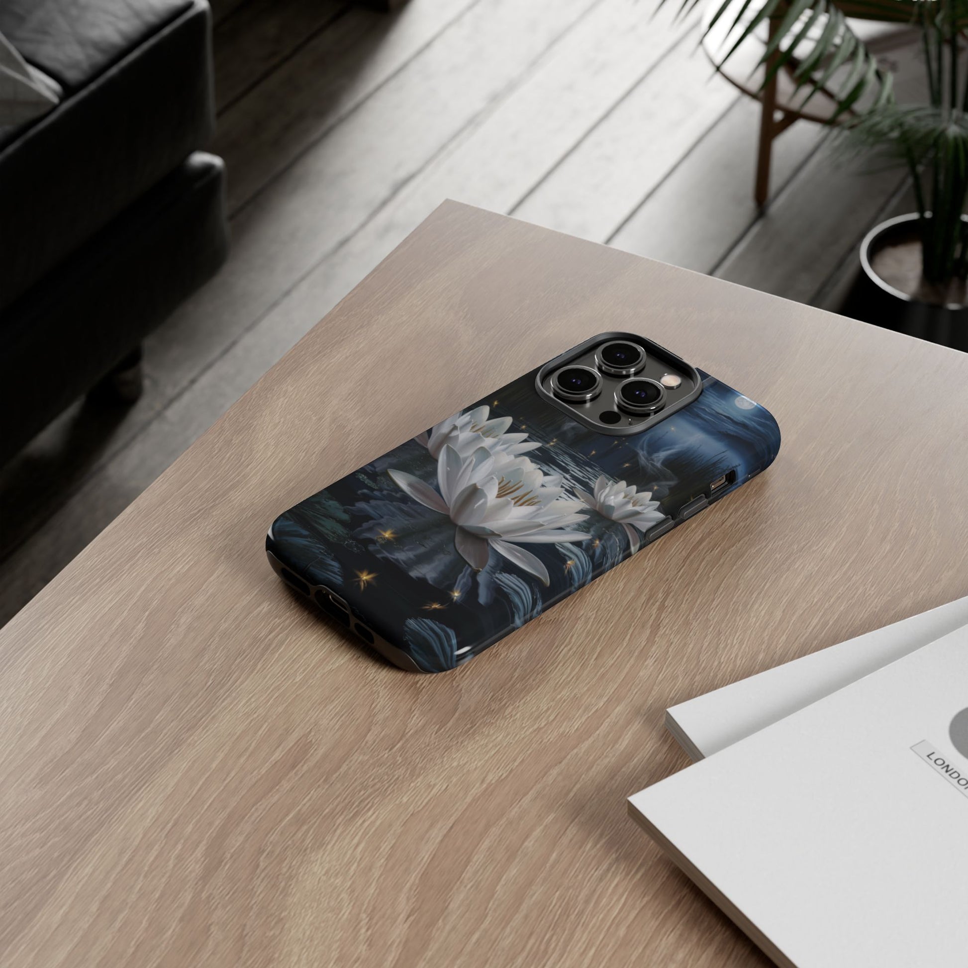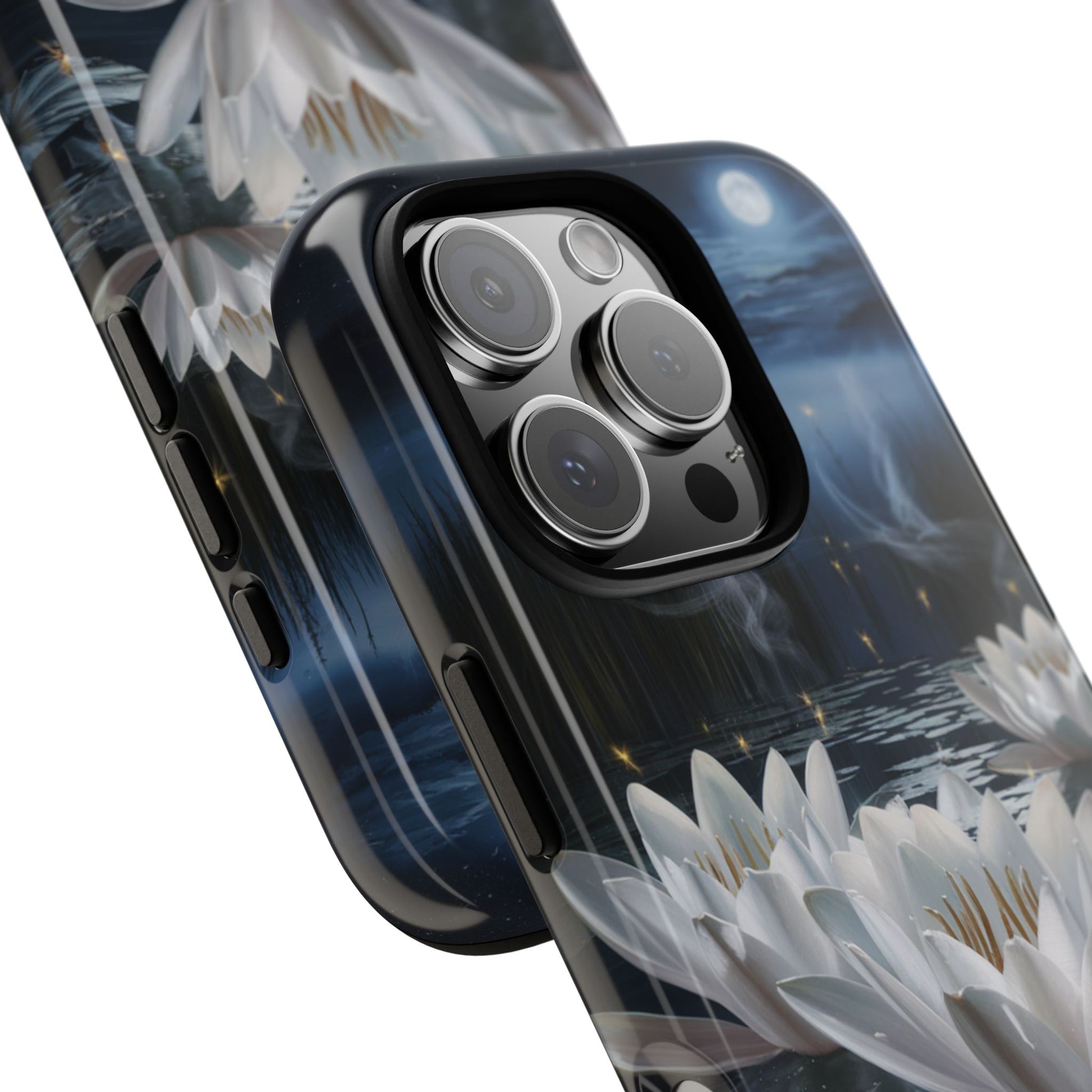 A fun iPhone case with beautiful Water Lilies shimmering under the moonlight. This phone case gives off a serene and charming vibe, perfect for nature lovers and those who appreciate peaceful moments. Ideal for personal use or as a gift for someone who enjoys the beauty of water lilies. Relevant for birthdays, Mother's Day, or any special occasion.