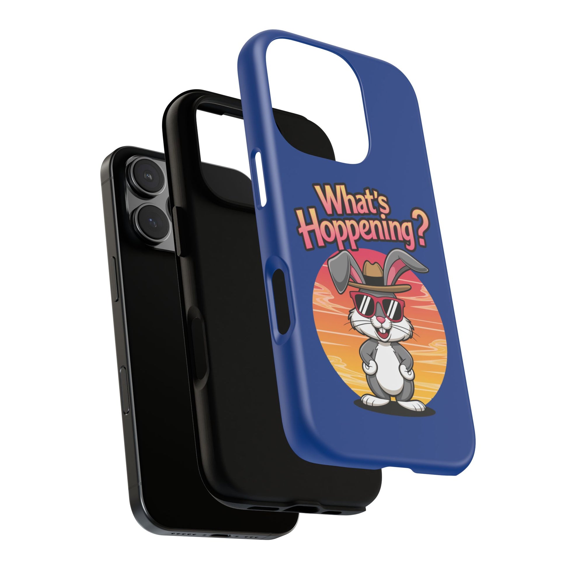 A fun iPhone case featuring a cool bunny design with the phrase 'What's Hoppening'. Perfect for adults looking to protect their phone with a touch of whimsical charm. Ideal for Easter, springtime, or bunny lovers.