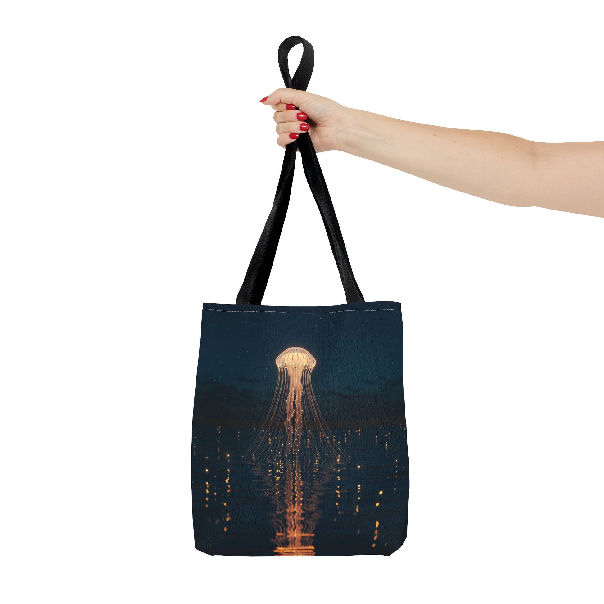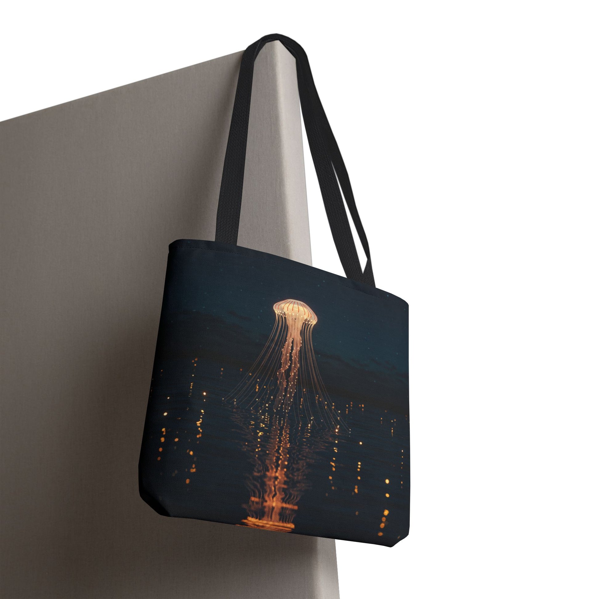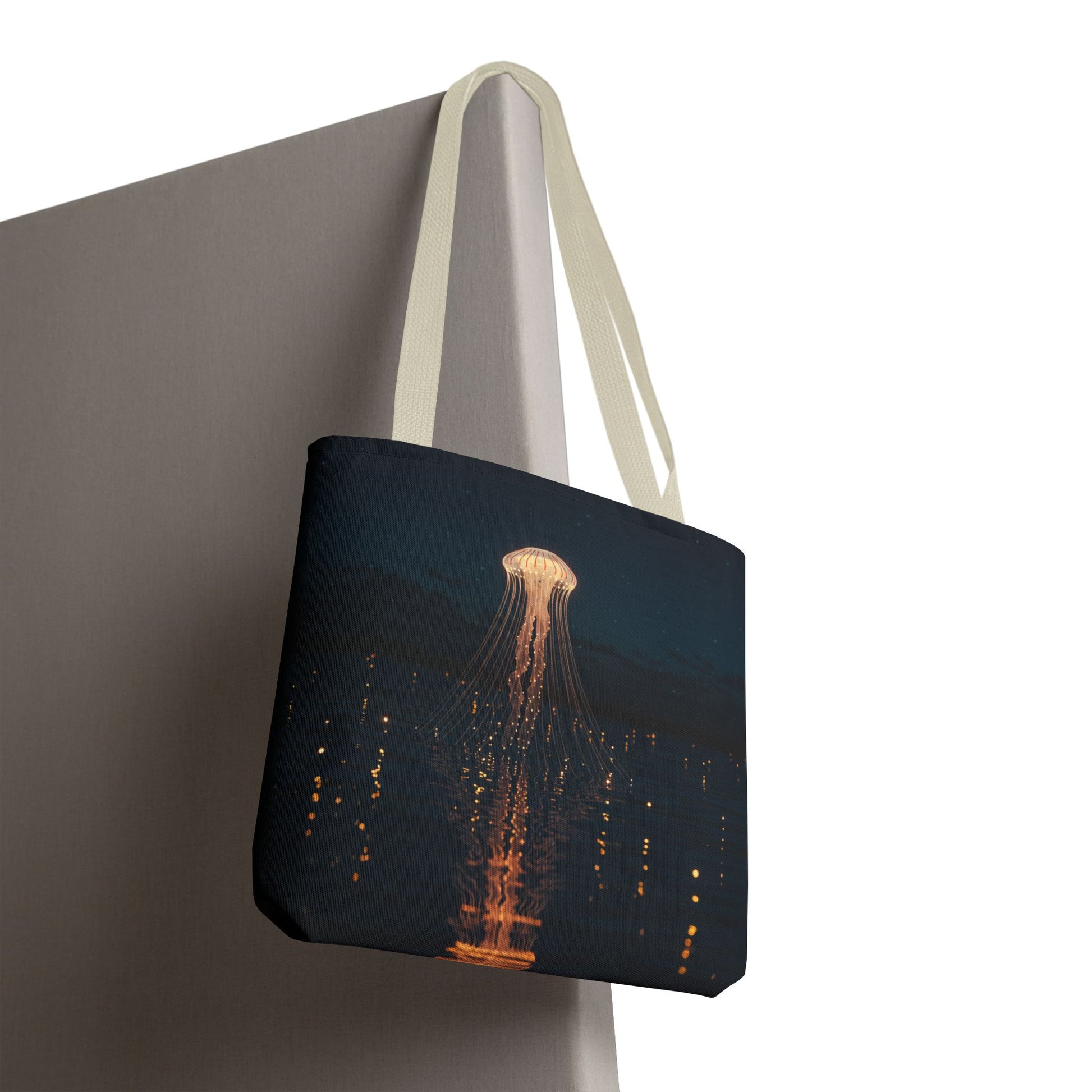 Make a statement with the Luminous Jellyfish Tote Bag, featuring a radiant jellyfish glowing softly over the water against a night sky. This captivating ocean-inspired design brings calm energy and ethereal style to your daily look. Perfect for beach days, errands, travel, or gifting to ocean lovers. Durable, spacious, and effortlessly chic — it’s where function meets artistry.