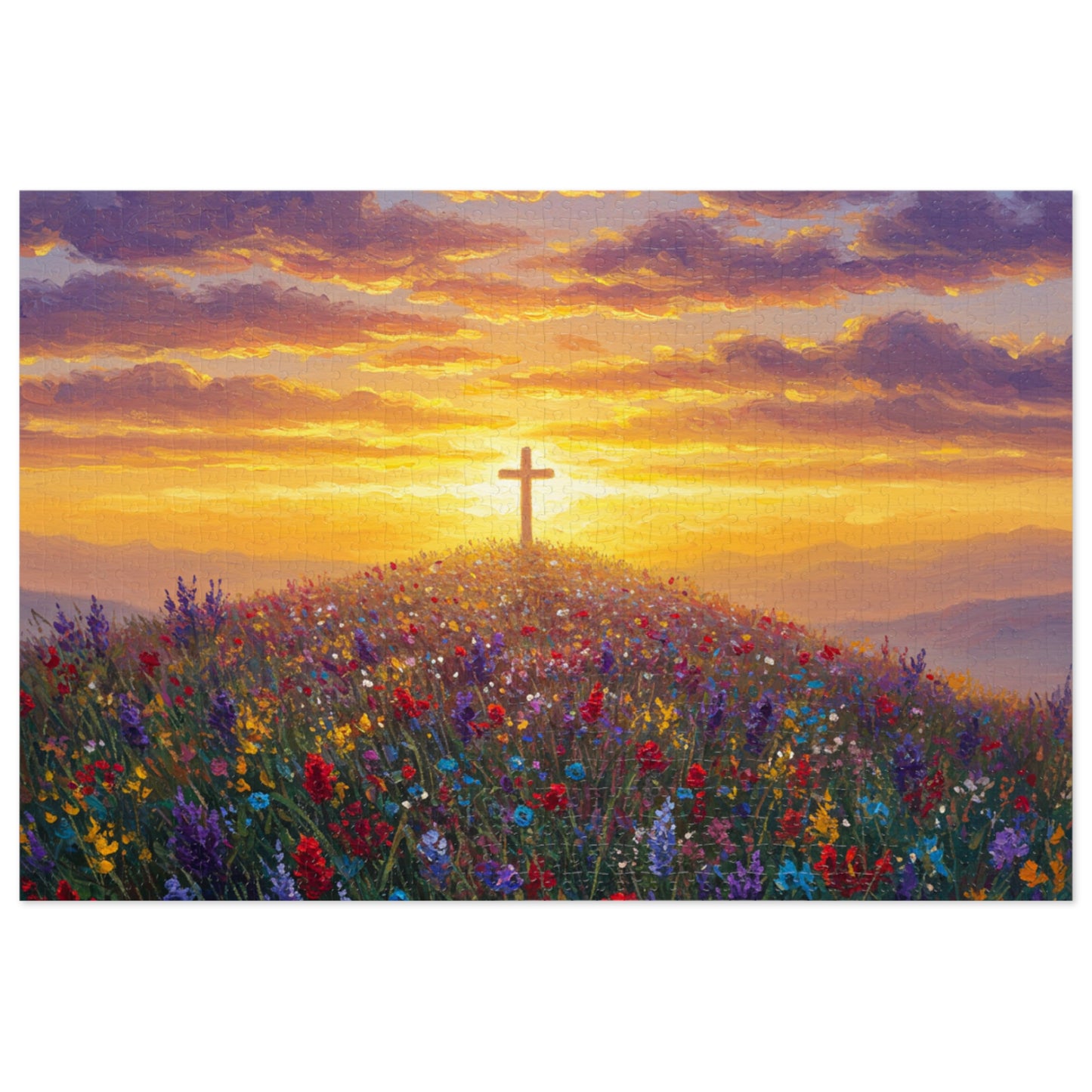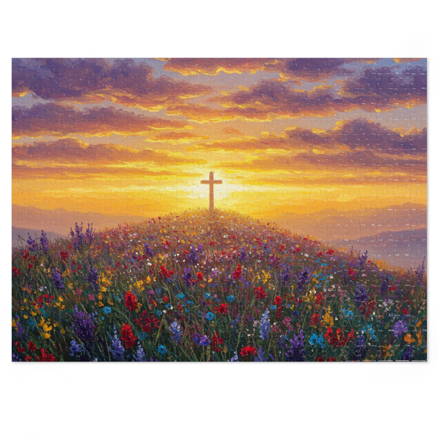 Jigsaw Puzzle: Cross on a Hill Monet Style Christian Game Cross Puzzle Inspirational Decor